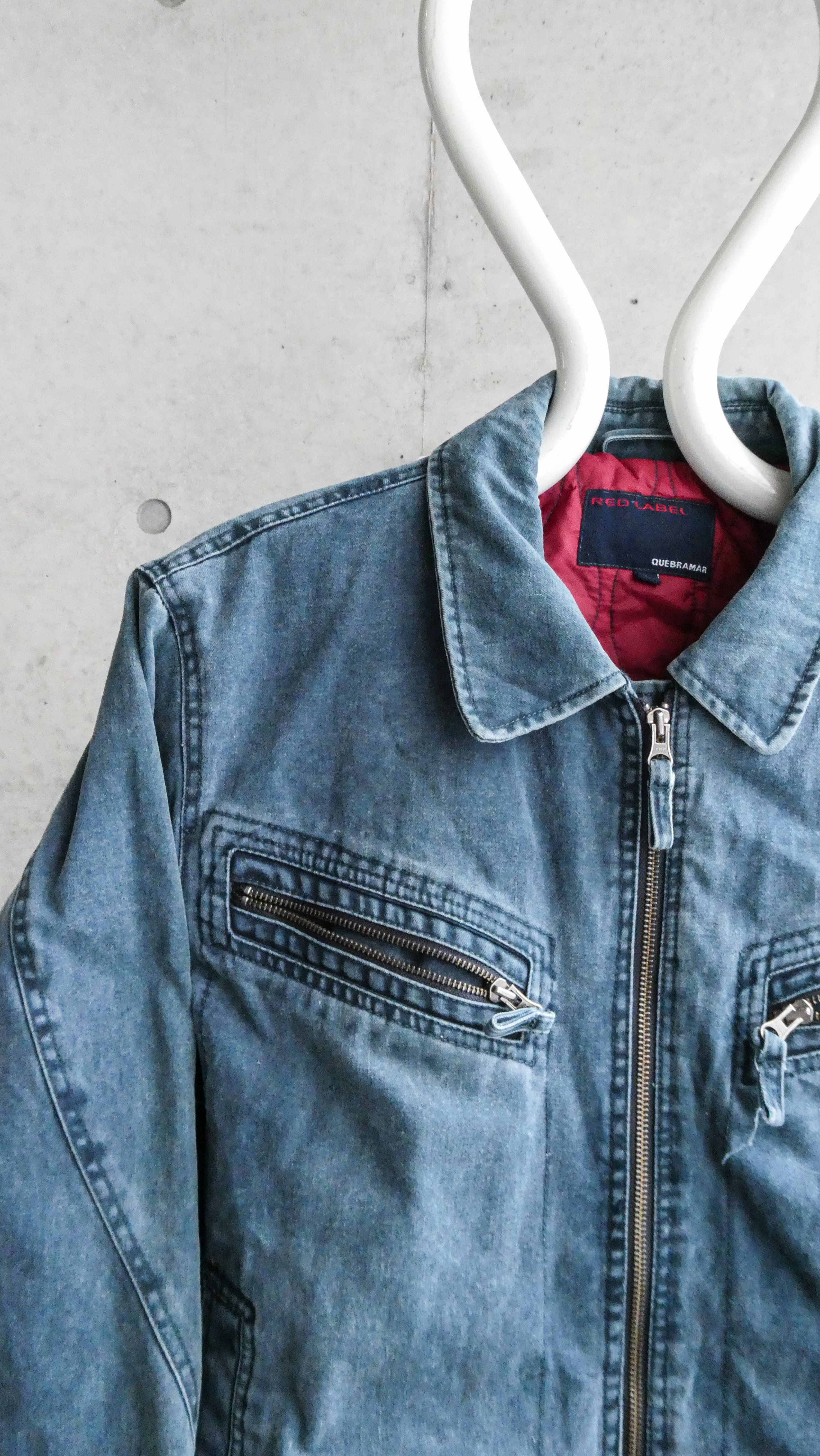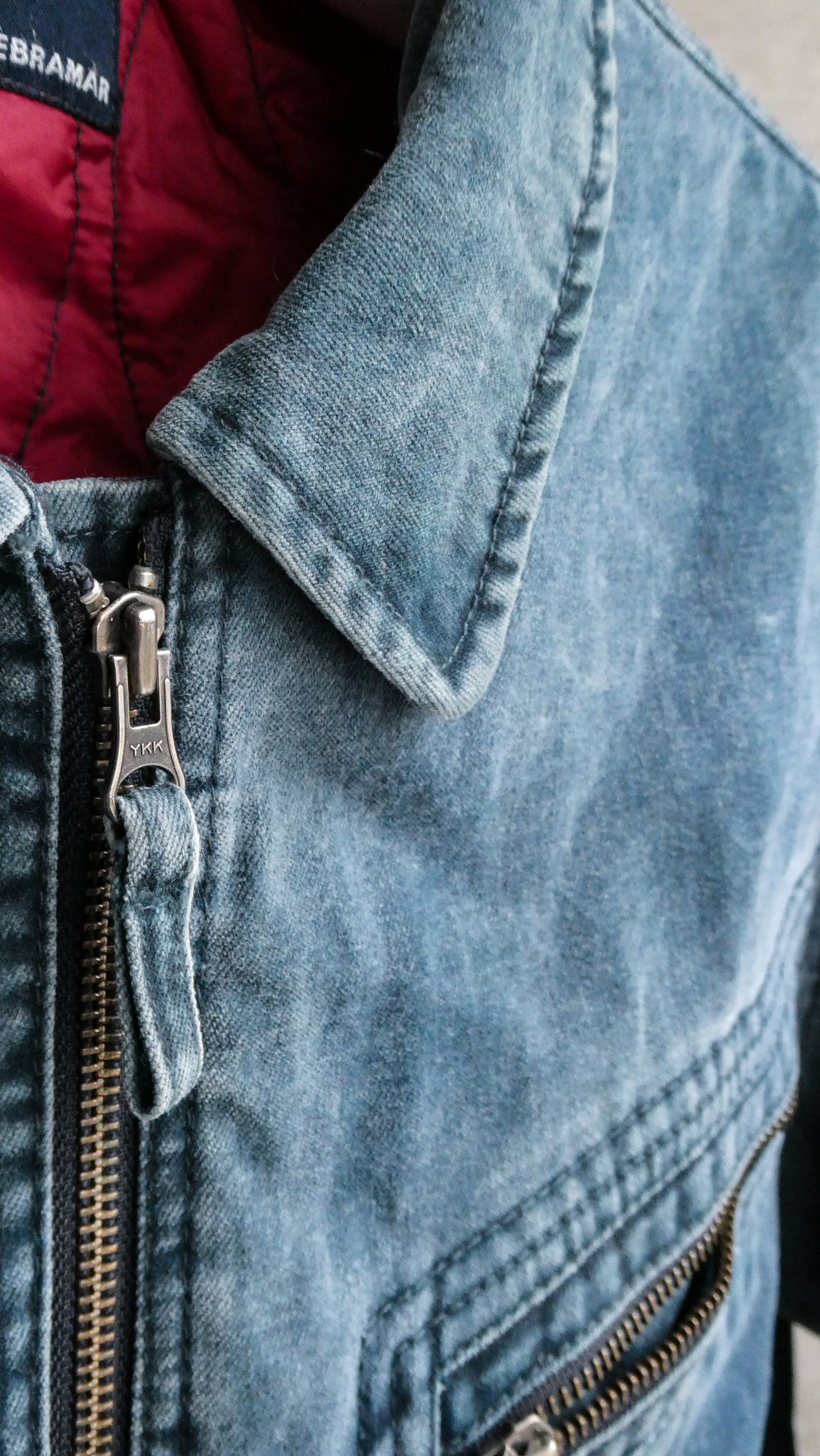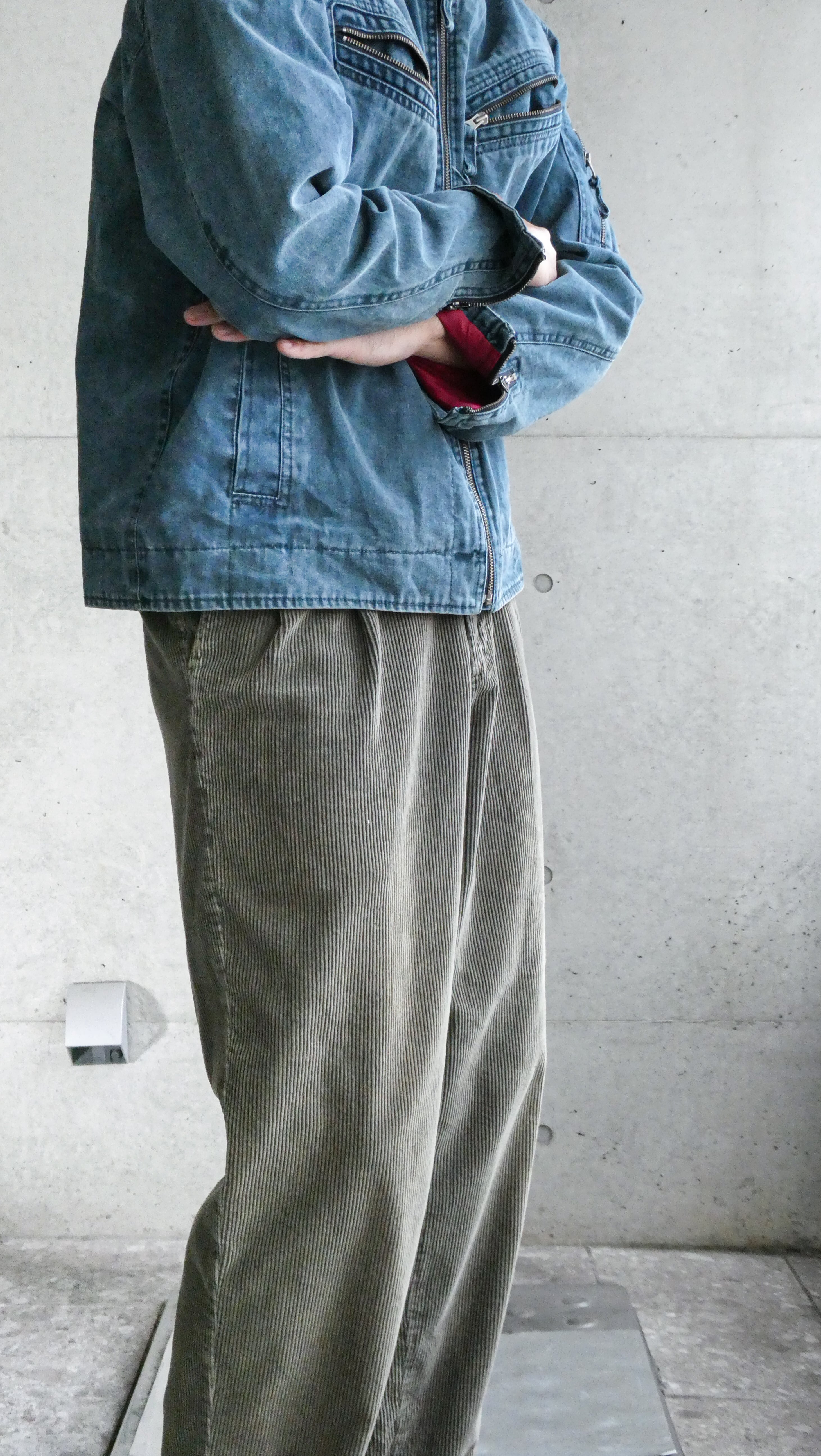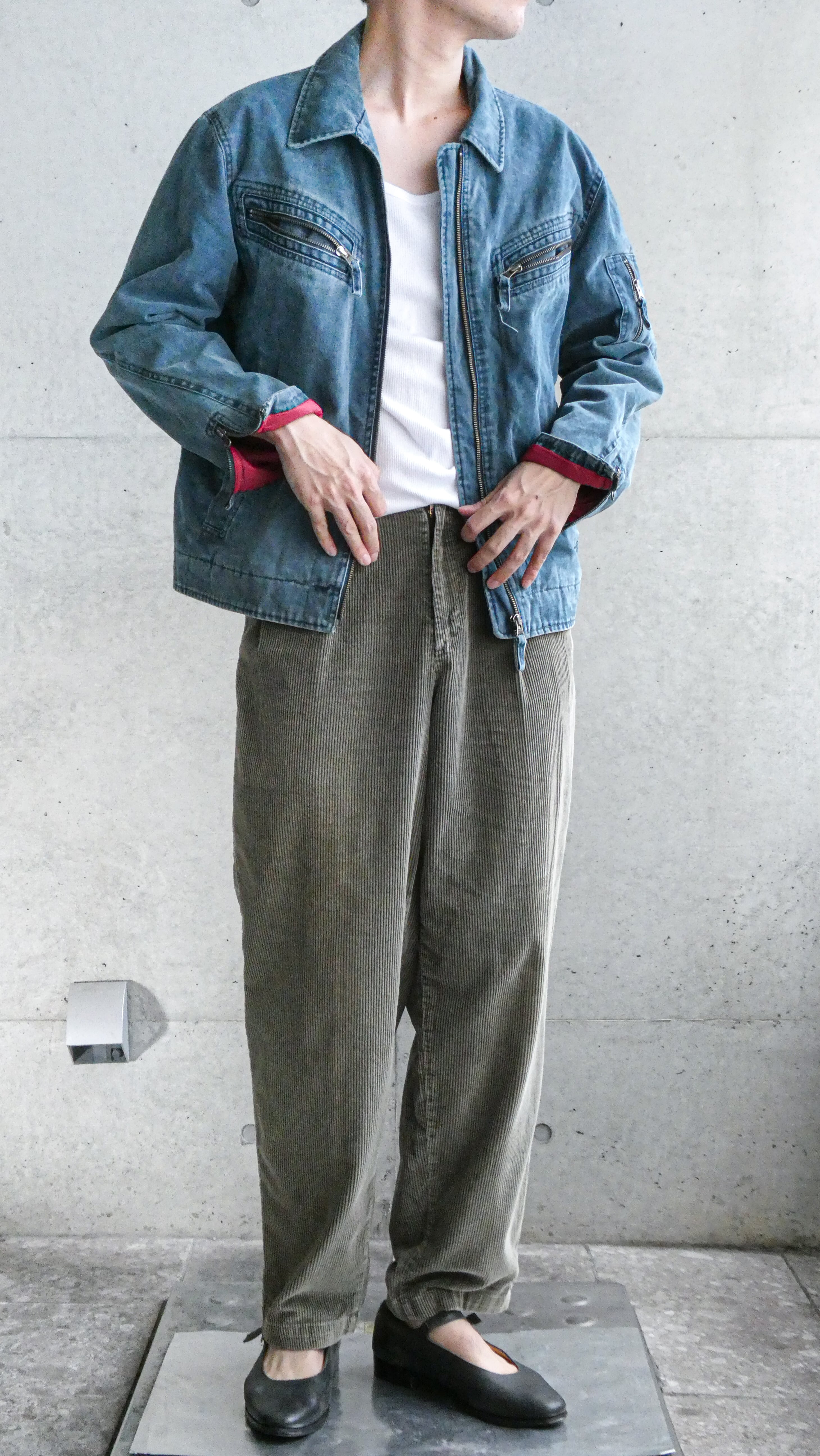 デニムっぽいインディゴブルーに後染めされたブルゾン。袖にポケット、袖先はジップで開閉可能のフライトジャケットのディテールです。短丈、袖長で今季っぽいシルエットです。