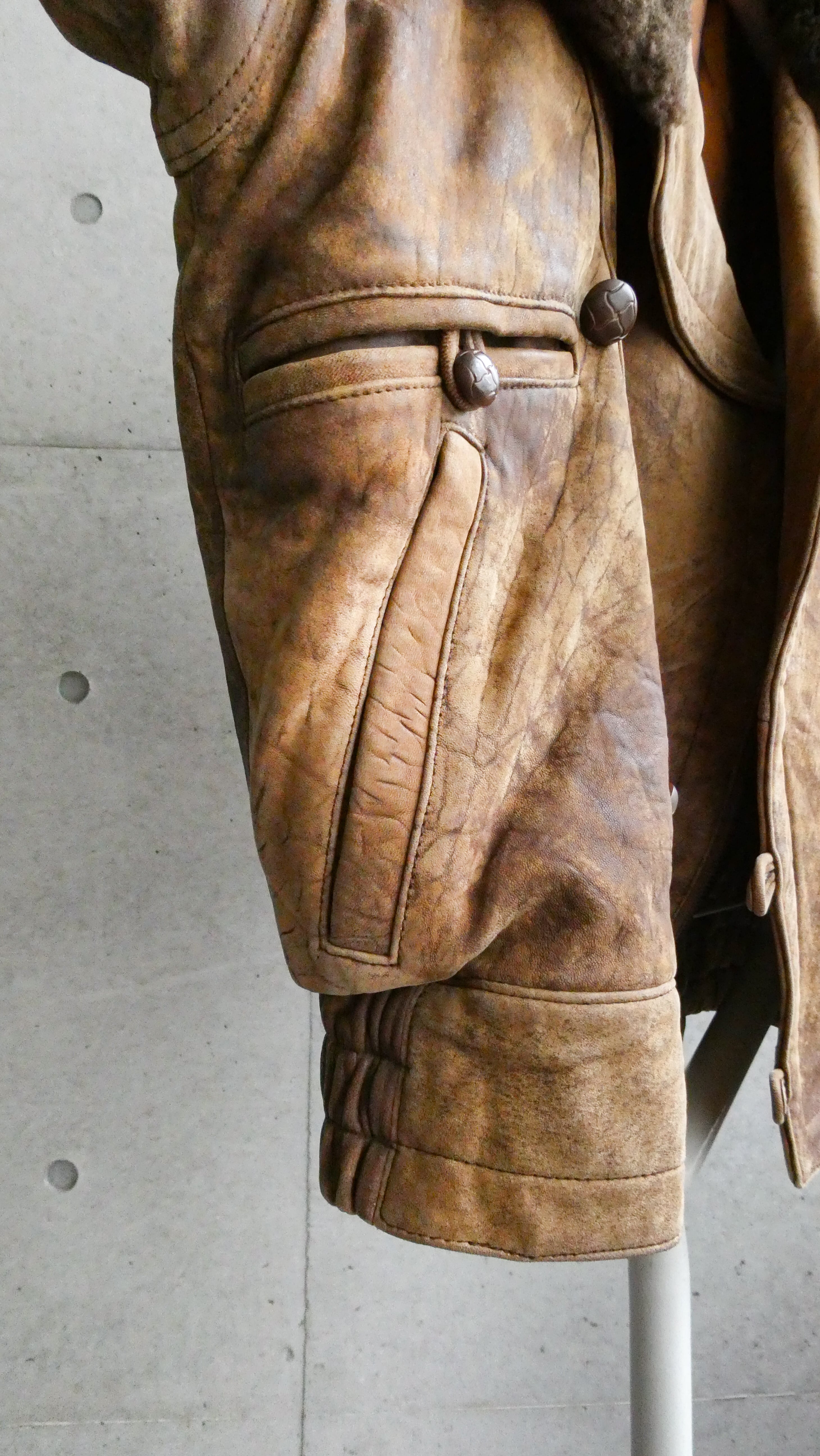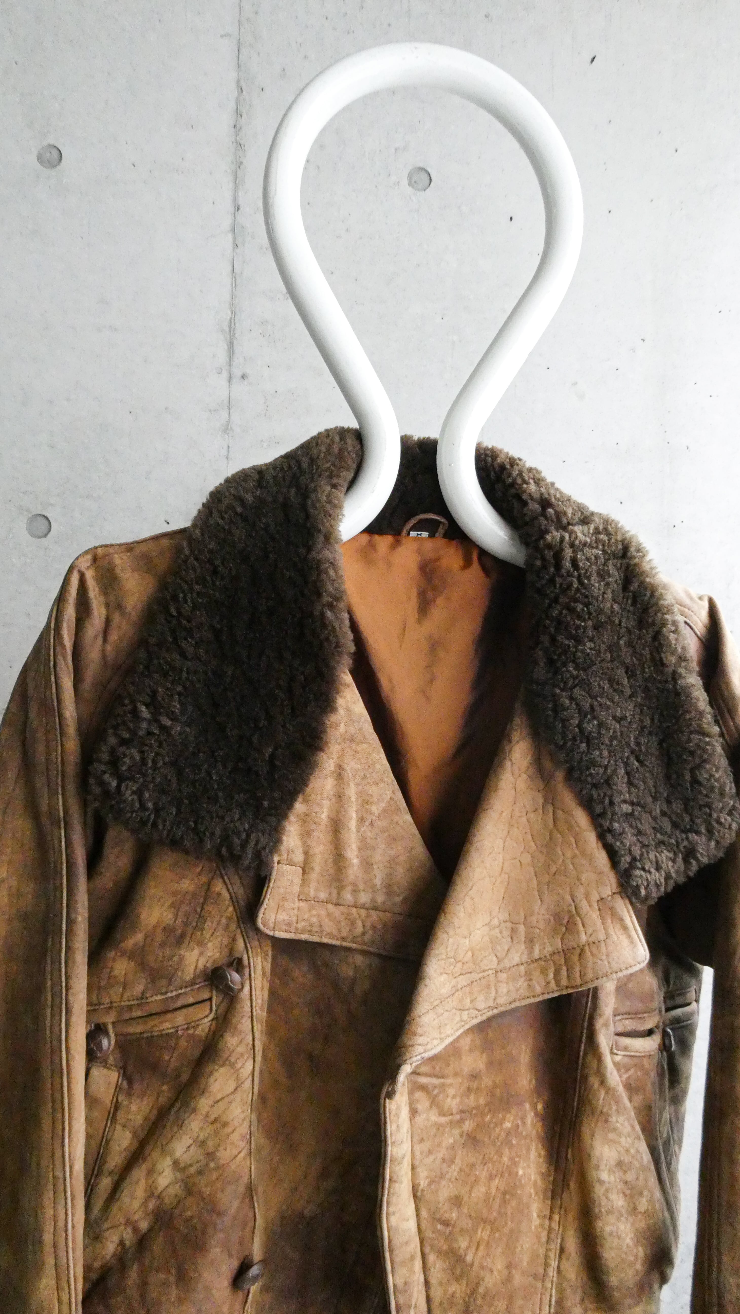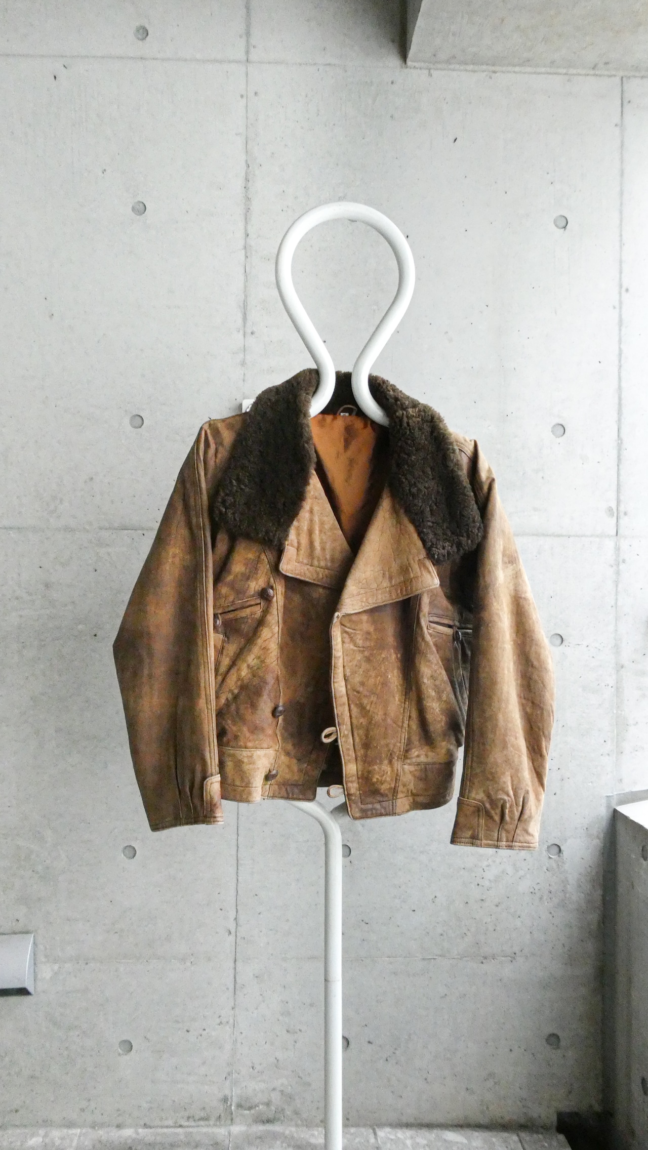 スペシャルレザー。ダメージ加工されたレザーに希少なムートン襟切替。今季当店イチオシのライダース型です。短丈なのも◎。シルエットも厳選してます。