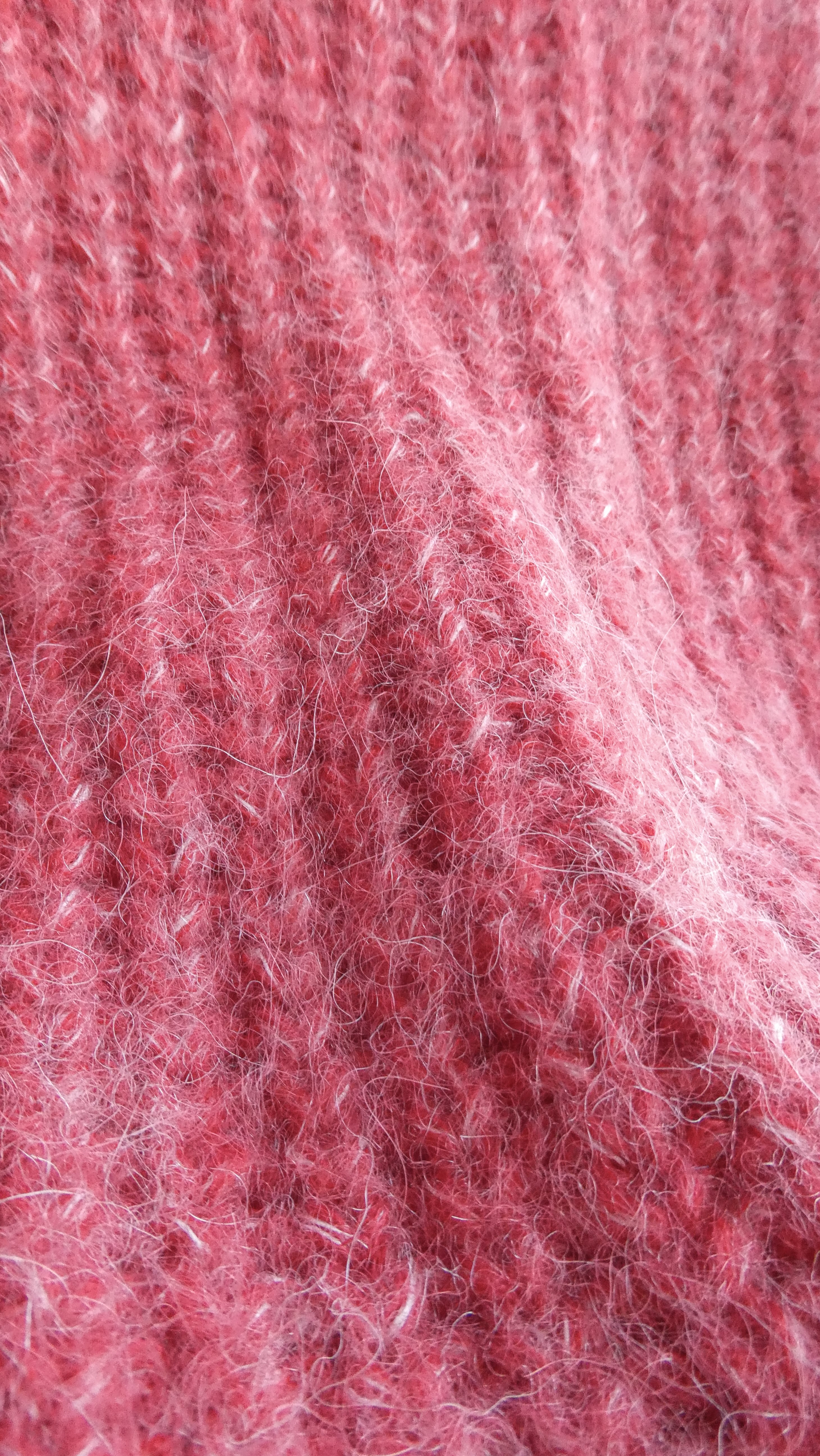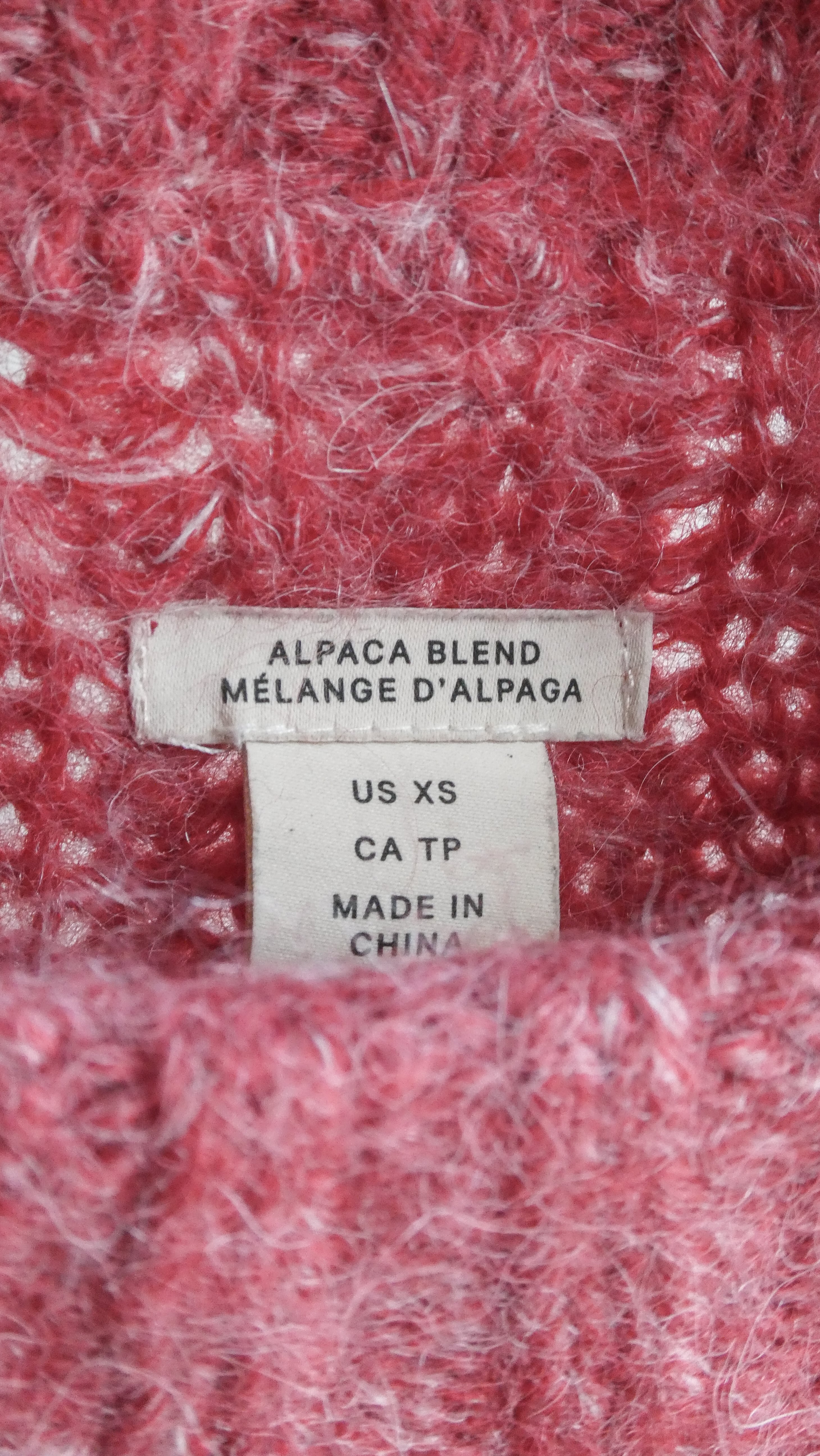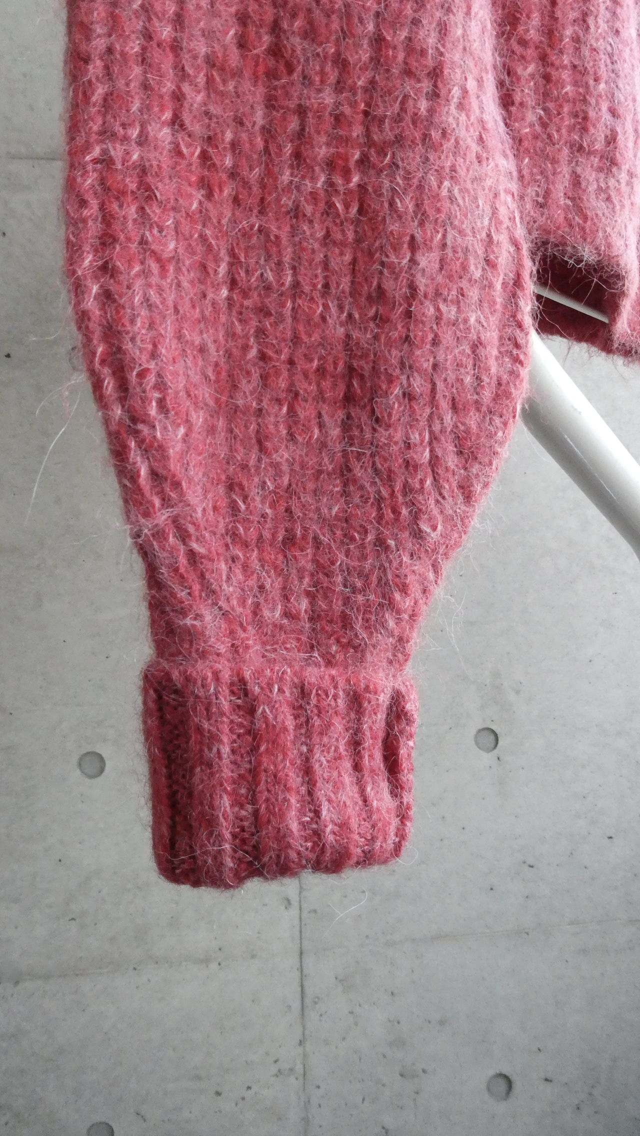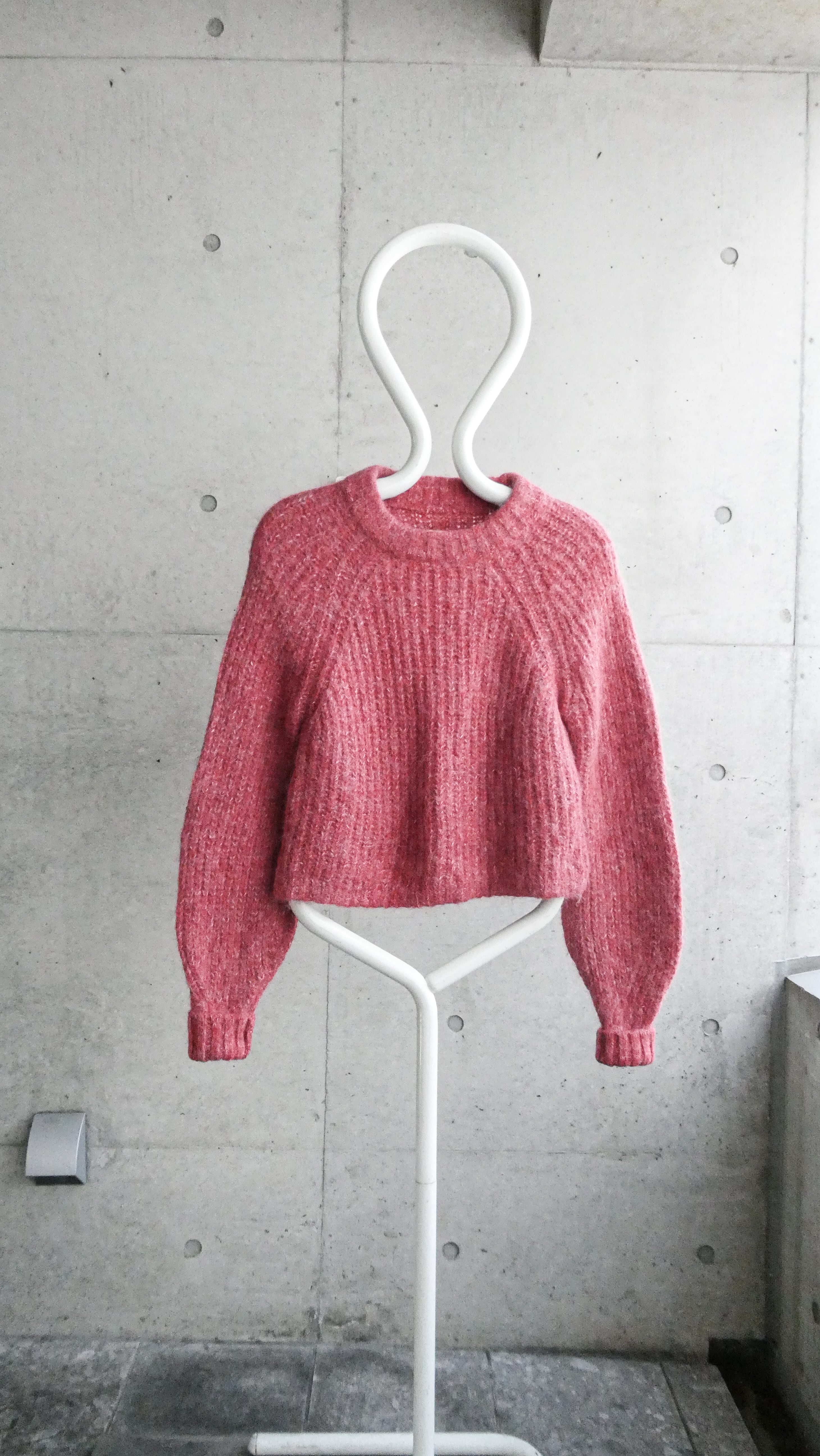 くすんだ薄い赤色のアルパカニット。ラグランスリーブ。今季気分なショート丈です。小柄なメンズ、レディース向けサイズです。