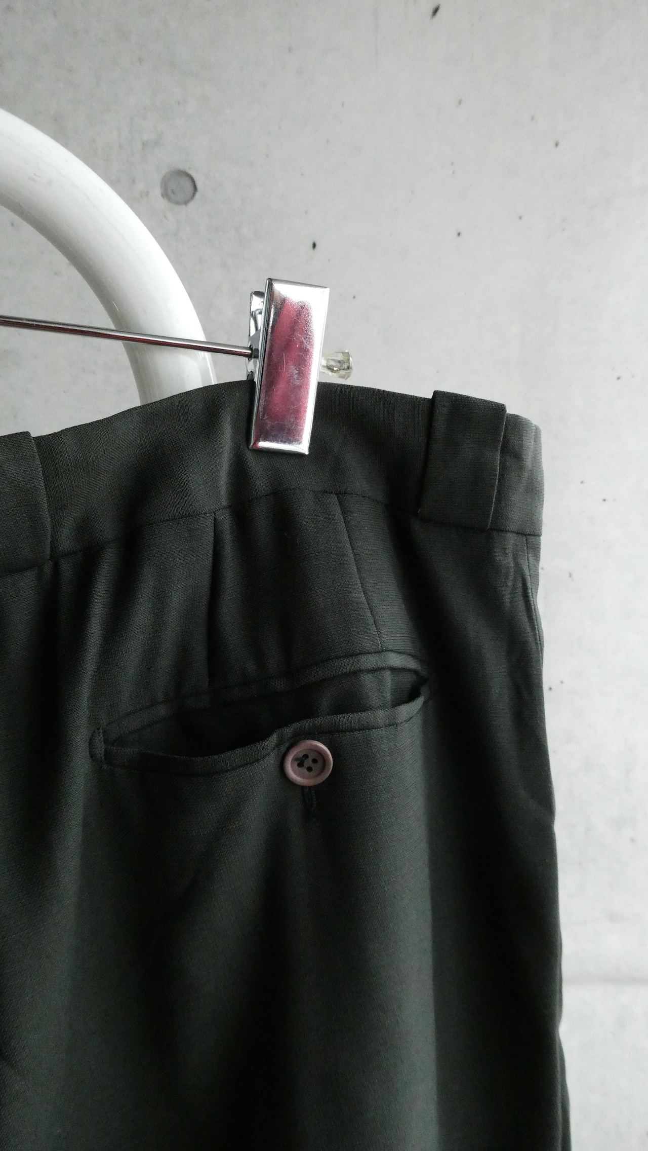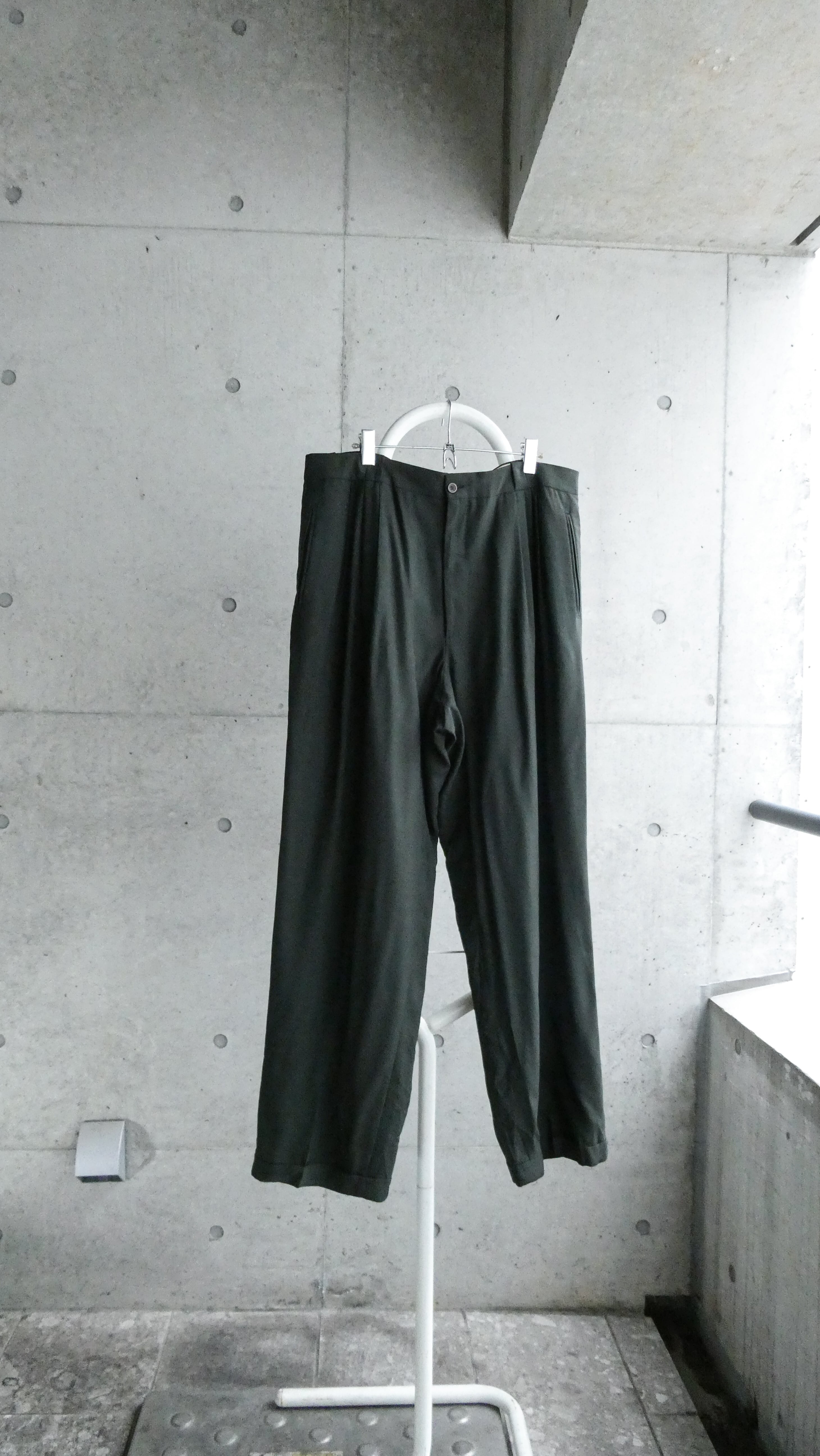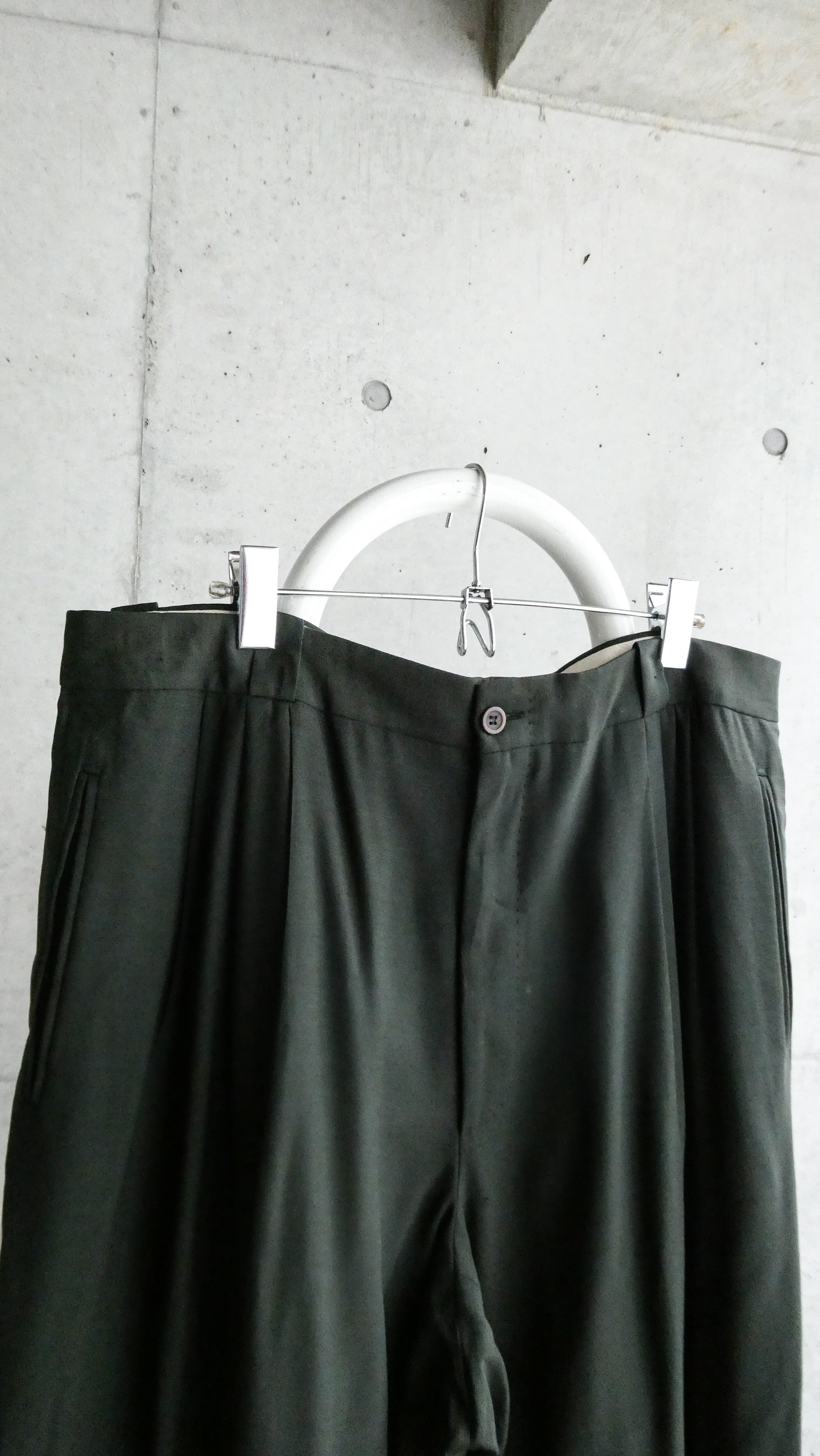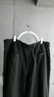 モス色。4タック入りのワイドシルエットのスラックスです。フロントジップはハンドステッチ仕様。細かいですが、洋服好きな人が見たらわかるいいスラックスです。スタイリングの幅広がるスラックスです。