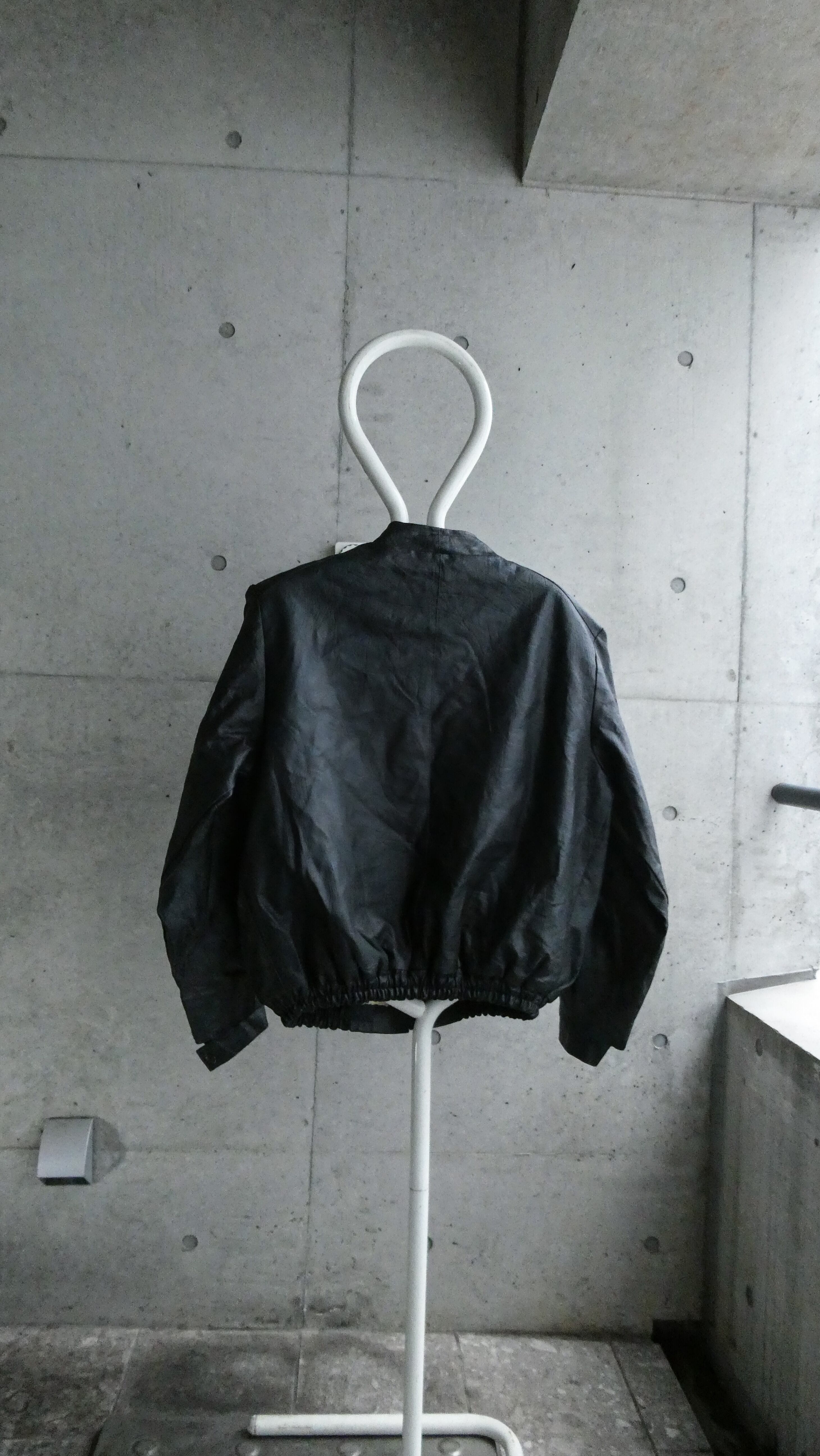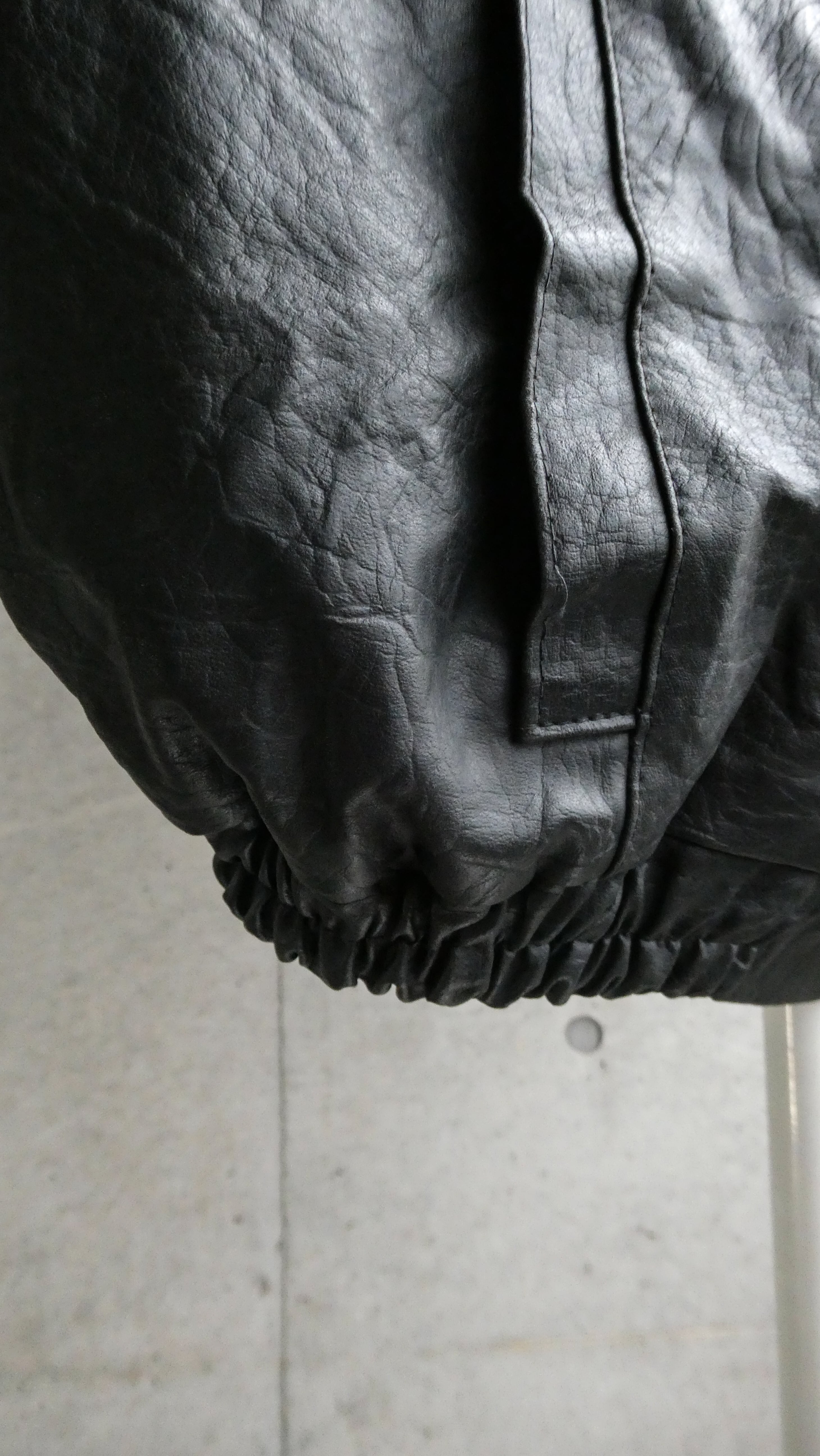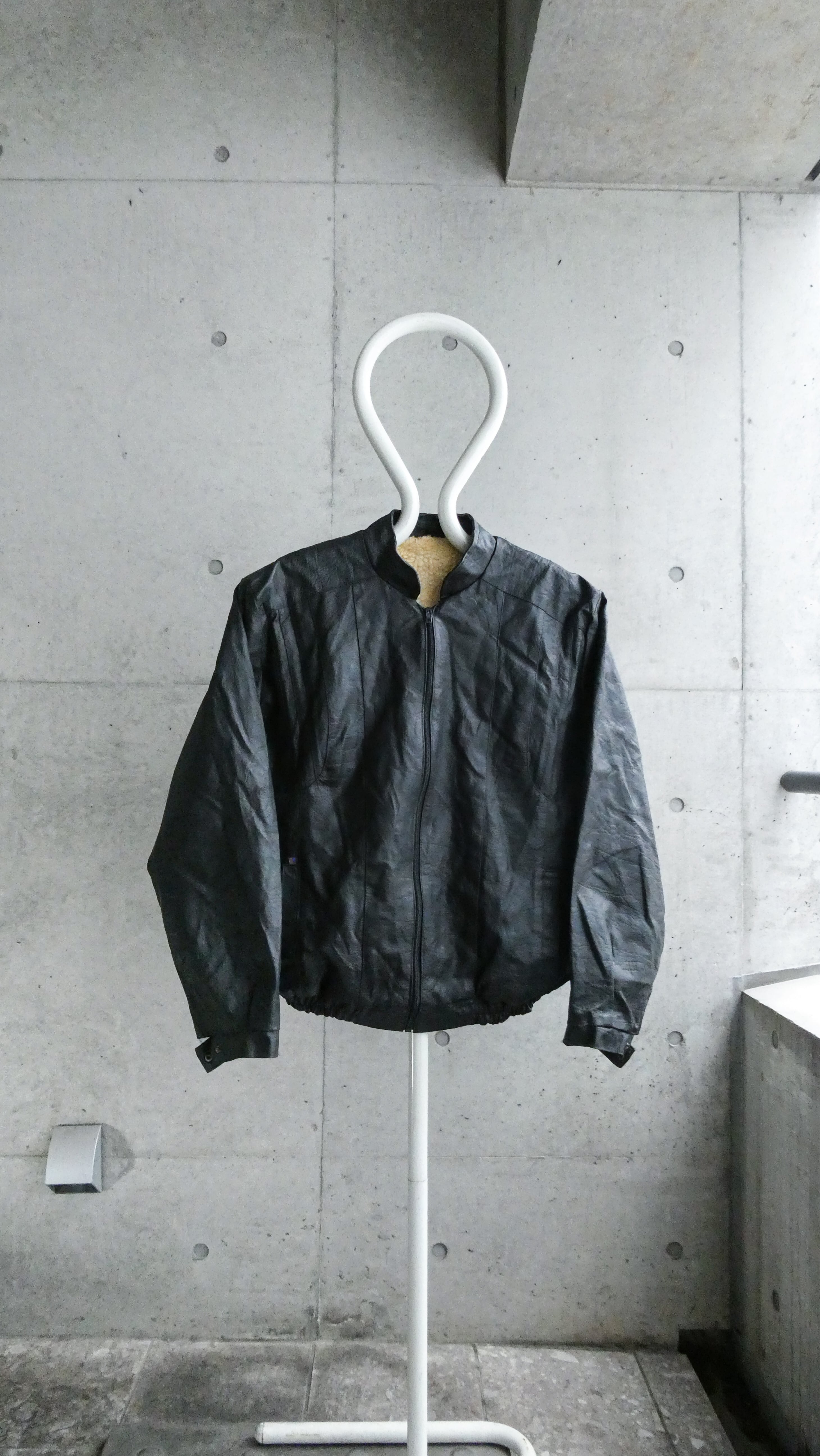 ブラックのレザーブルゾン。裾にリブが効いてて、今っぽい短丈のシルエット。特徴は型押しのレザー。しっとりして革質も柔らかいです。スタンドカラーで、着ると首元に抜け感出る希少なレザーです。