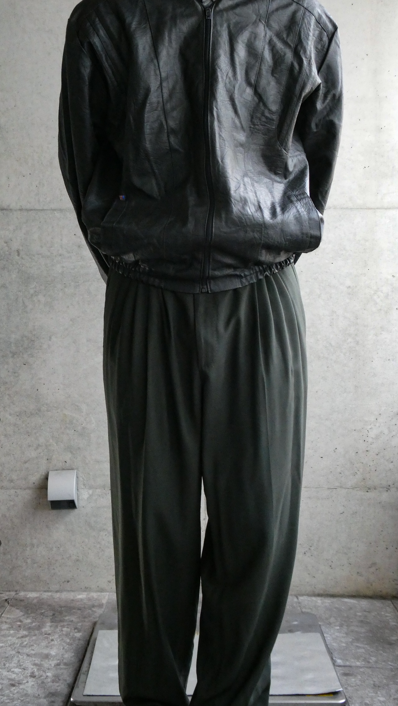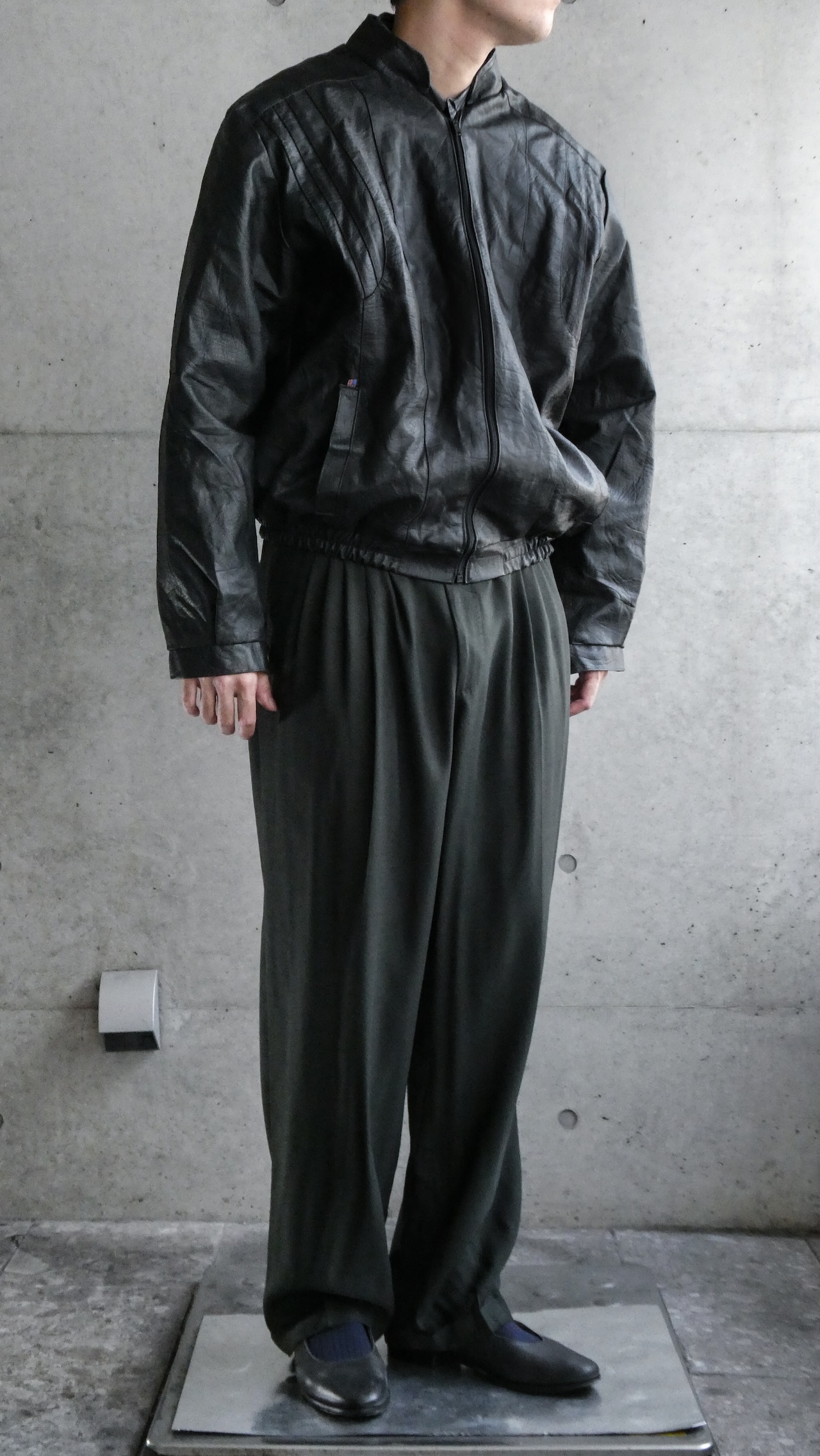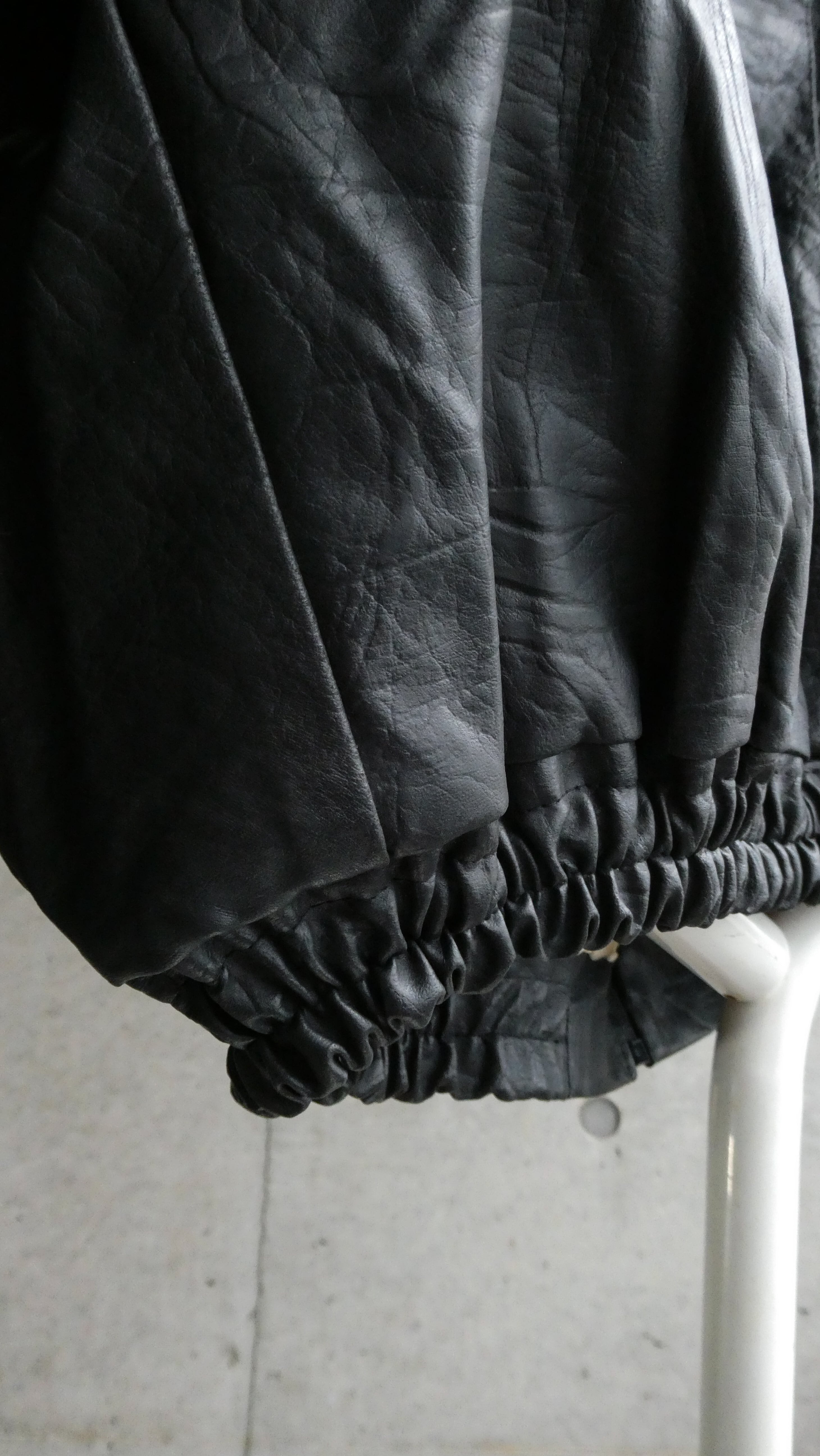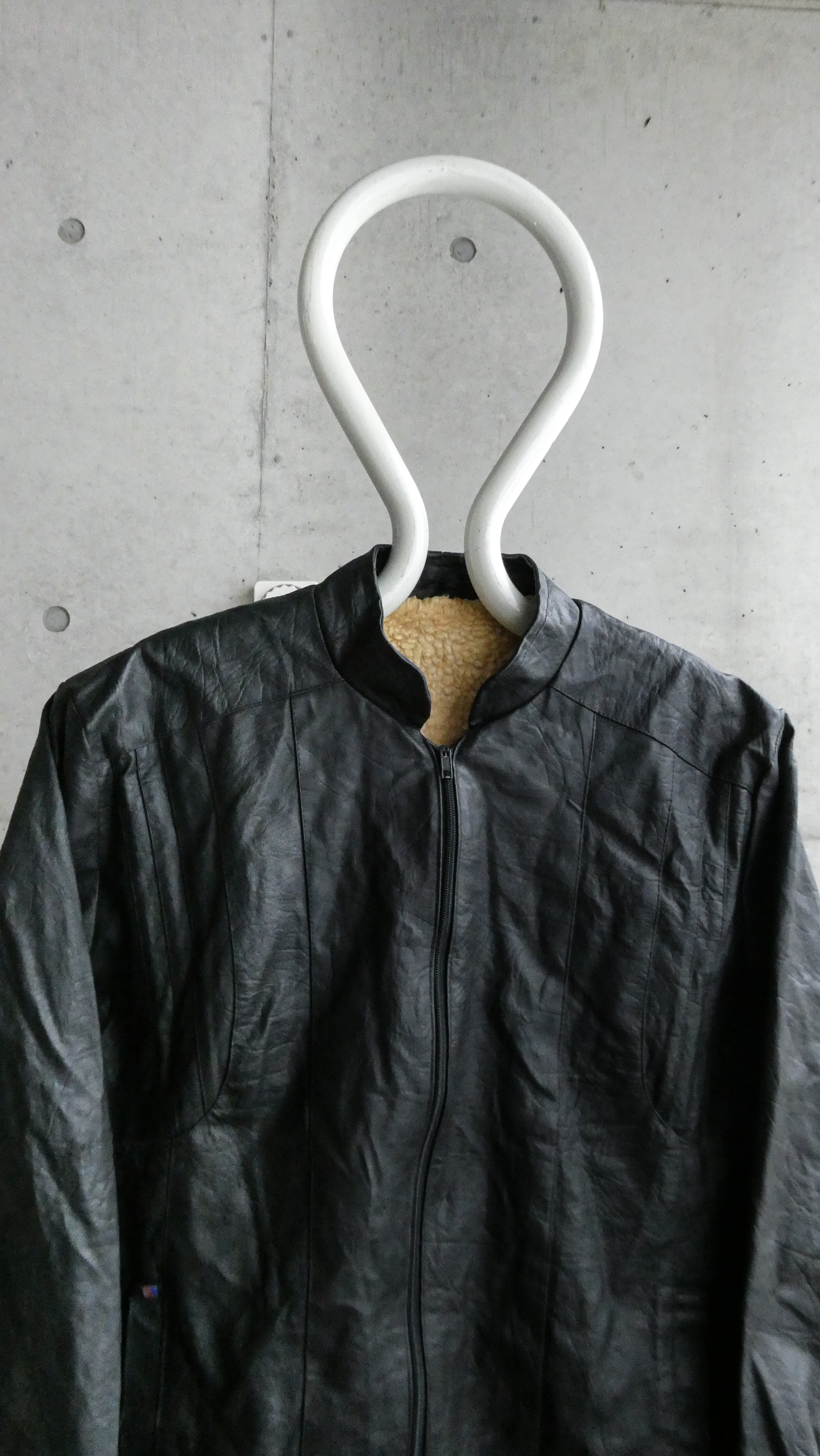 ブラックのレザーブルゾン。裾にリブが効いてて、今っぽい短丈のシルエット。特徴は型押しのレザー。しっとりして革質も柔らかいです。スタンドカラーで、着ると首元に抜け感出る希少なレザーです。