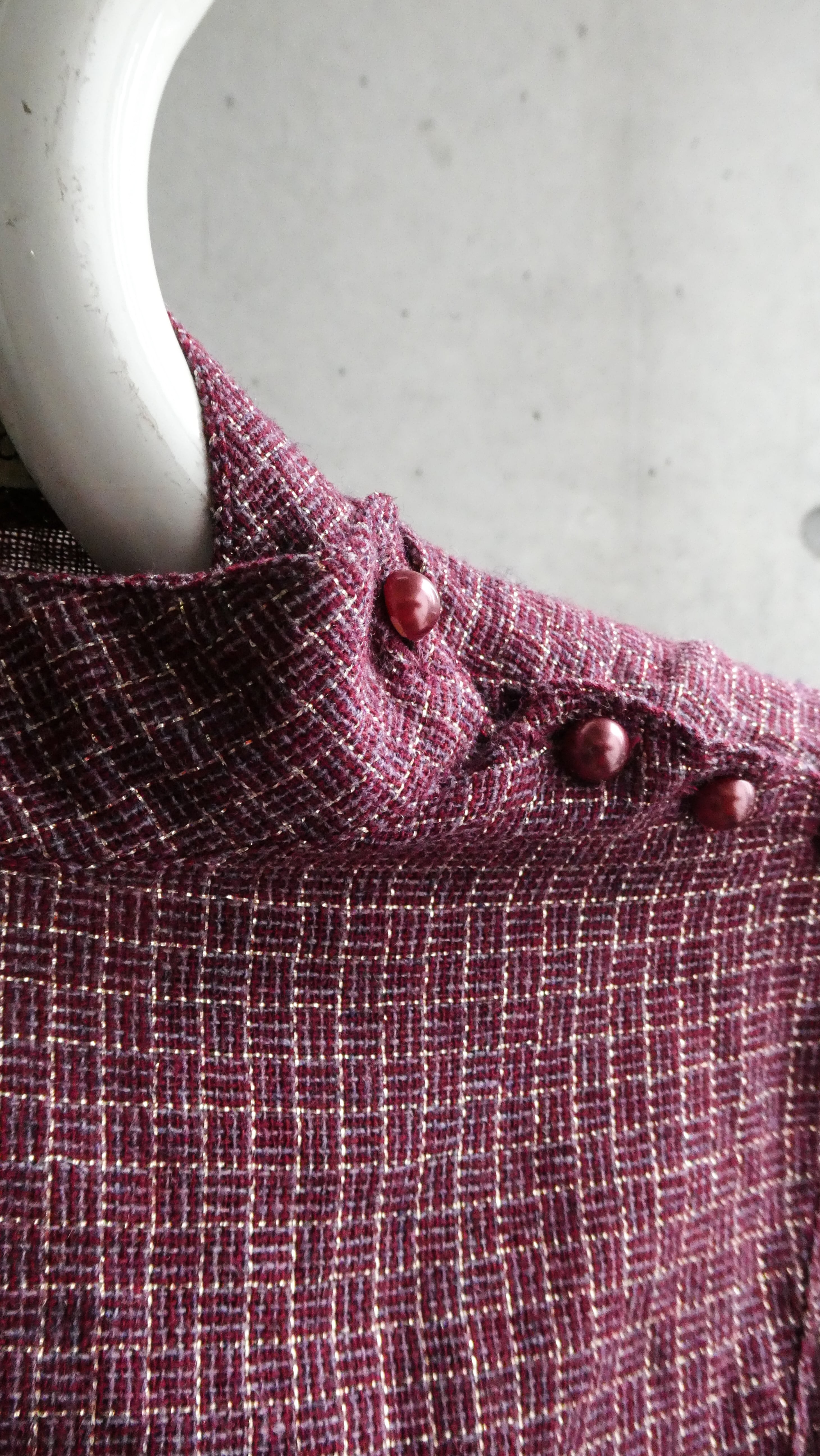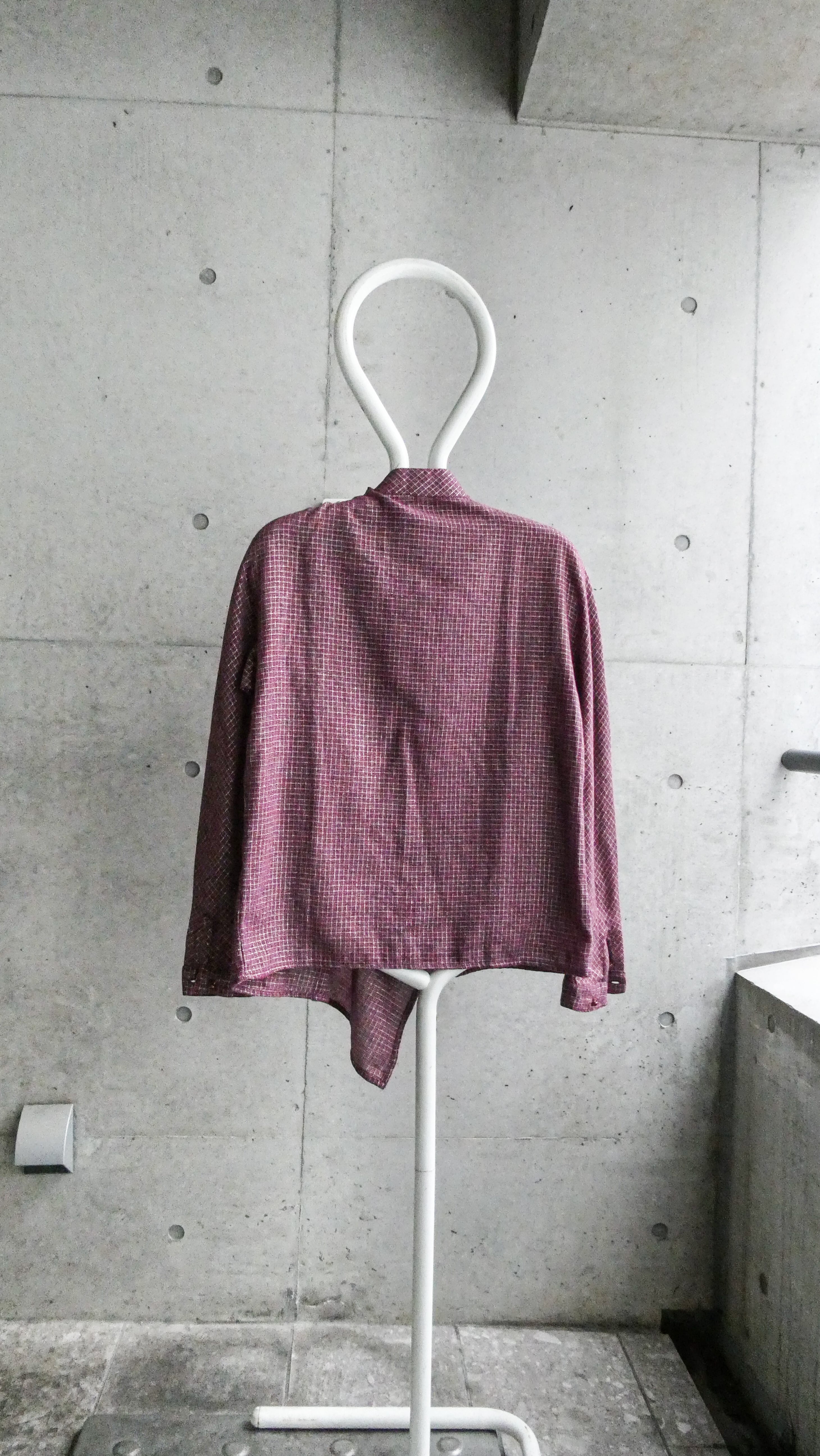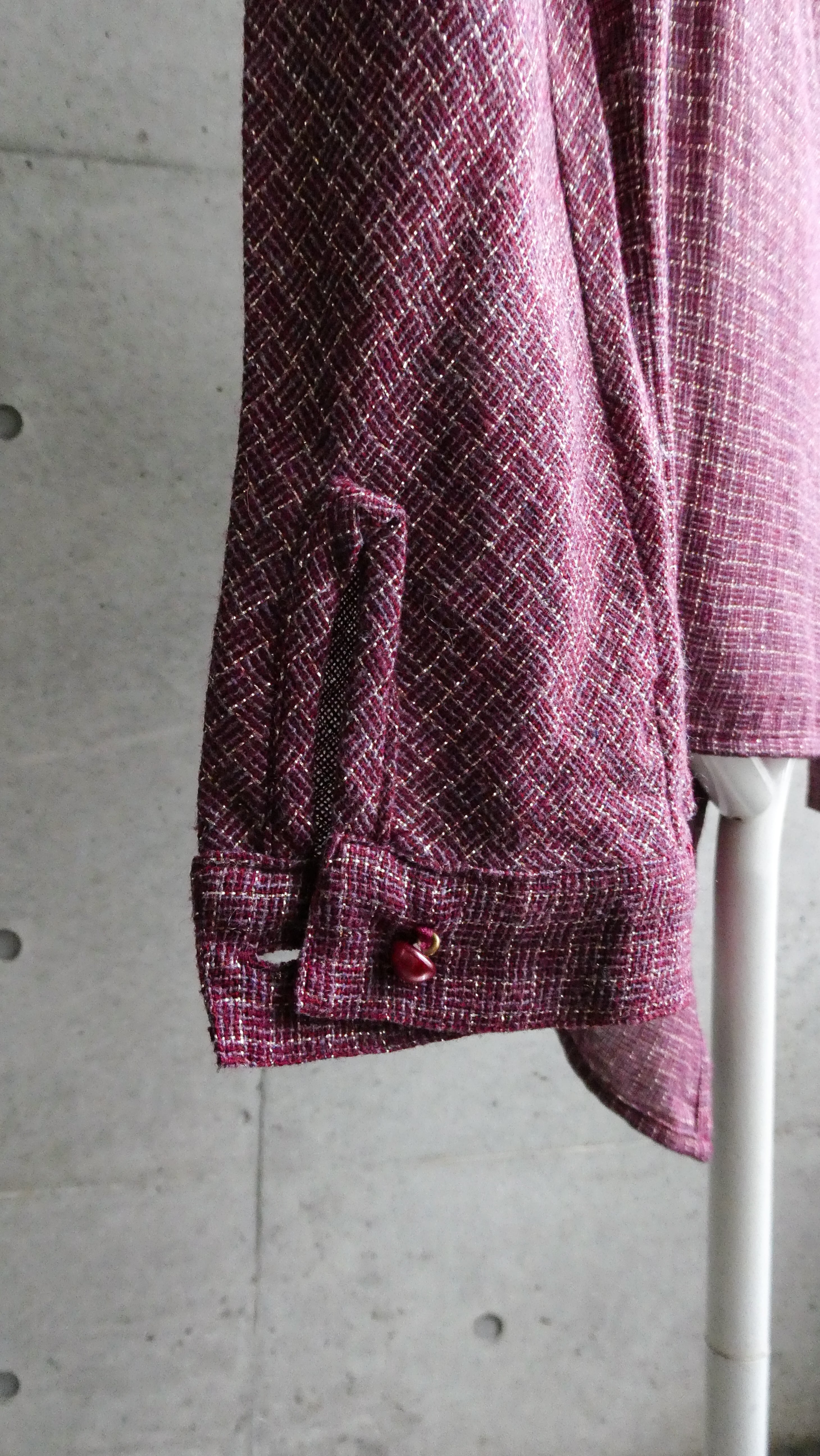 チェリーカラーにラメが入ったチェック柄シャツ。アシンメトリーのレイヤードパターン。ラメのウール生地が良すぎてピックしました。首元のボタンも可愛いです。レディース向けサイズです。ジャケットの下に着たりするのもオススメです。