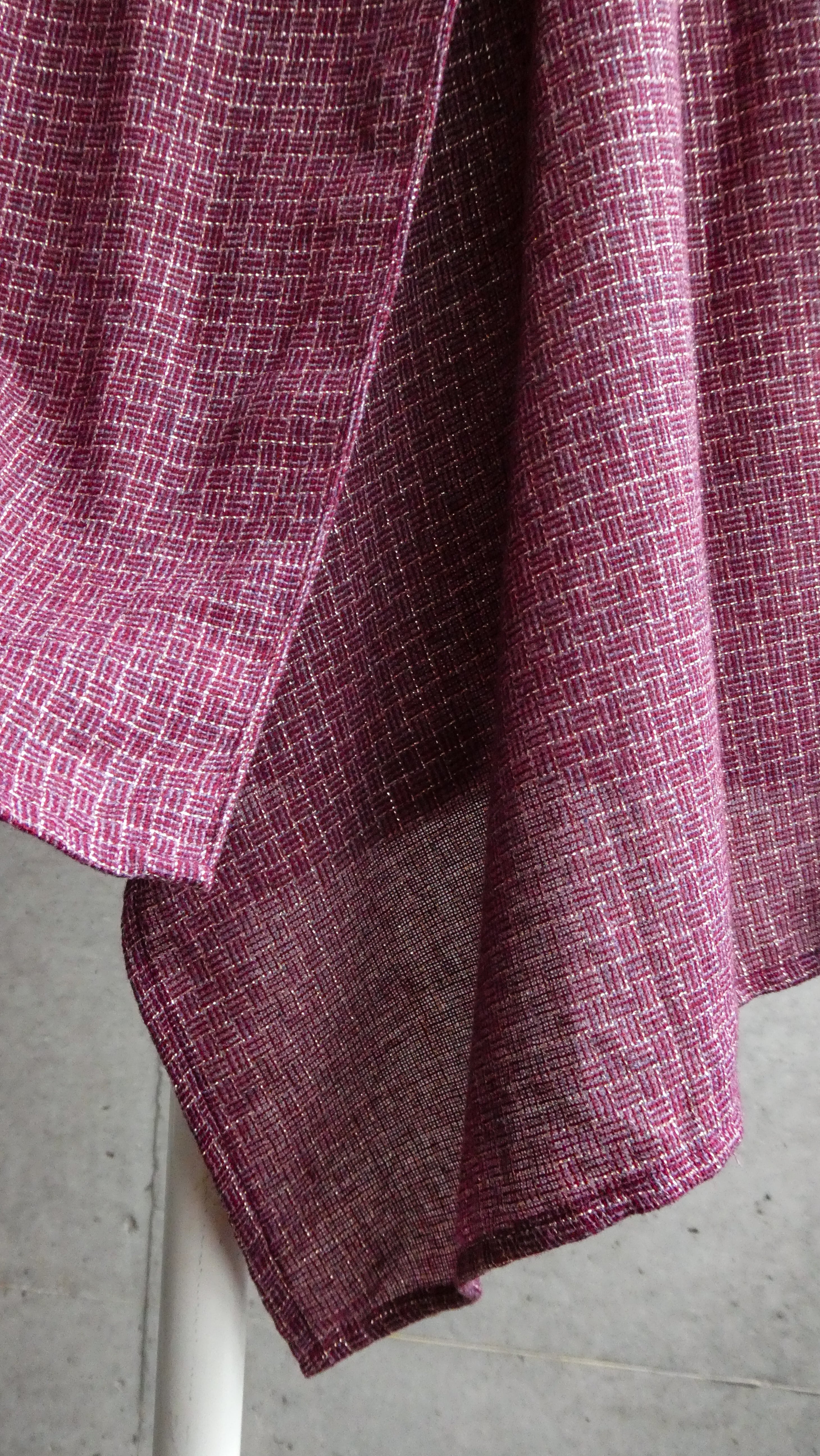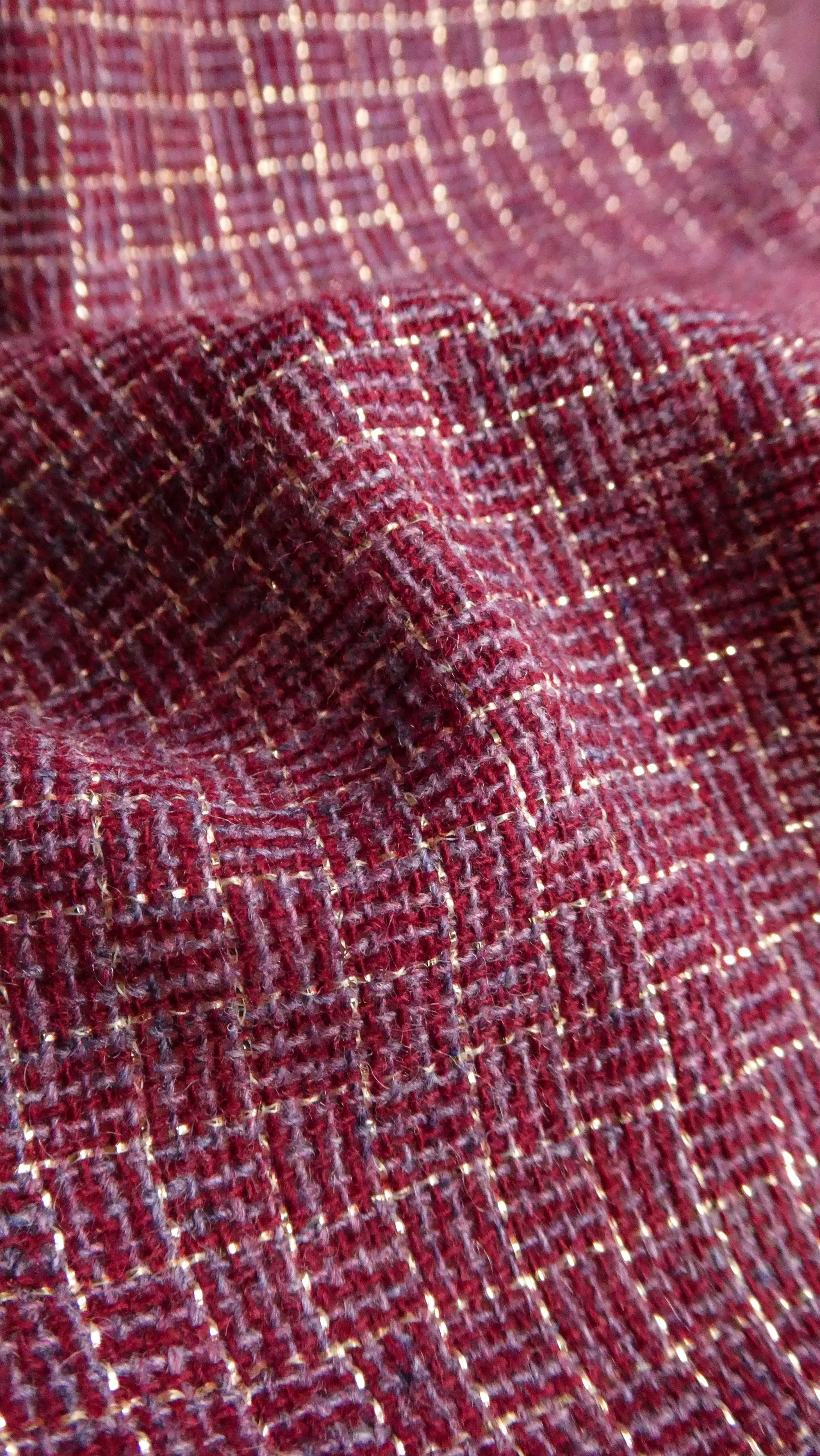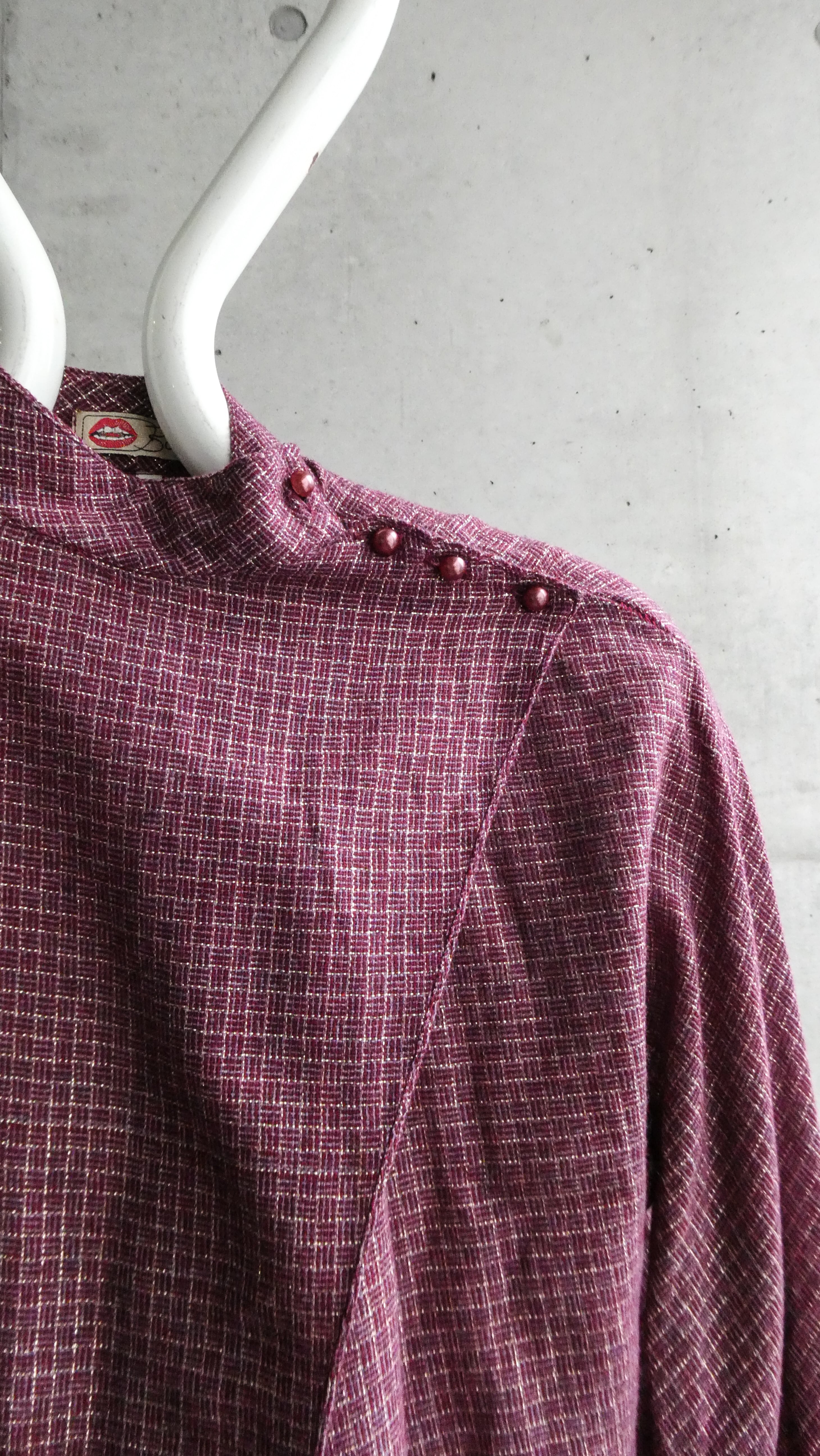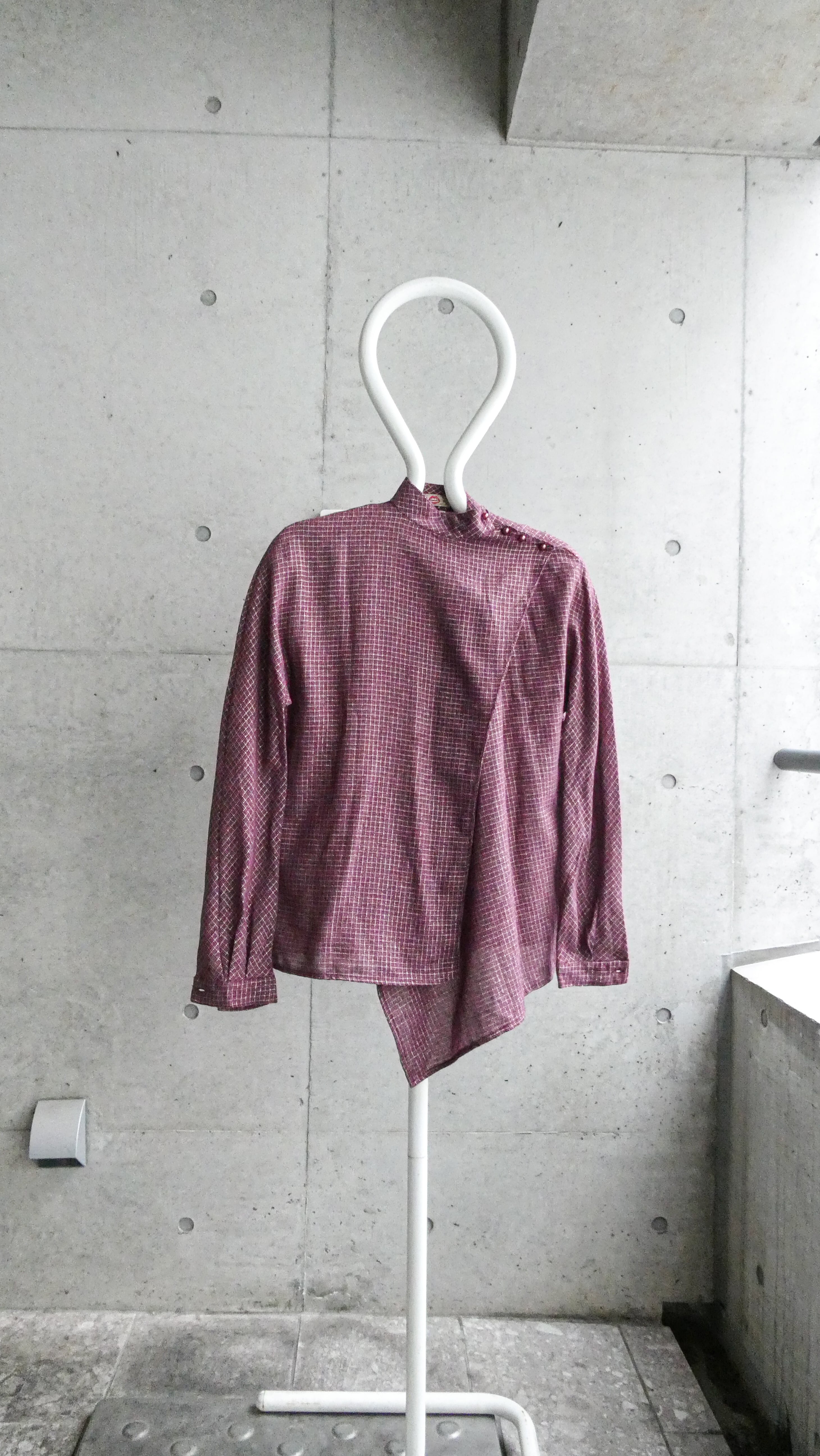 チェリーカラーにラメが入ったチェック柄シャツ。アシンメトリーのレイヤードパターン。ラメのウール生地が良すぎてピックしました。首元のボタンも可愛いです。レディース向けサイズです。ジャケットの下に着たりするのもオススメです。