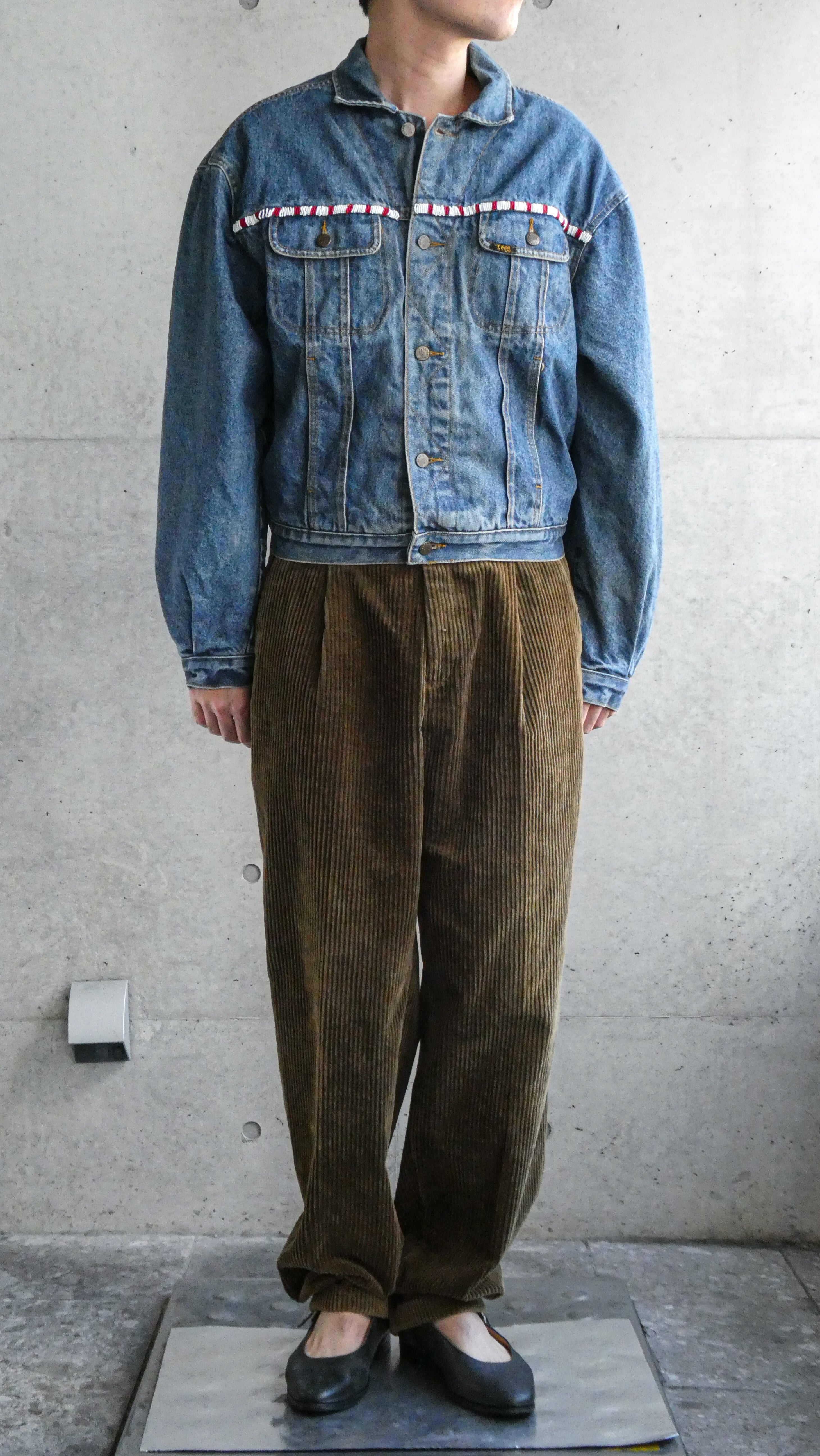 スペシャル。LEEのデニムトラッカーに前任者のビーズカスタム。古着の醍醐味詰まったやつ。背面裾も黄、紺のビーズ。やりすぎない、絶妙な感じが唯一無二です。