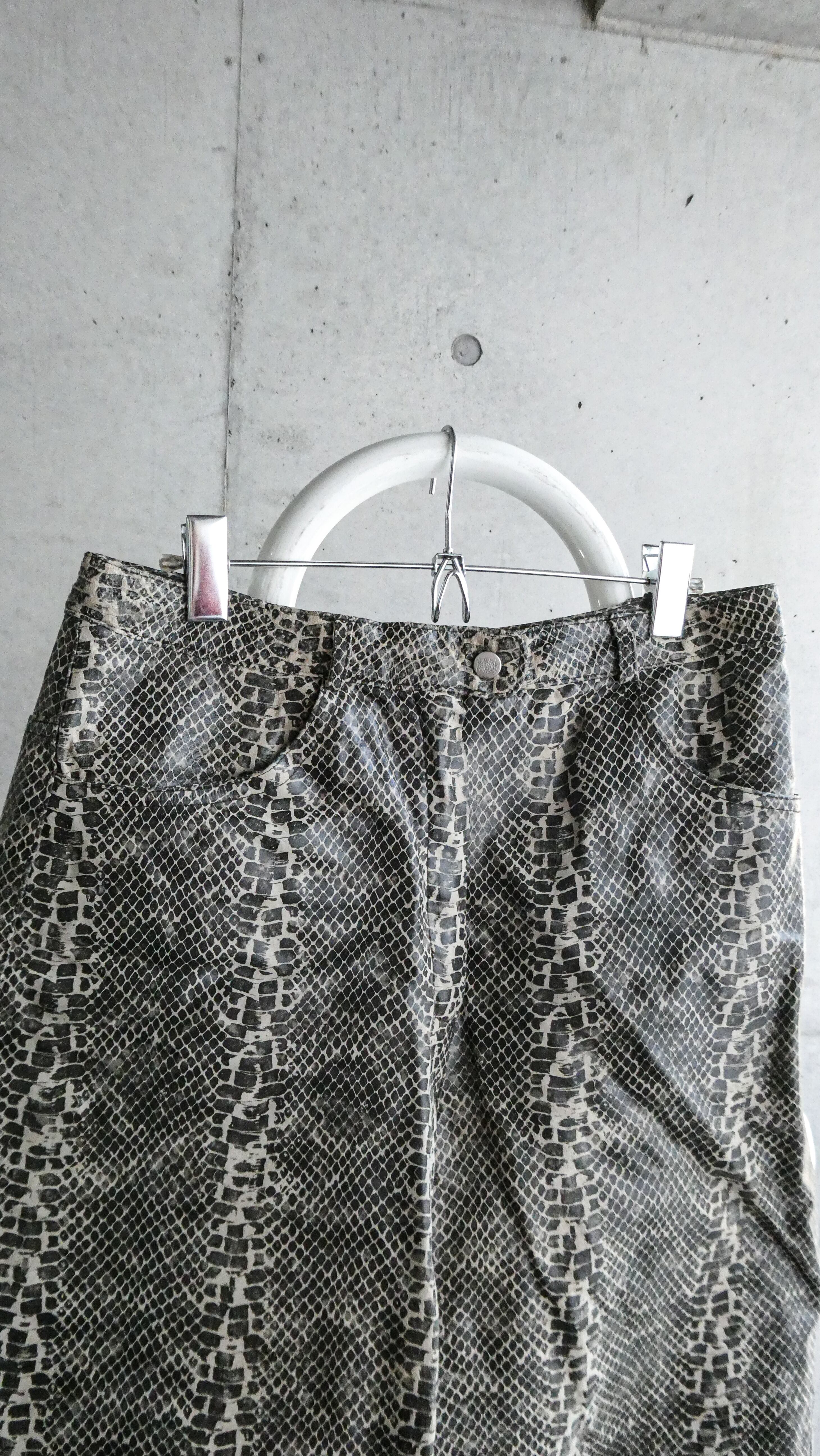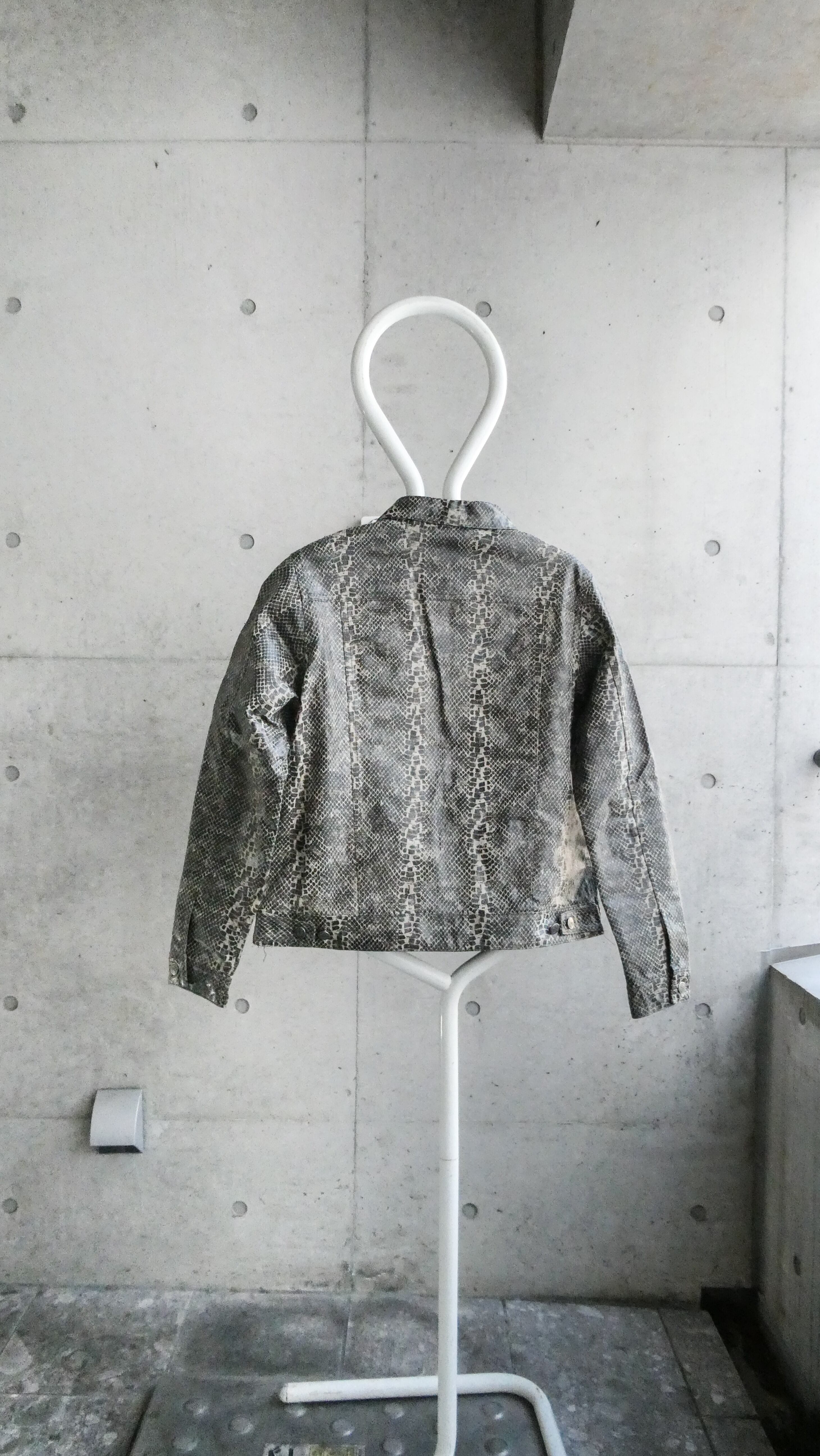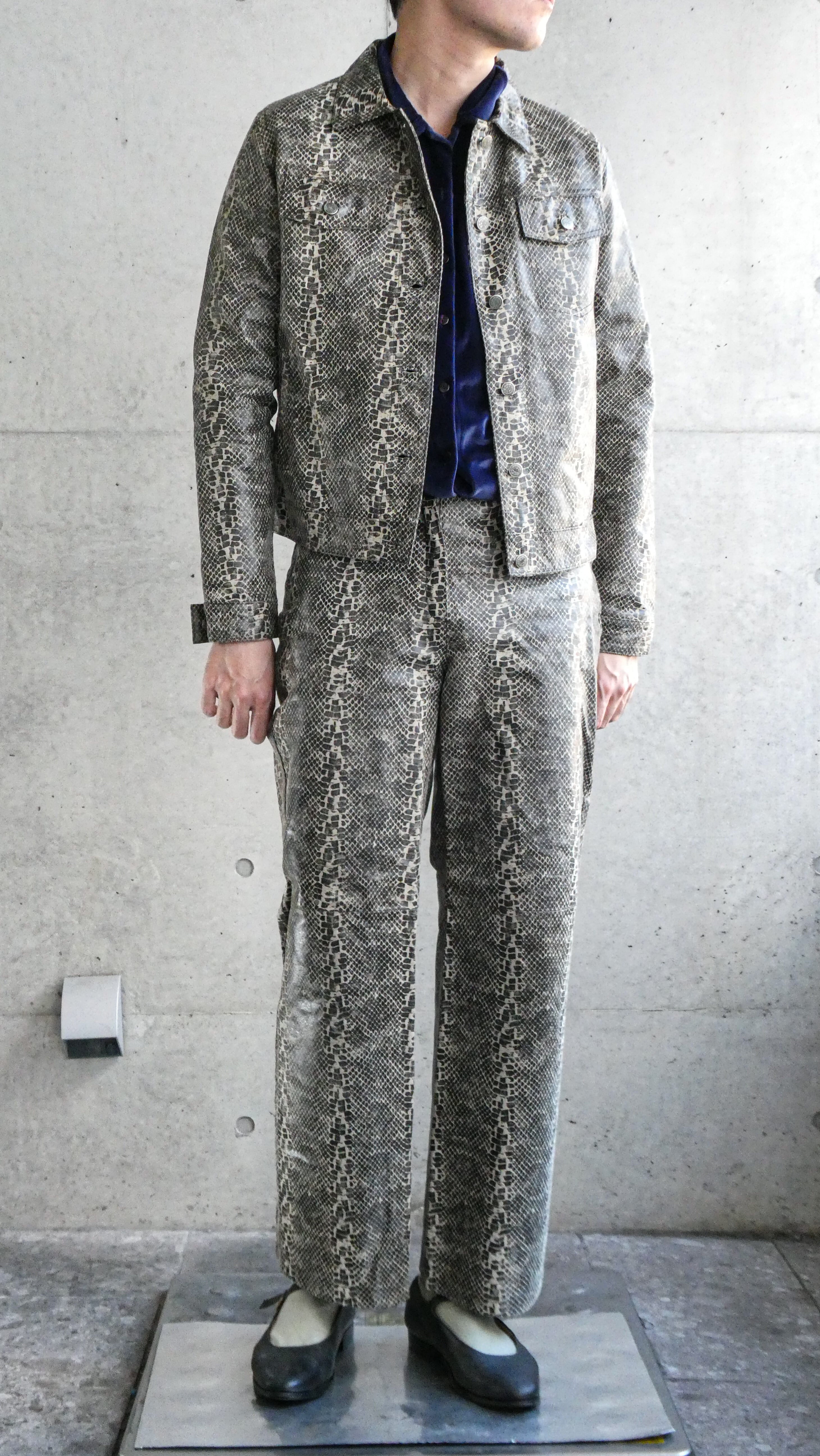 超スペシャル。パイソンの型押しプリントされたレザーセットアップ。しっかり本革です。こんなパイソンのセットアップ見たことないです。トラッカージャケット型。パンツも細すぎない、ストレートシルエット。