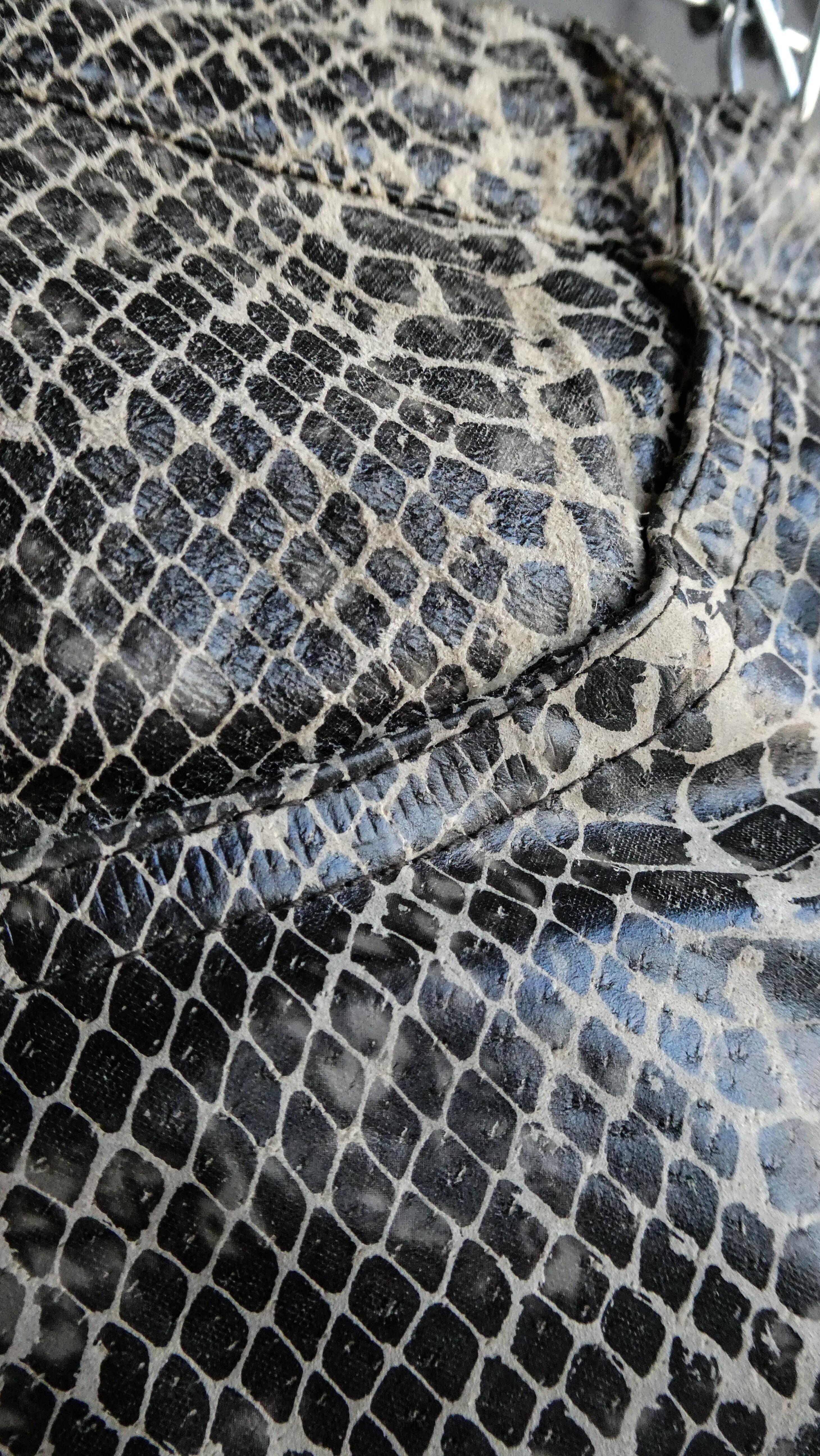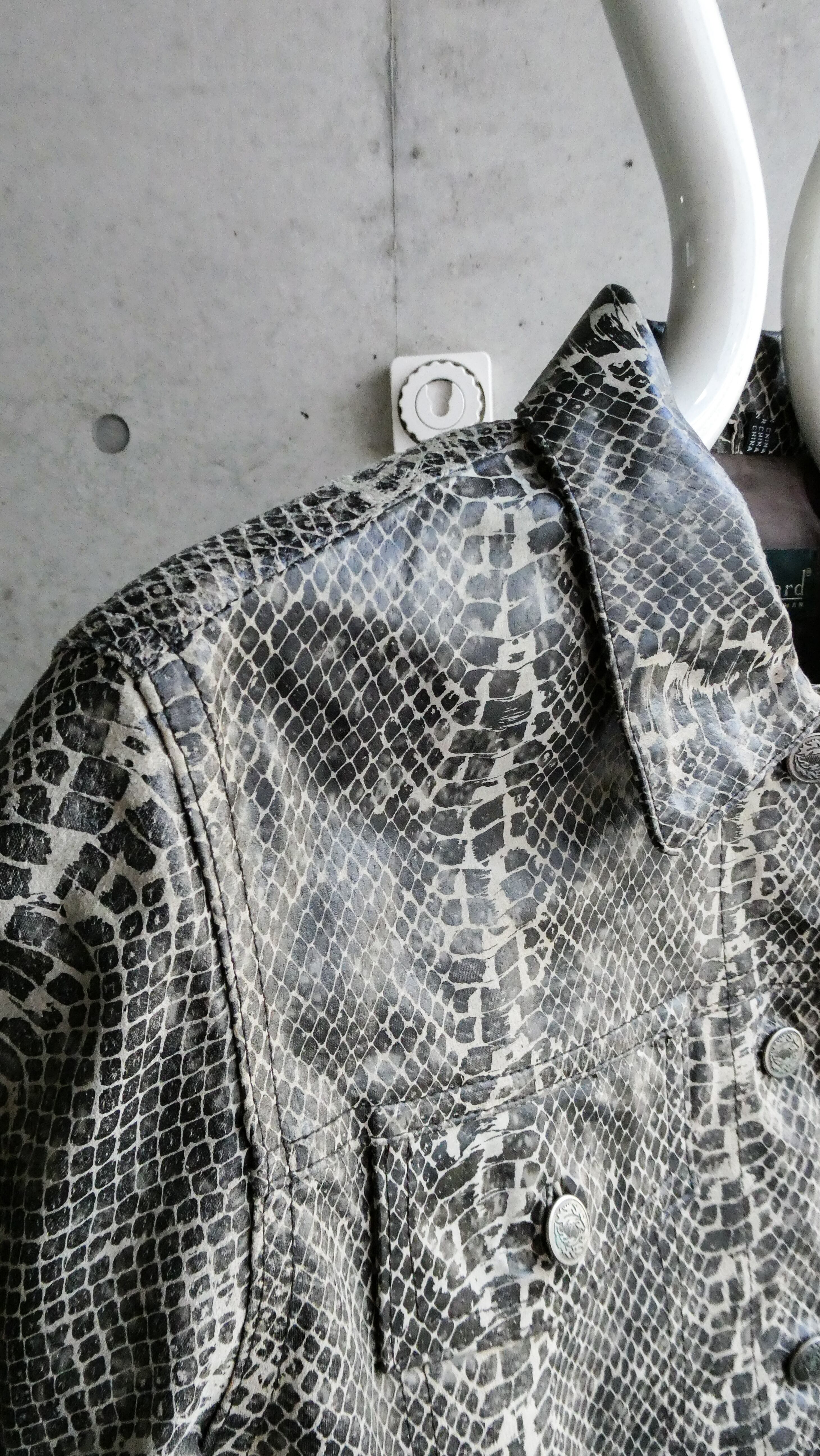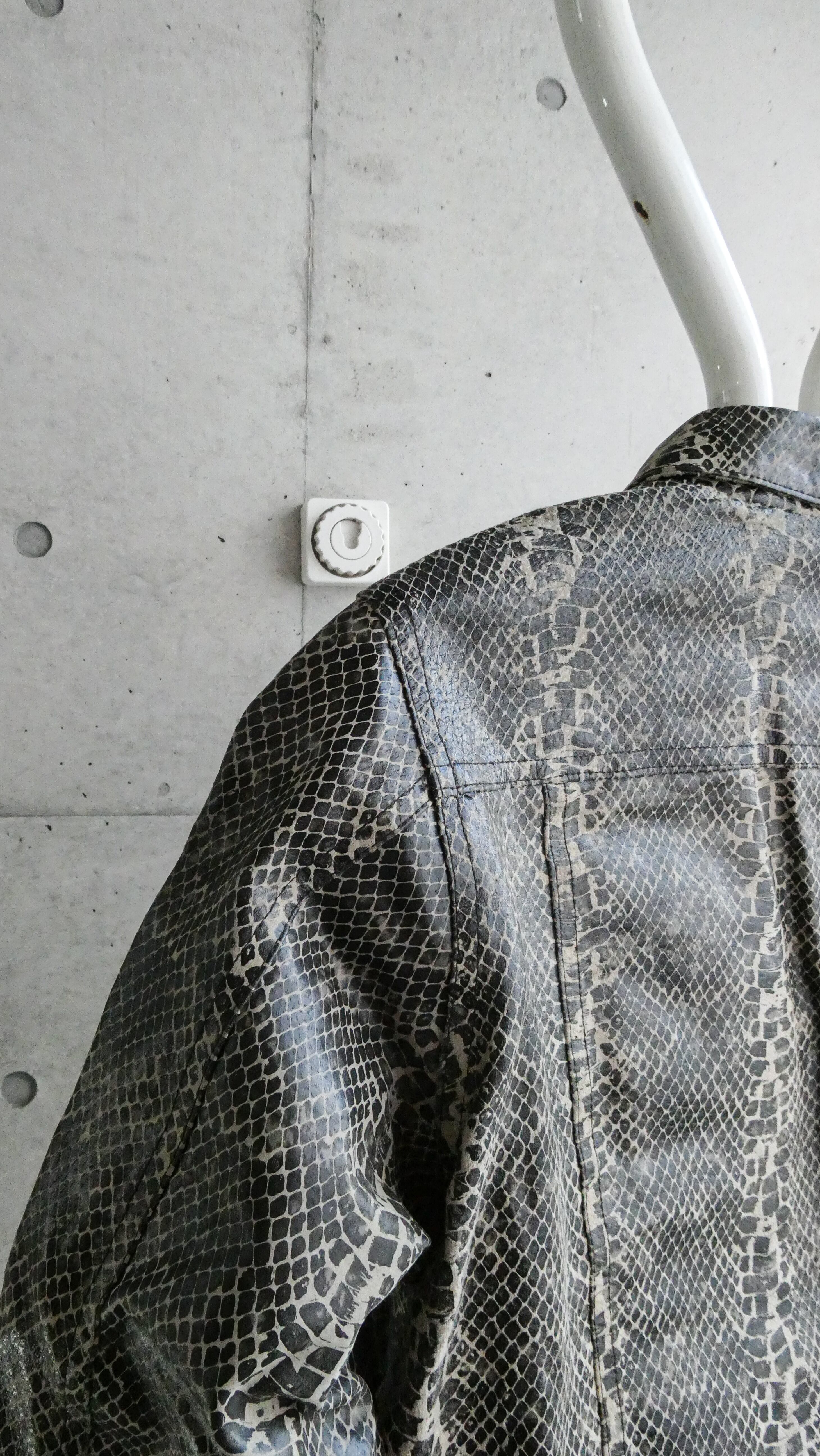 超スペシャル。パイソンの型押しプリントされたレザーセットアップ。しっかり本革です。こんなパイソンのセットアップ見たことないです。トラッカージャケット型。パンツも細すぎない、ストレートシルエット。