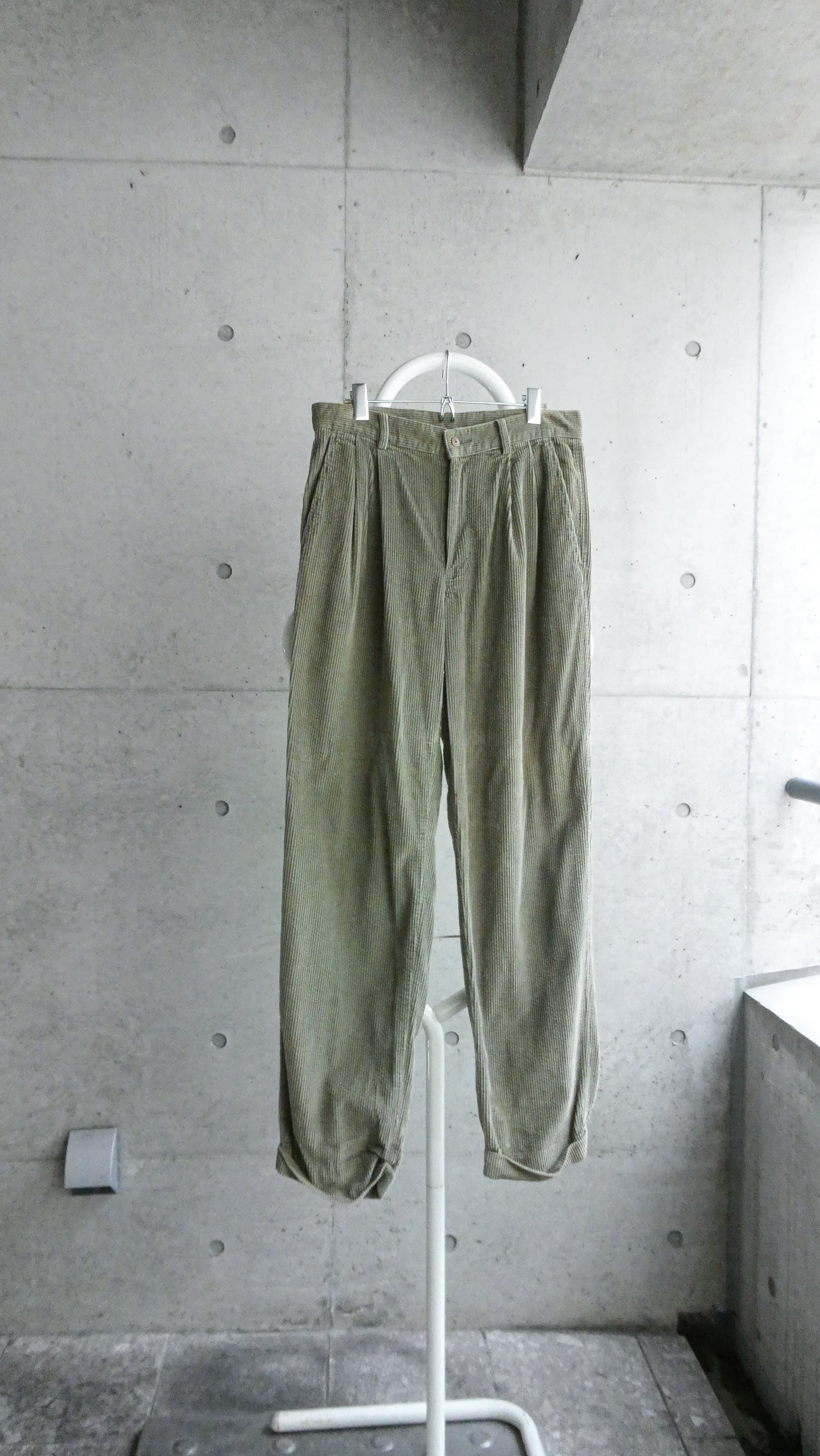 レアカラーなピスタチオ色のコーデュロイスラックス。しっかり肉厚で太畝コーデュロイ。2タック入り。後ろポケットも両方フラップで豪華な作りです。