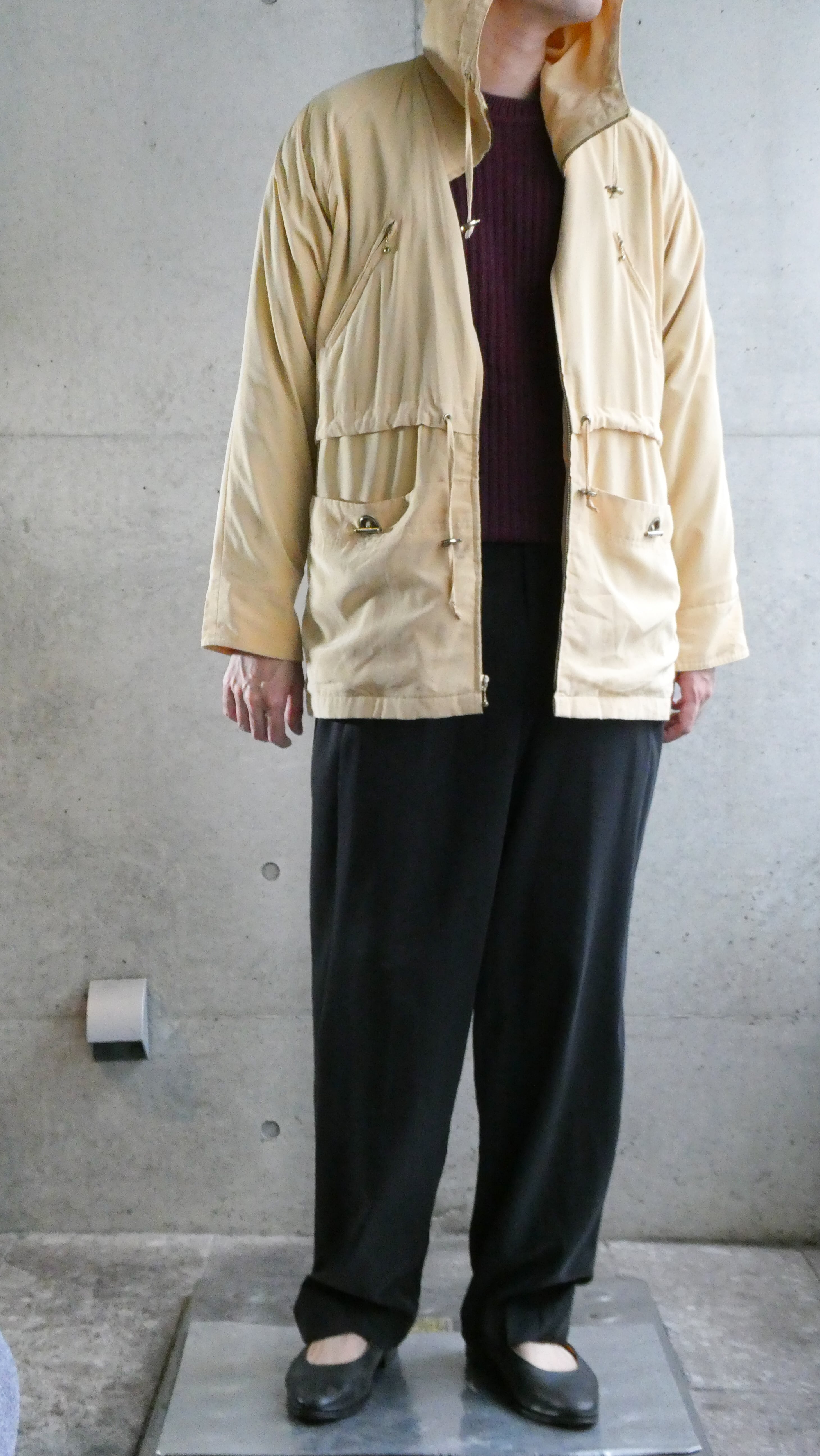 ベージュカラーのフーデッドコート。アイレット仕様のボタンが特徴的なコートです。ラグランスリーブ。背面の雨除けディテールも秀逸です。