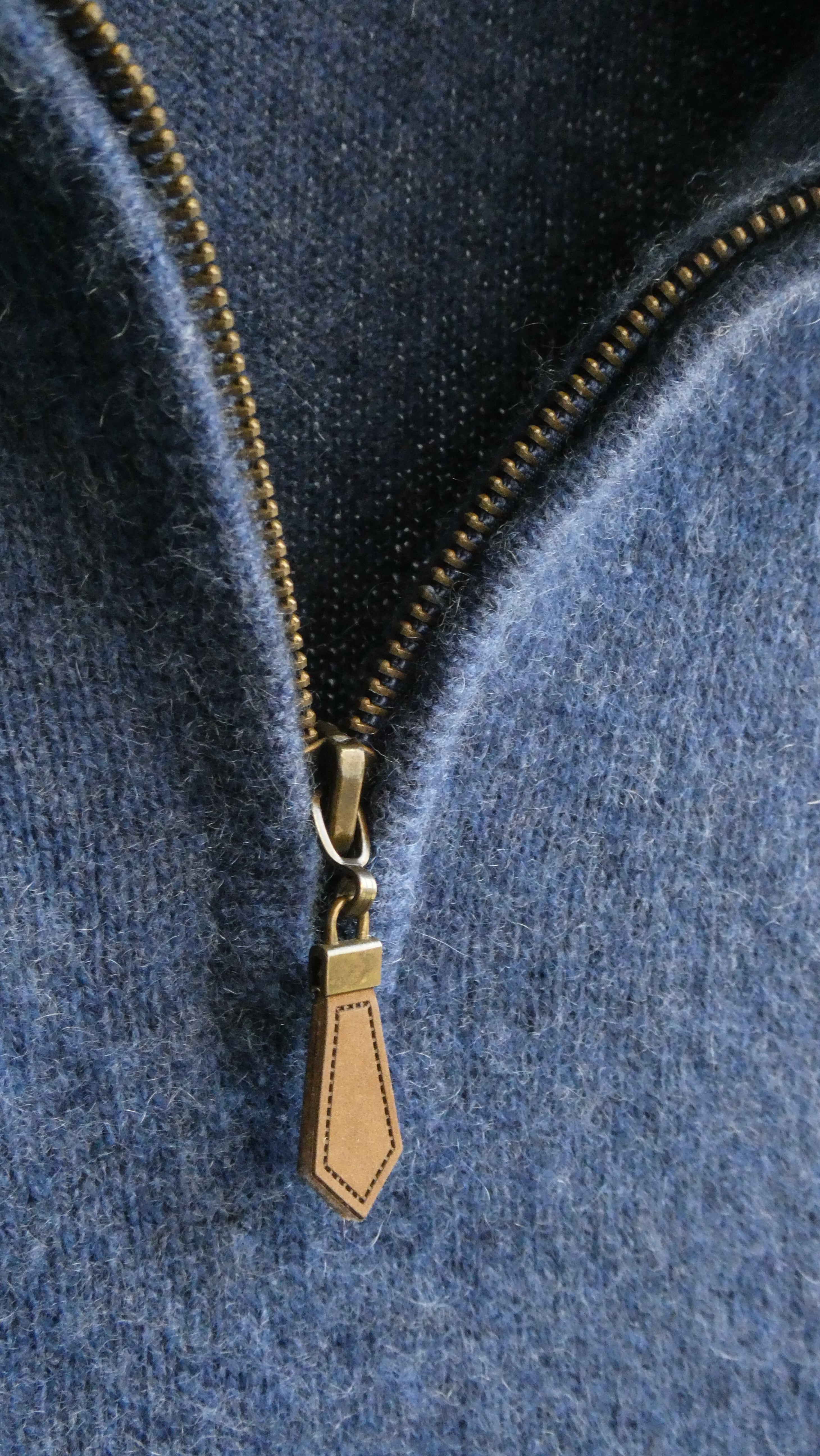 カシミヤ100%のハーフジップニット。2PLYカシミヤで通常より肉厚感ある豪華なカシミヤ使い。ジップもエルメスを彷彿とさせるレザーチャーム。適度に緩く着れるサイズ感です。