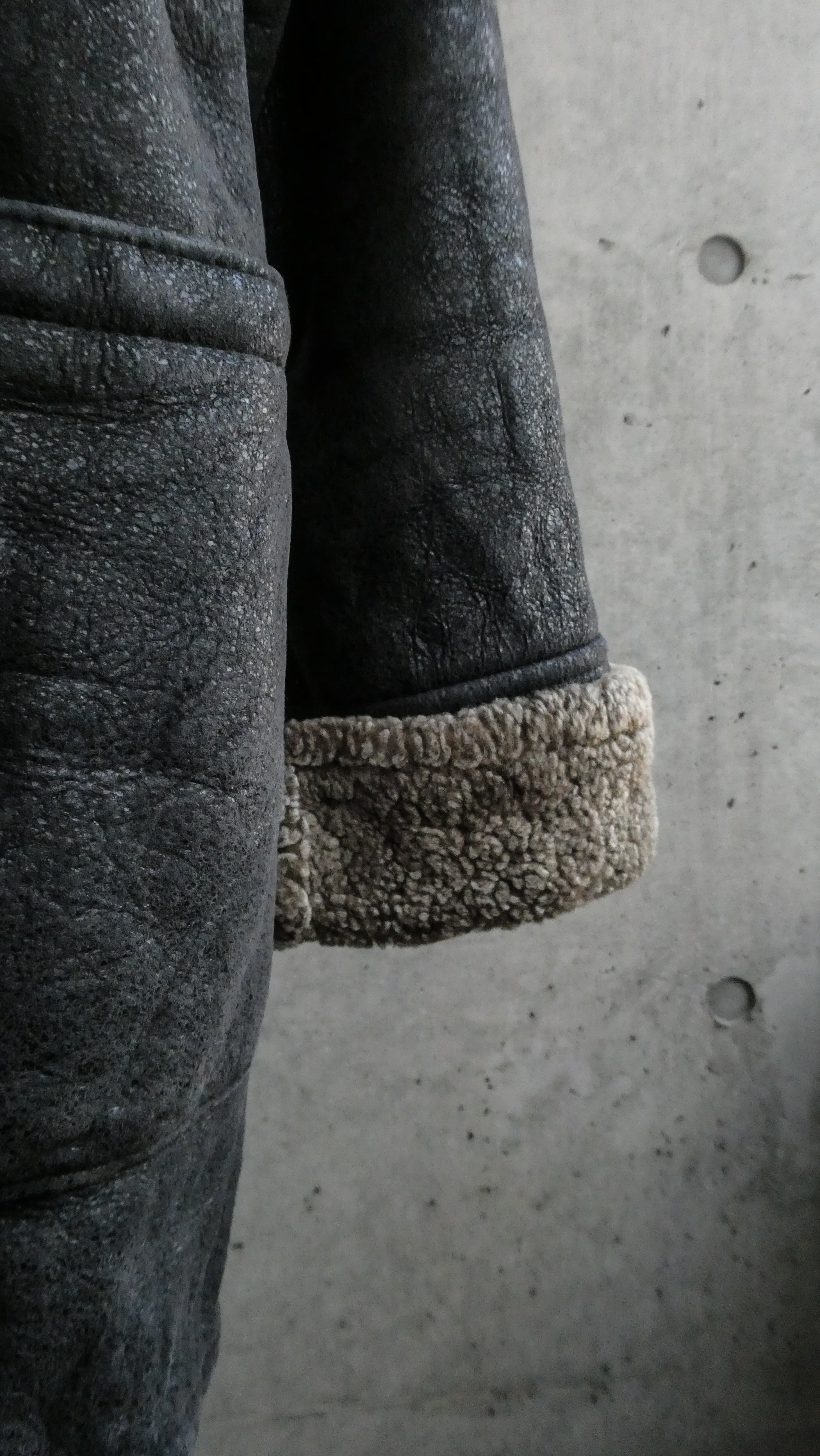 カナダ製のムートンコート。黒ベースで、綺麗なシルエットで着れるプレーンなムートン。襟ボアも黒が混じった色味なのが凄くポイントです。しっかり肩馴染みもいいです。