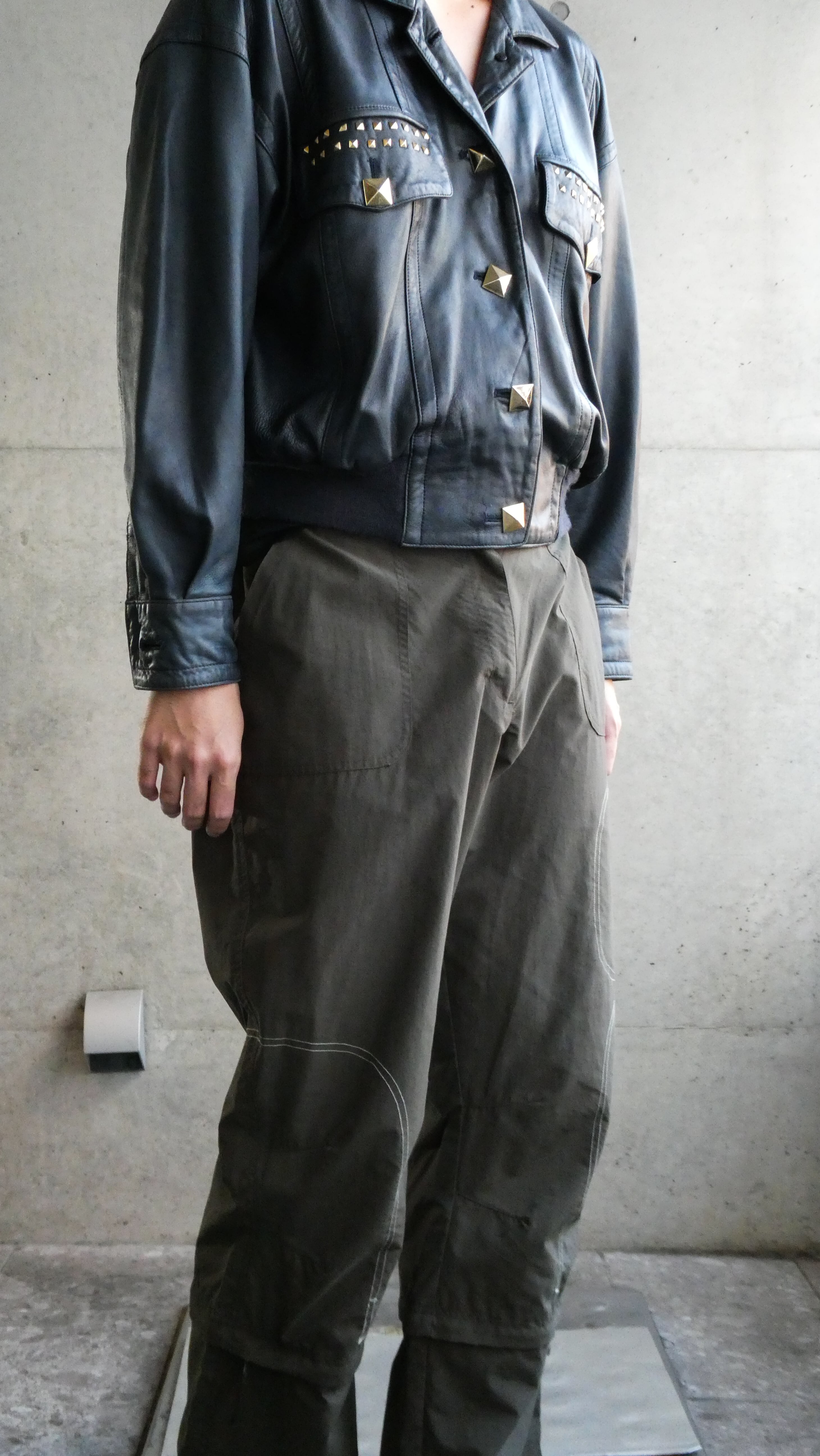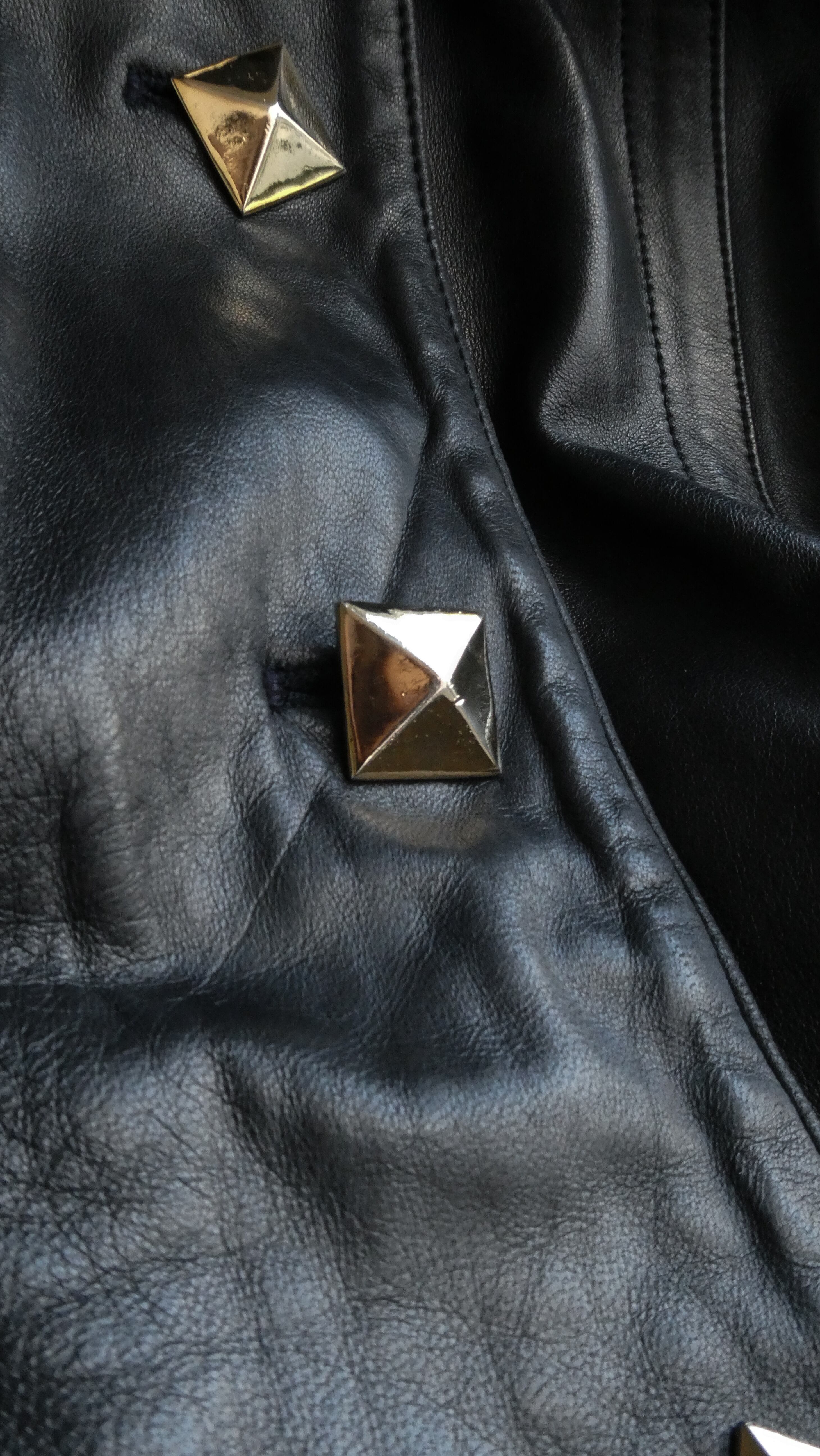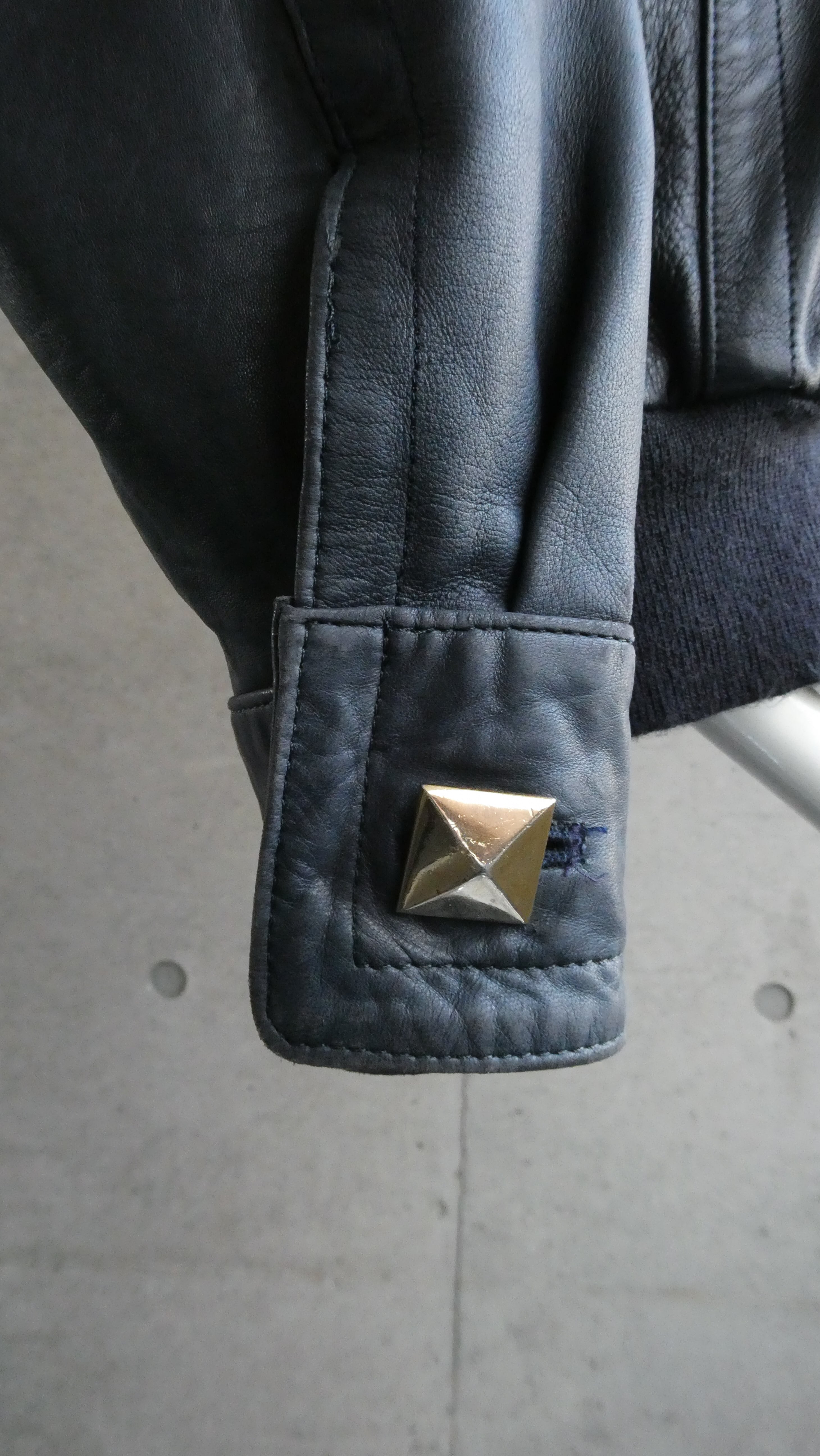 超スペシャル。過去最高峰にカッコイイレザー。ネイビーのレザーにスタッズが施されたデザイン。ボタンもスタッズと同じピラミッド型のメタルボタン。形はトラッカージャケットをブルゾンに落とし込んだタイプ。革質もメゾンが使っているかのような柔らかさ。シルエットも完璧。次回入荷は難しい一着です。