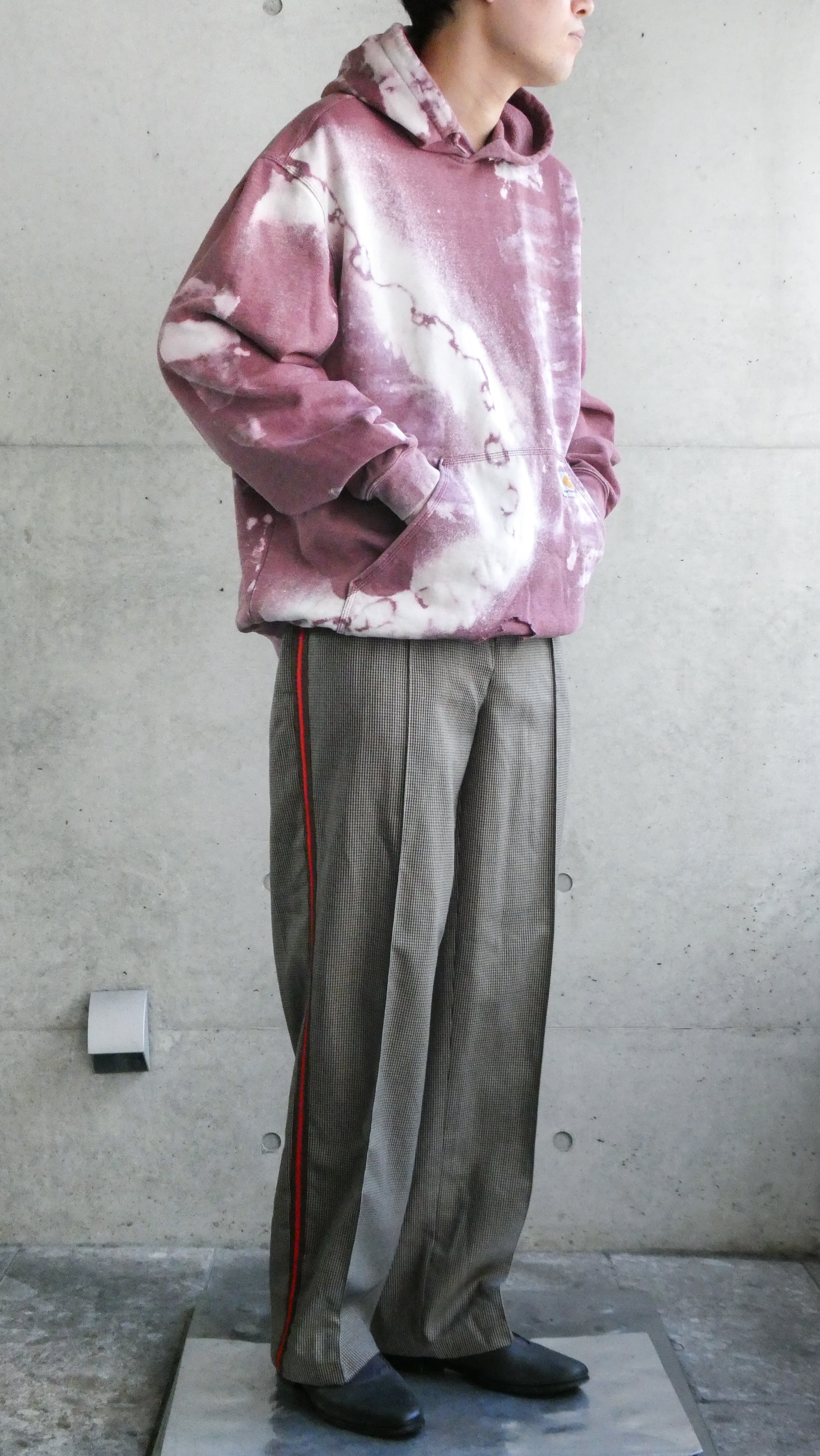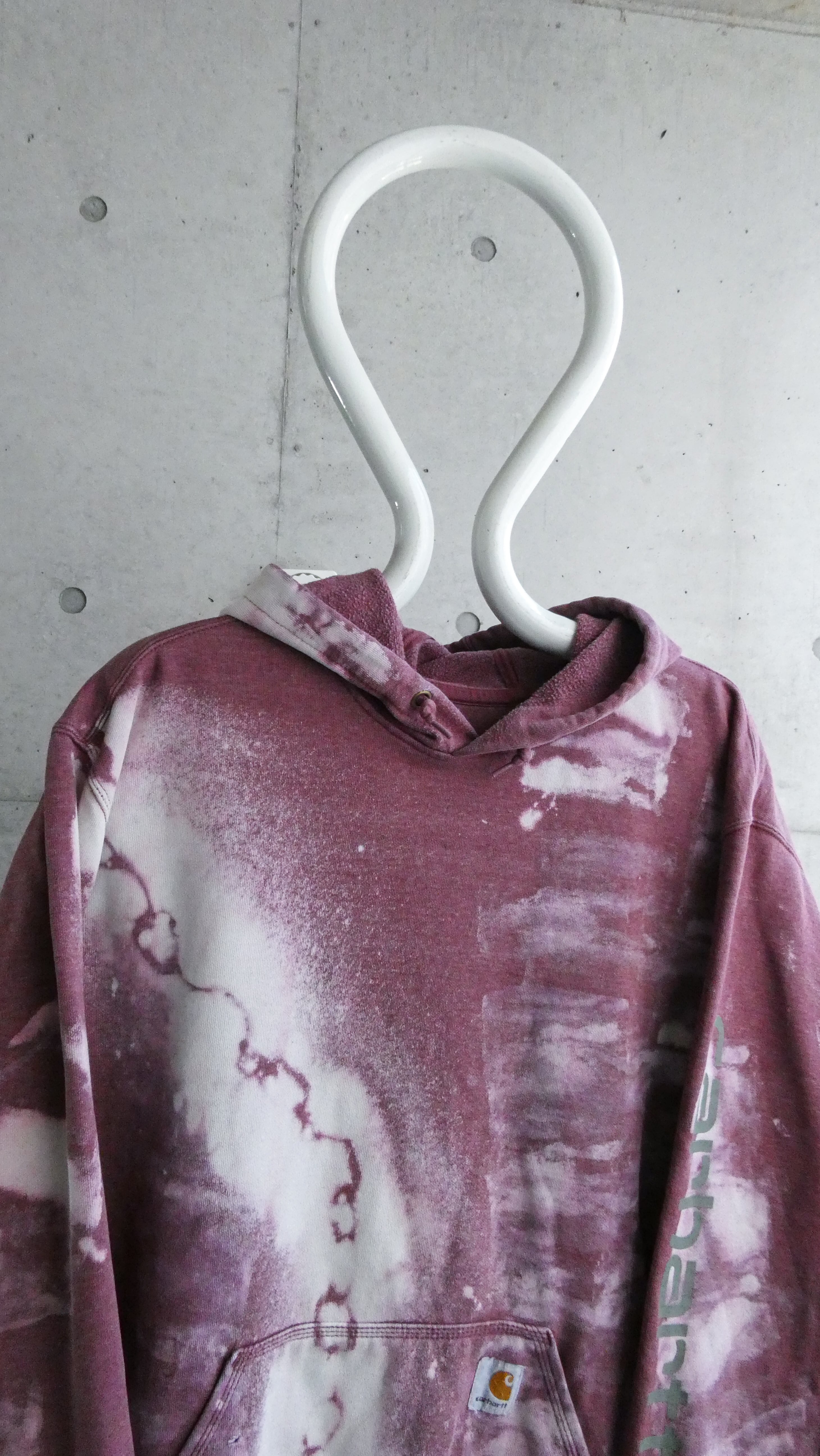 カーハートのフーディー。アズキ色でタイダイカラー。色味が凄くよくてピックしました。レザー系のインナーにもオススメなやつです。背面は控えめなブリーチでバランス取れてます。