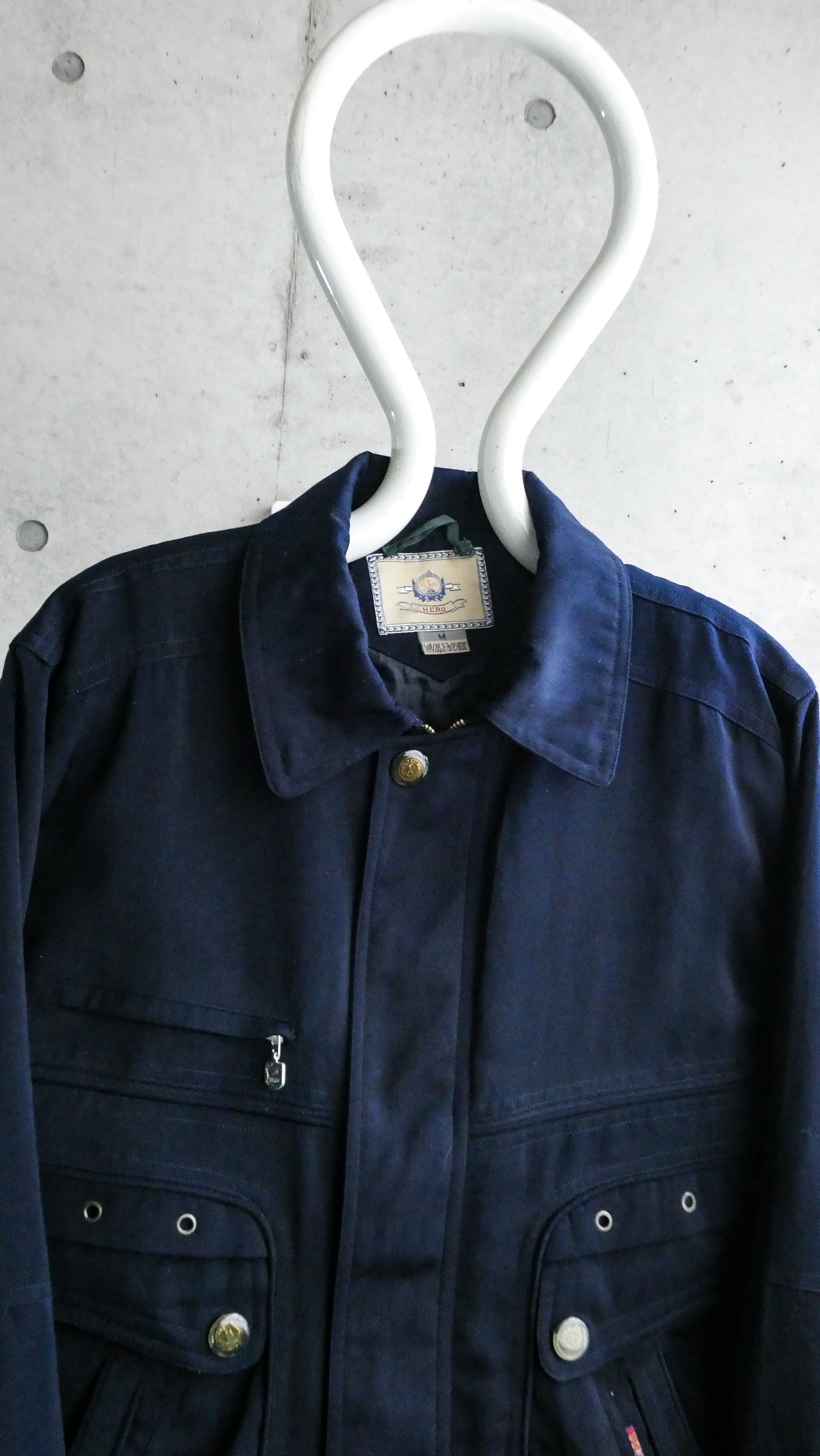 スペシャル。ポケットフラップにゴールドのアイレットが付いたデザインが特徴です。スムース生地で高級感あるネイビーカラー。無地でこういう気の利いたデザインのブルゾンは希少です。裾リブ効いてて、好きな丈感で着用可能。