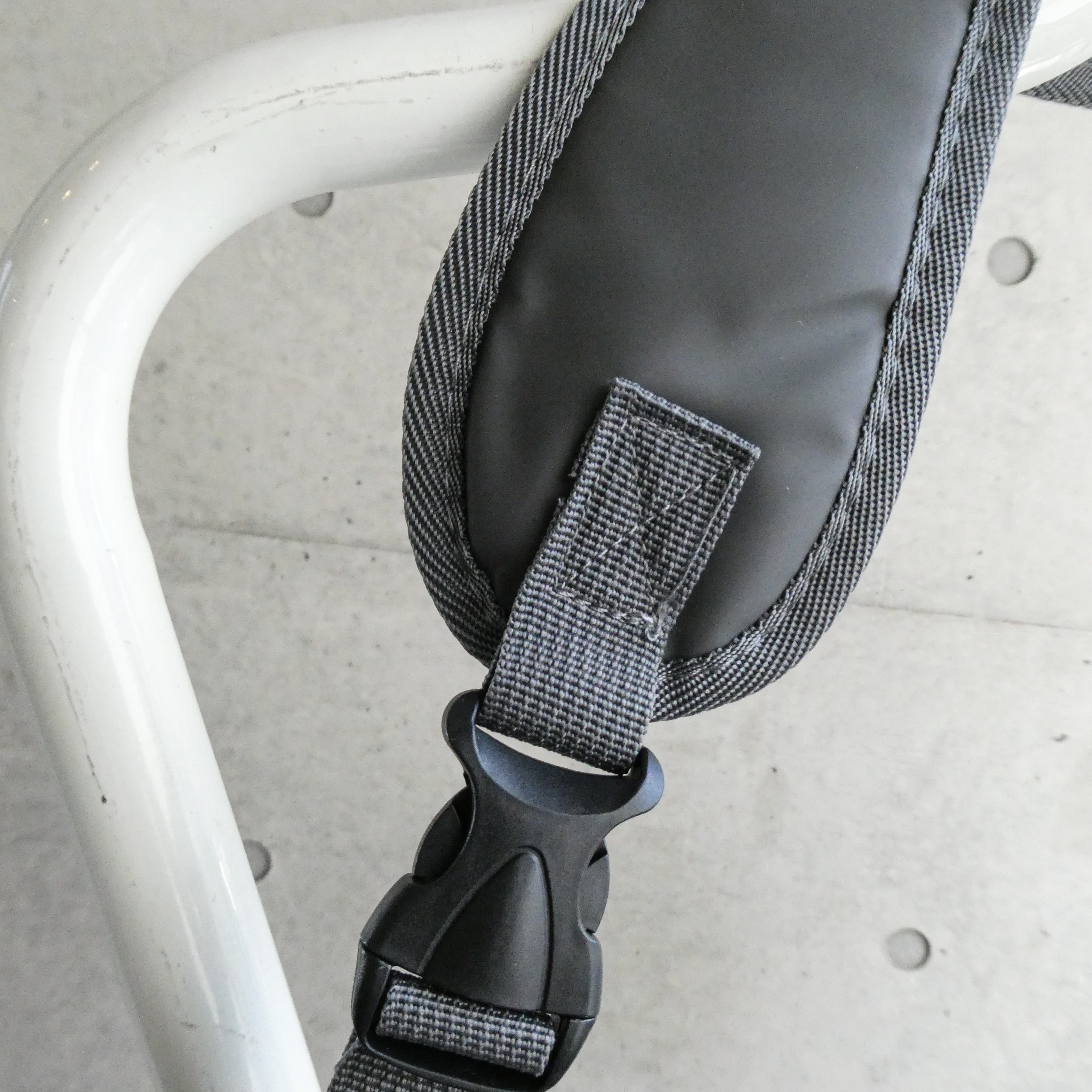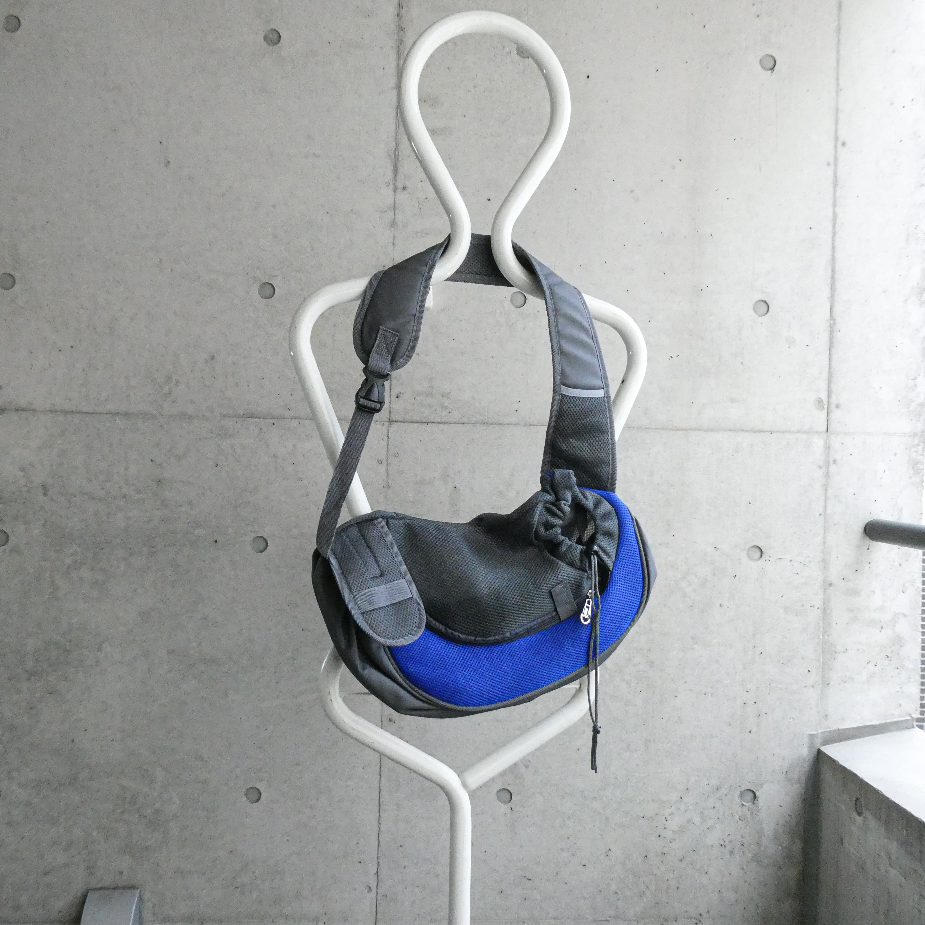 グレーベースにブルーのスリングバッグ。ハーフムーン型で、大きさも凄くいいです。肩紐も太くて、背負うだけでスタイリングに雰囲気出るアイテムです。