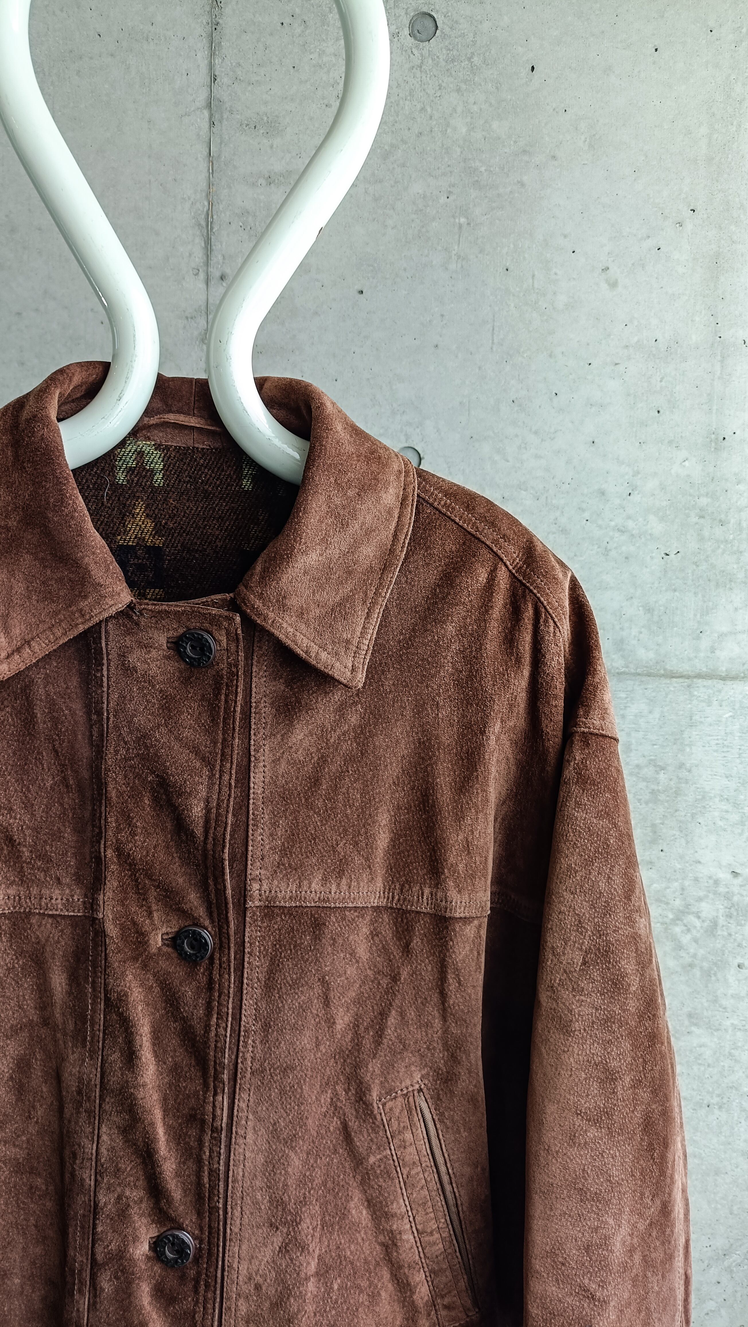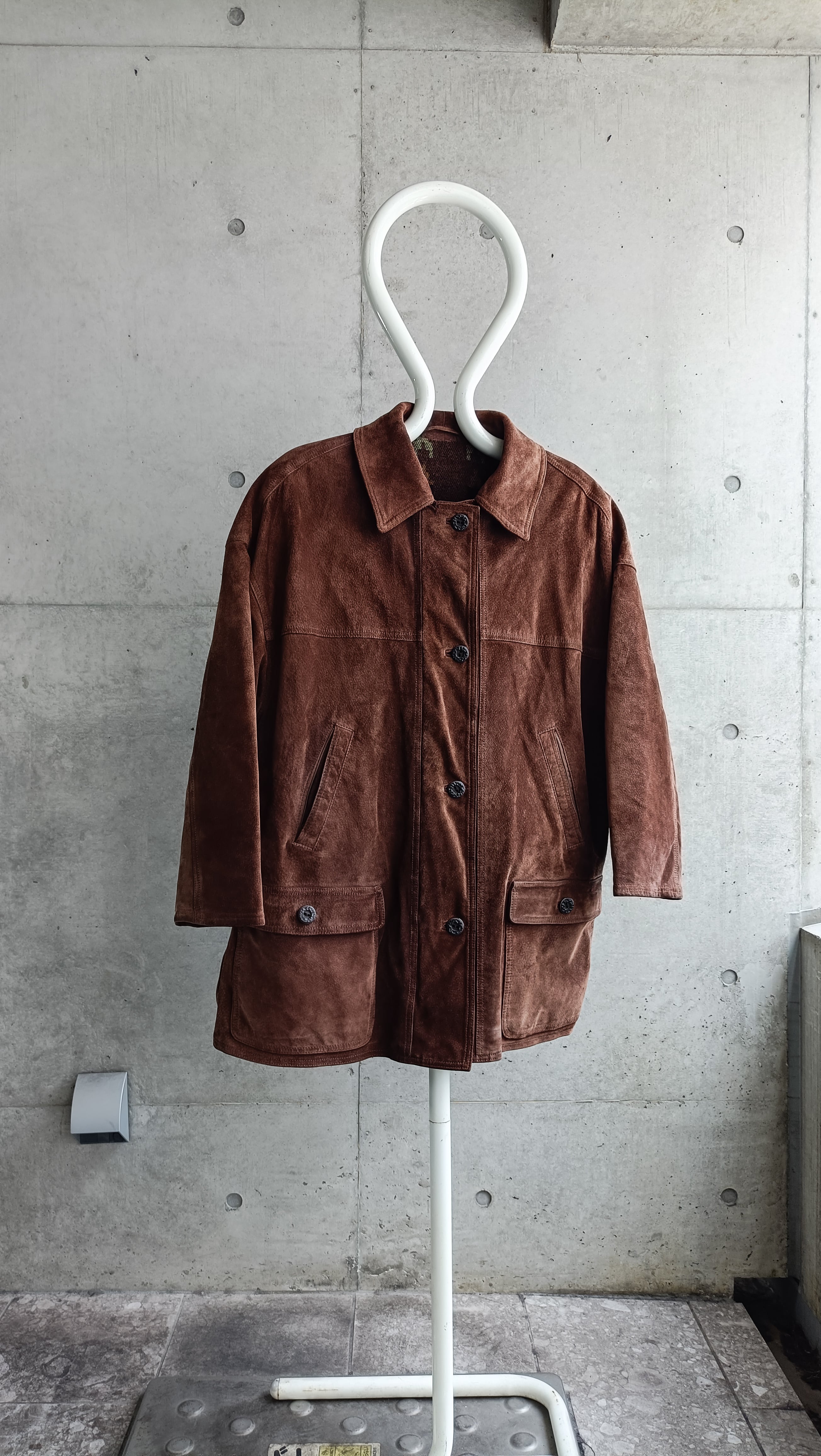 タバコカラーのスウェードレザーコート。か革質と軽さ、シルエットに拘って入荷してます。サイドスリット入り。状態も良好。革も柔らかいので、肩馴染みもいいです。