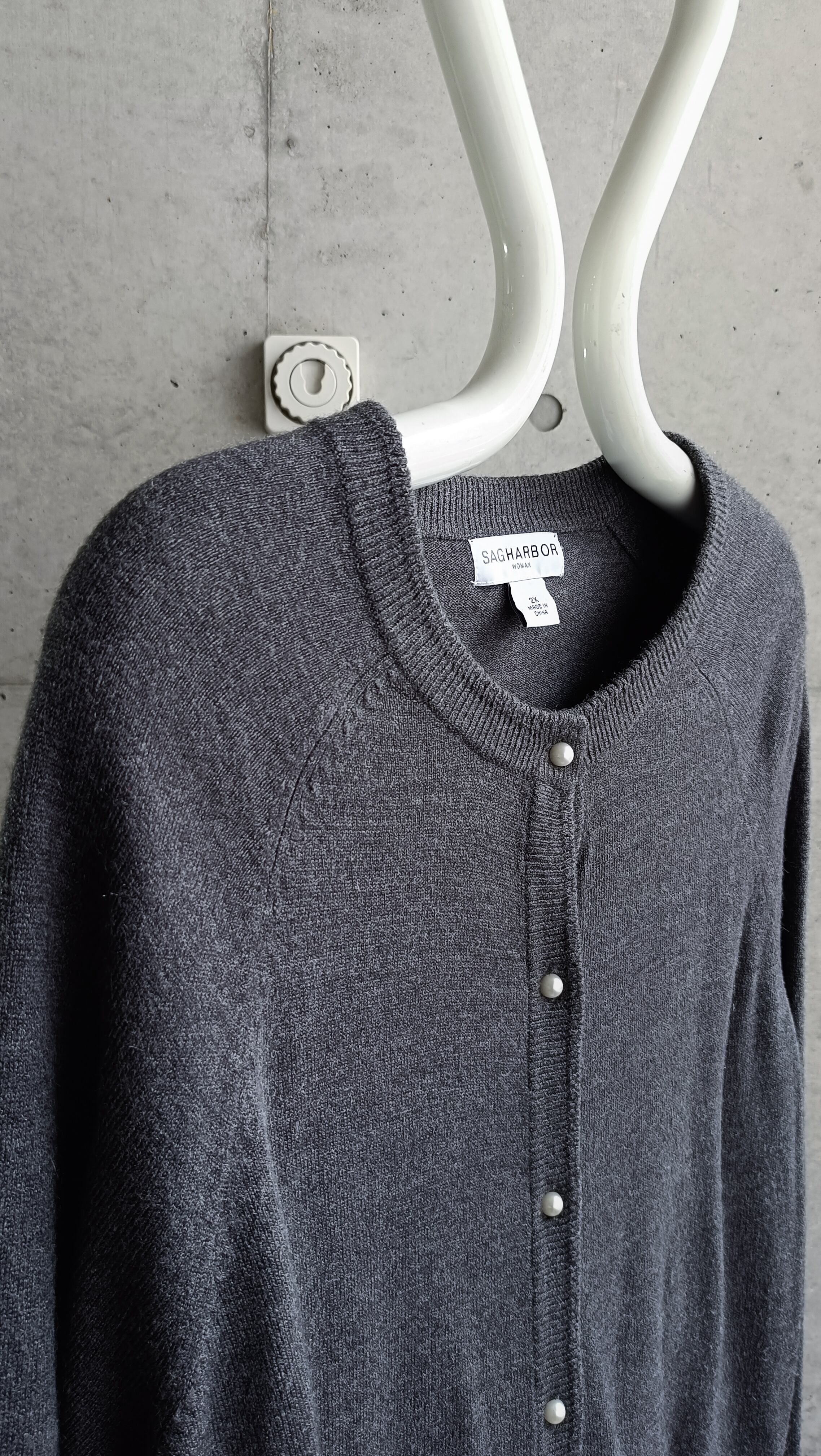 チャコールグレーのクルーネックカーディガン。ボタンがパールボタンなのが特徴です。メンズが緩く着れる希少なサイズ。本日のスタイリングでも大活躍でした。