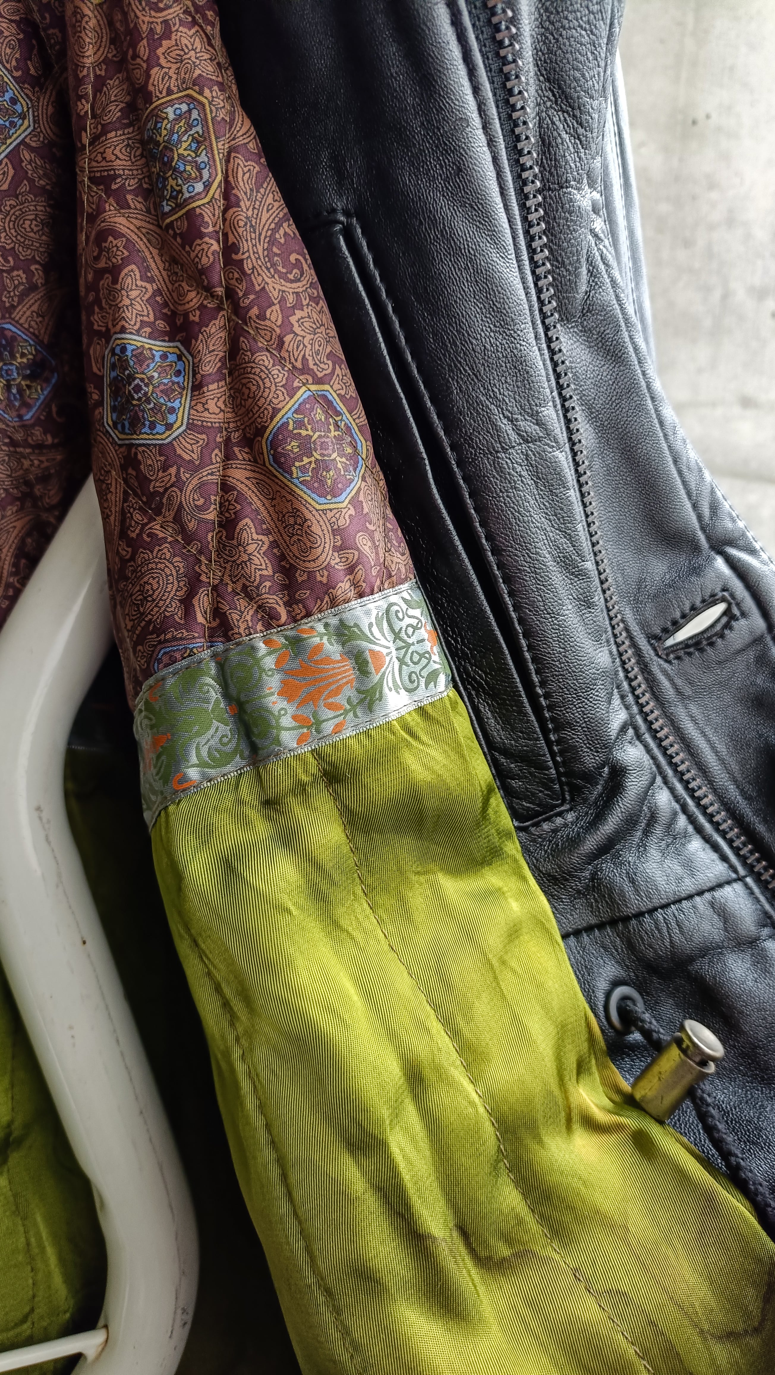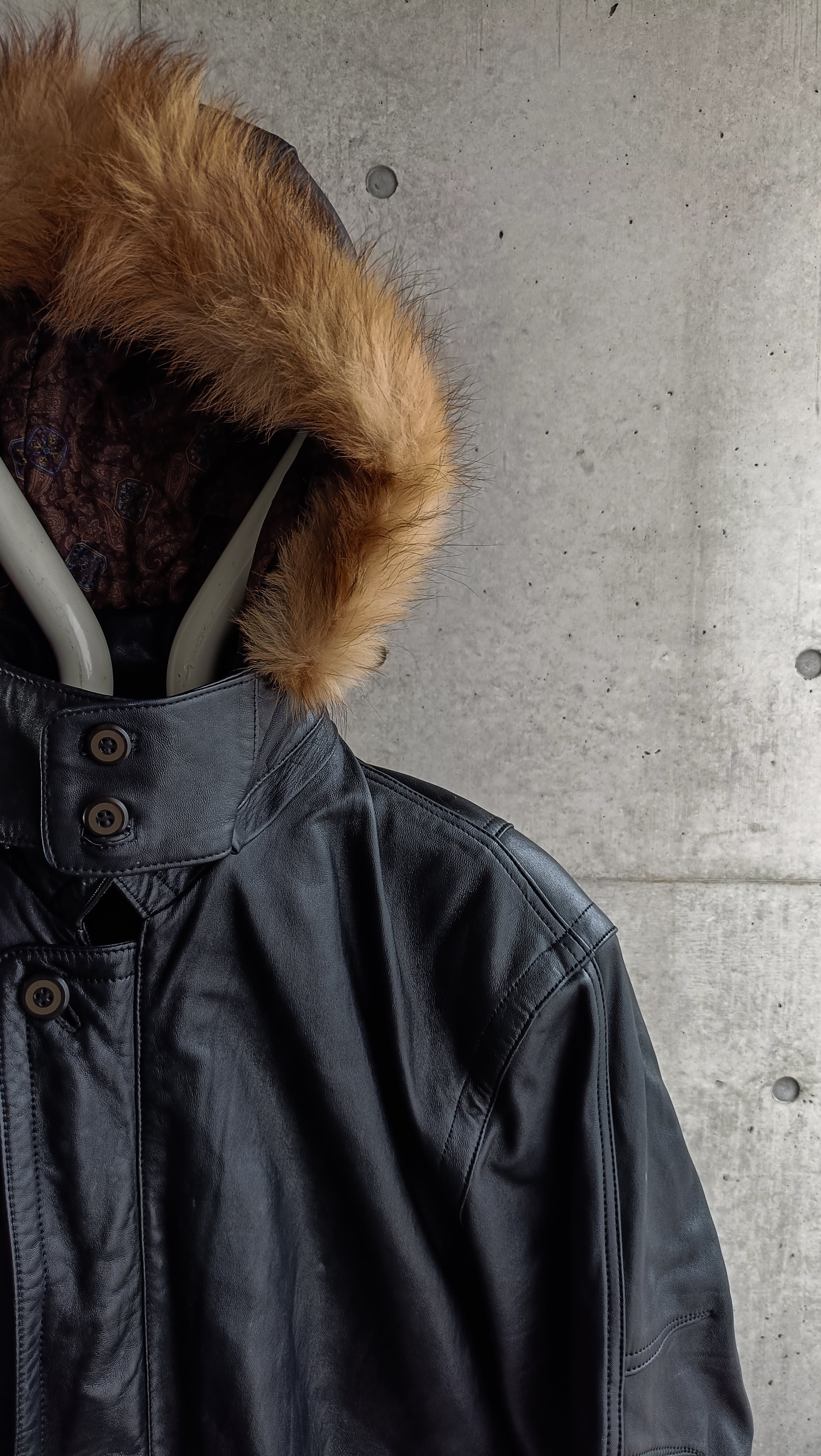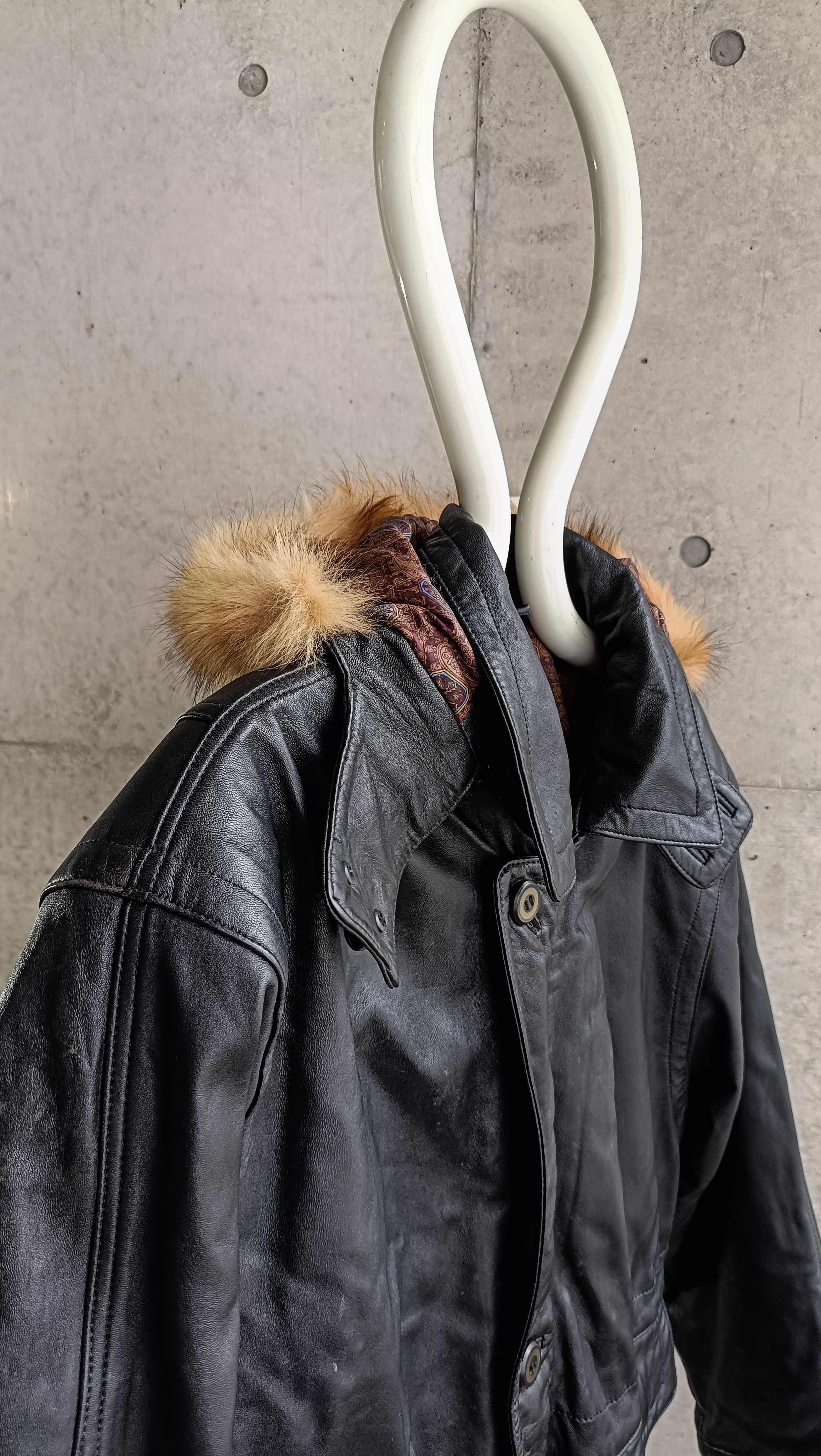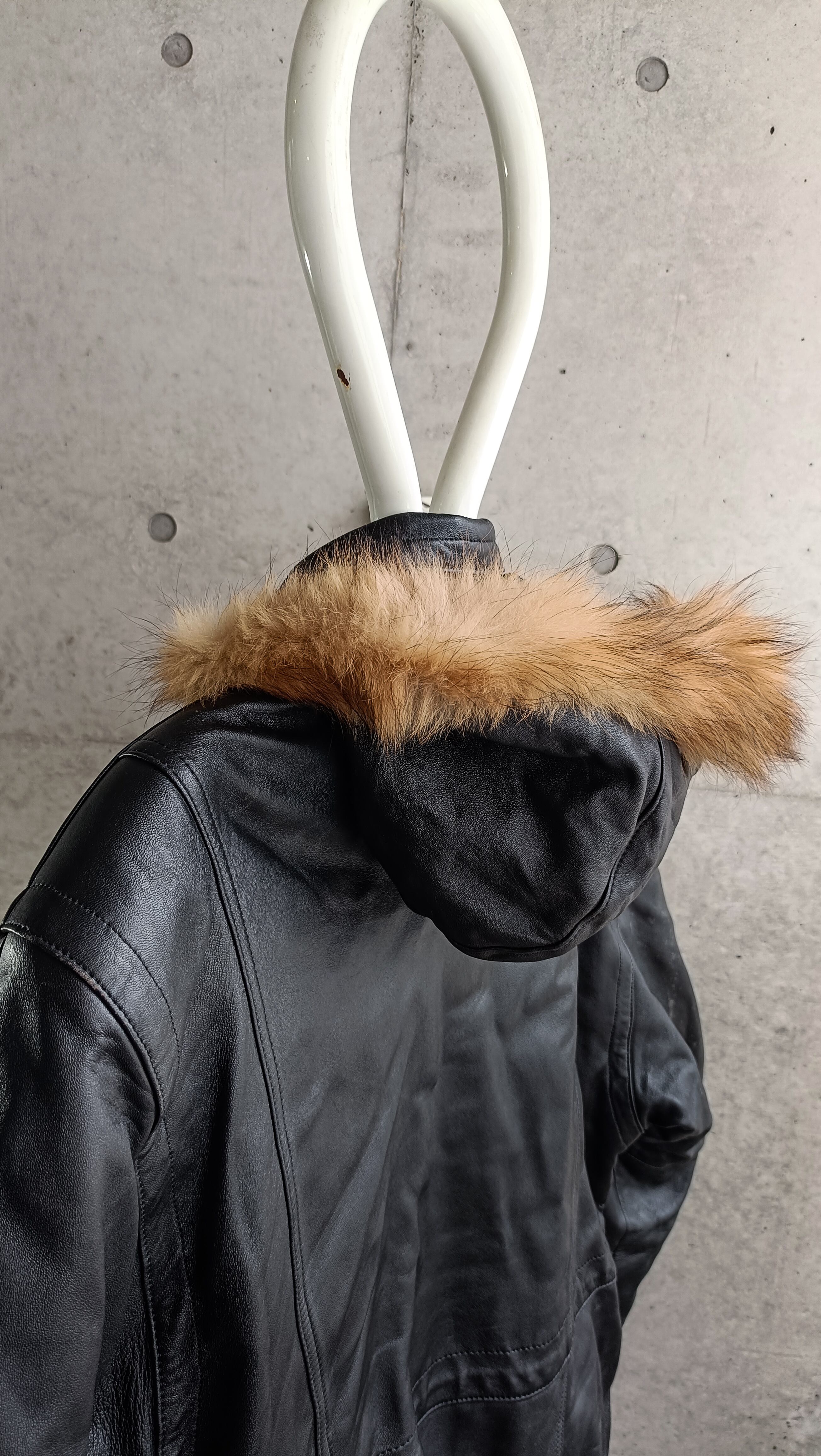 vintage black leather far hooded coat
