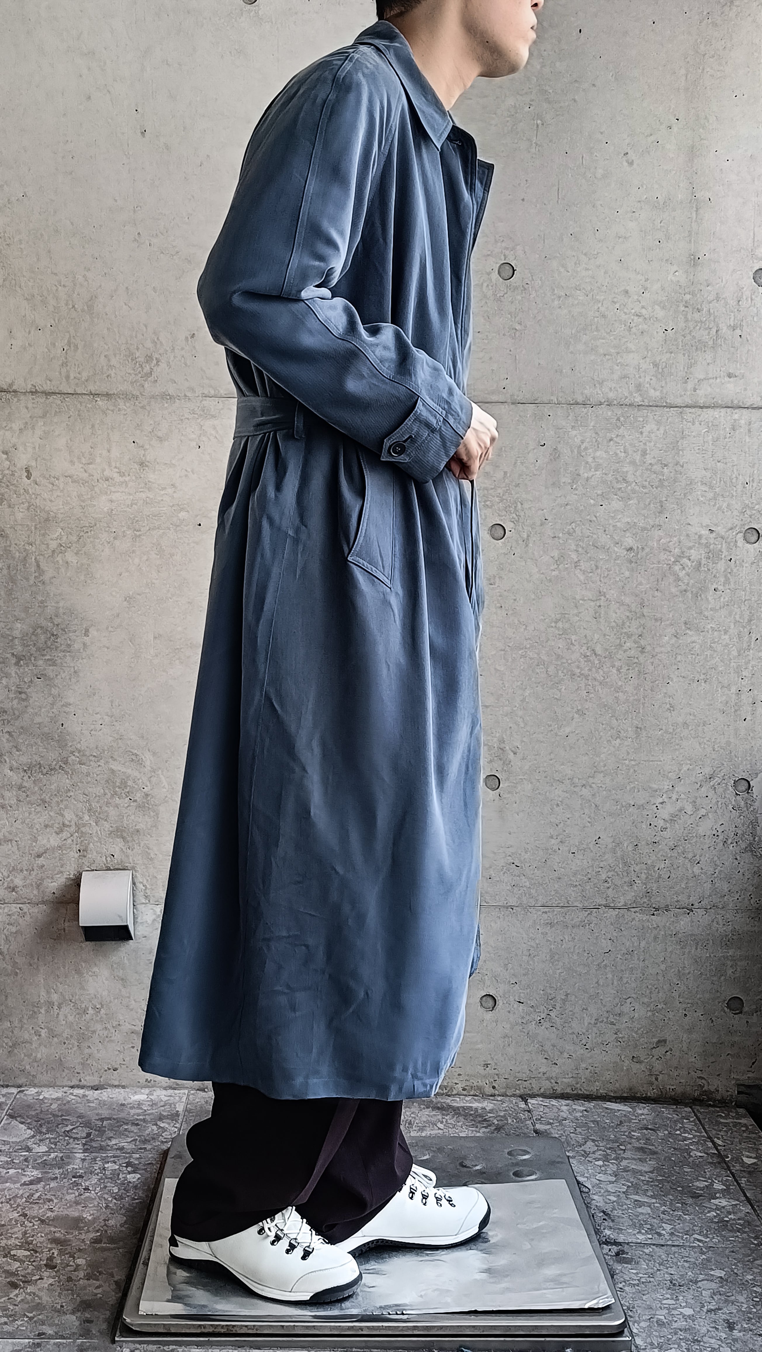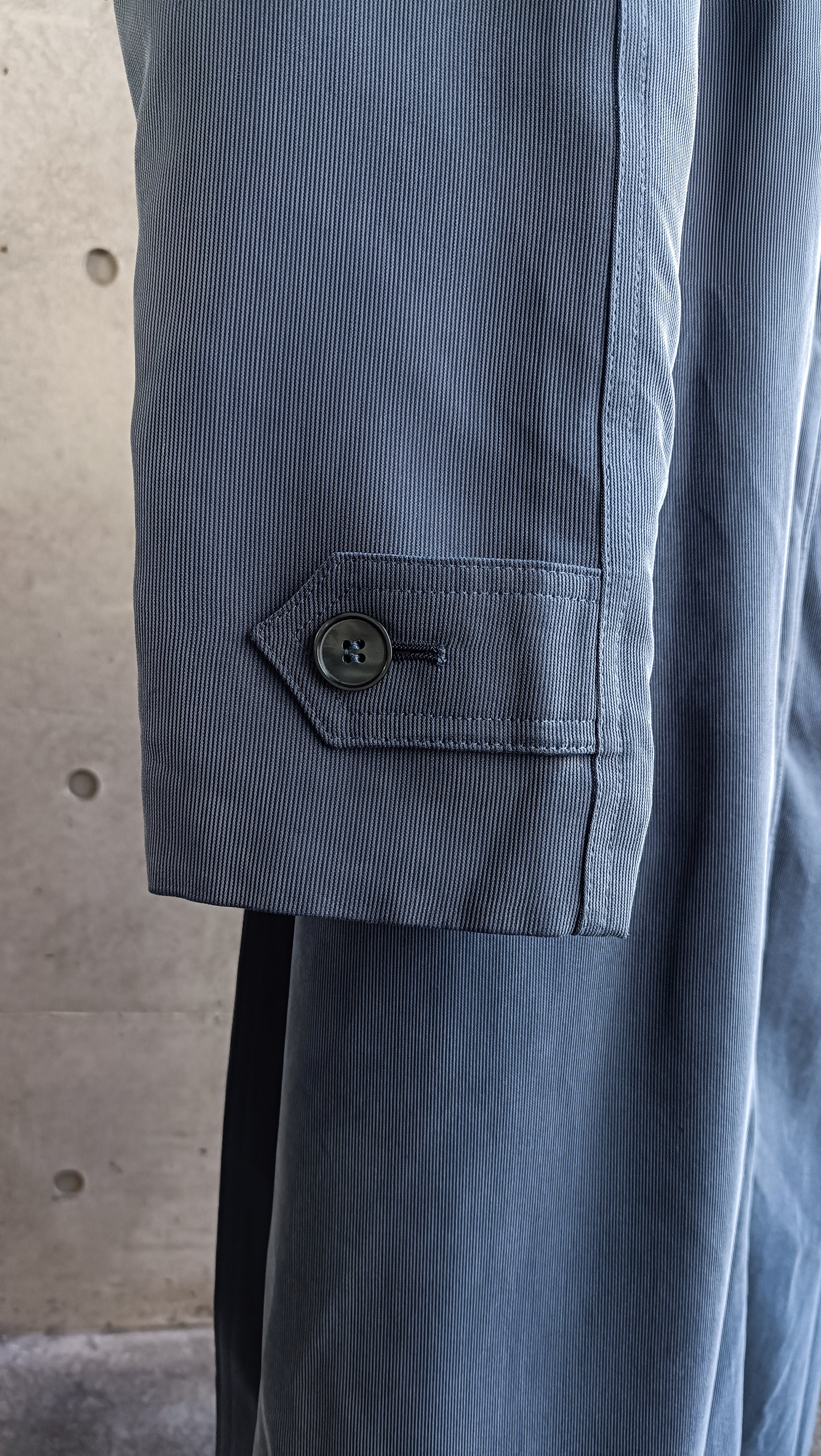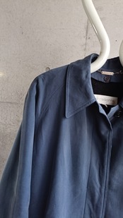 スモーキーブルーのピーチスキンコート。よく見ると黒のストライプが入ったような生地。取り外し可能なウールライナー付き。ラグランでしっかり肩も落ちます。