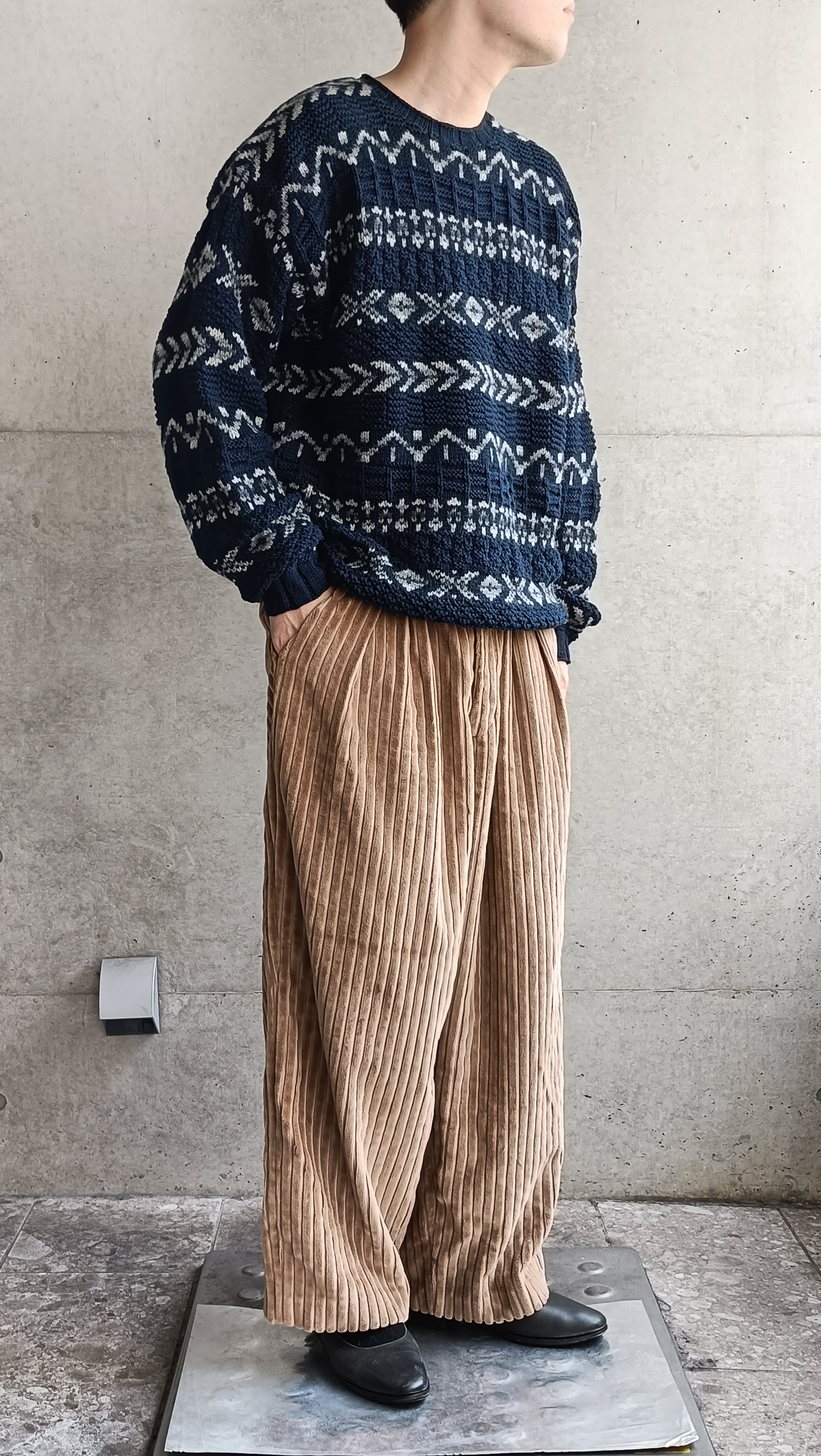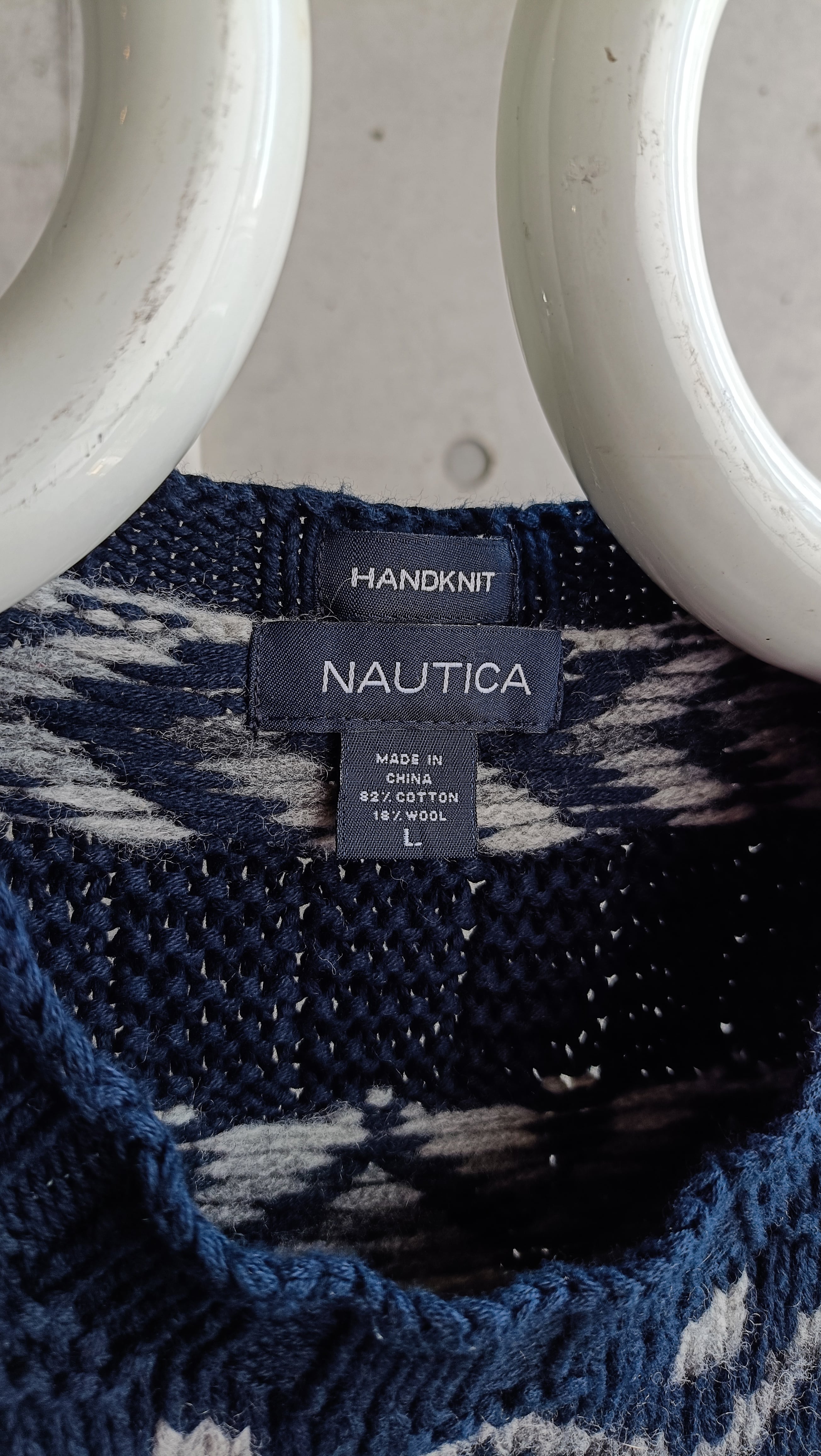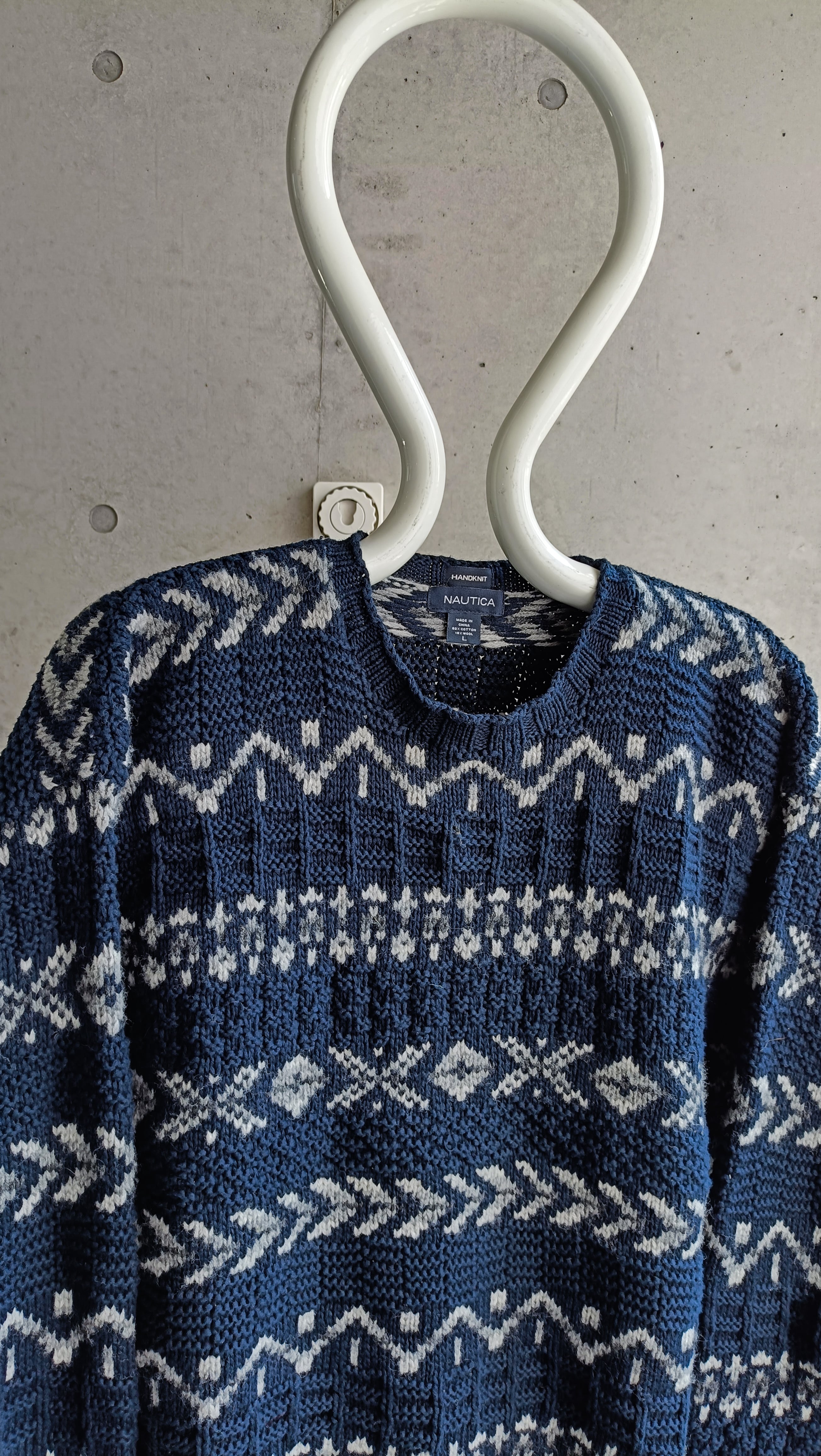 NAUTICAのハンドニットの入荷です。着ると凄く軽く感じるコットンニット。ネイビーベースの総柄パターン。シルエットも凄く綺麗です。