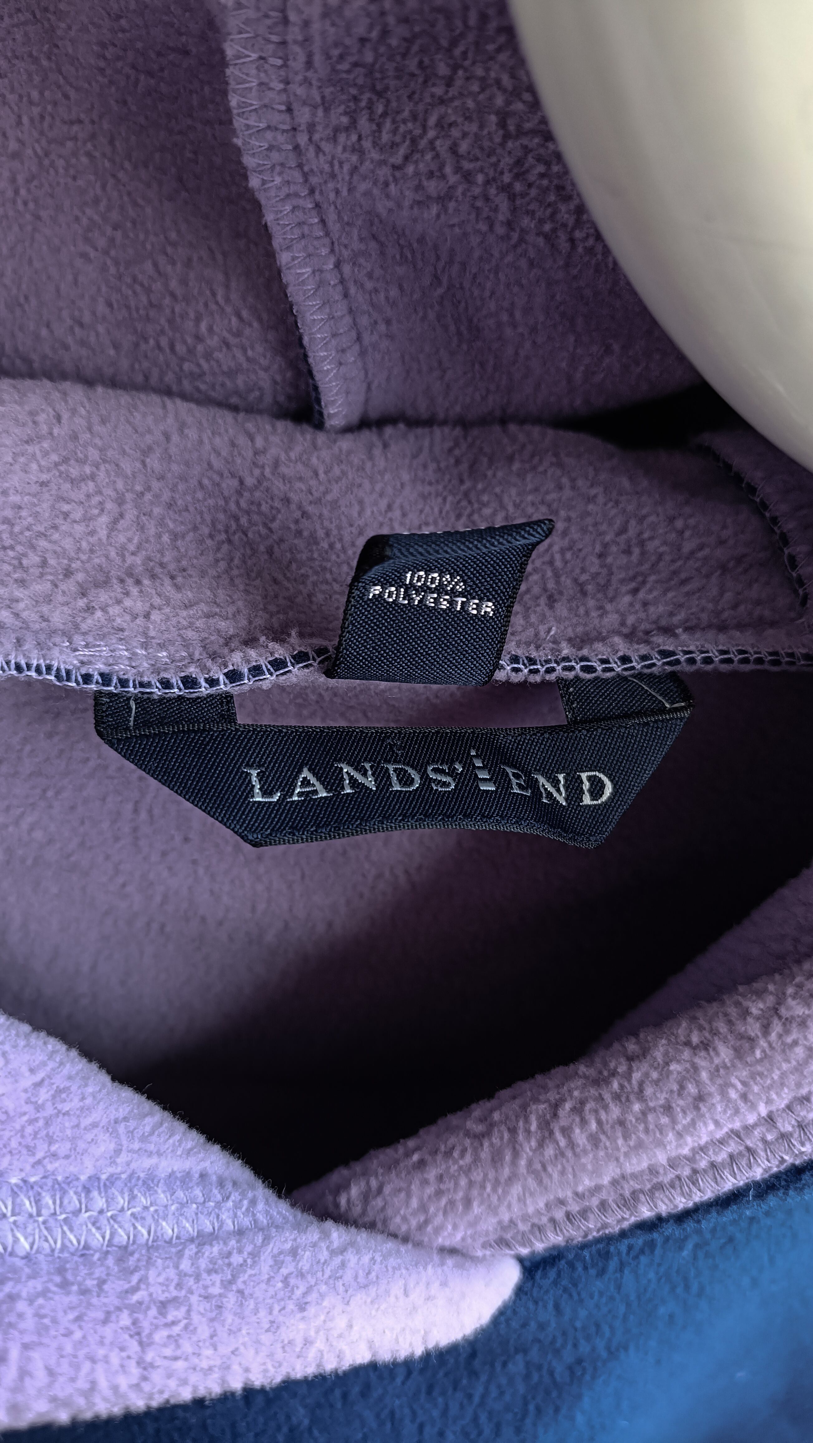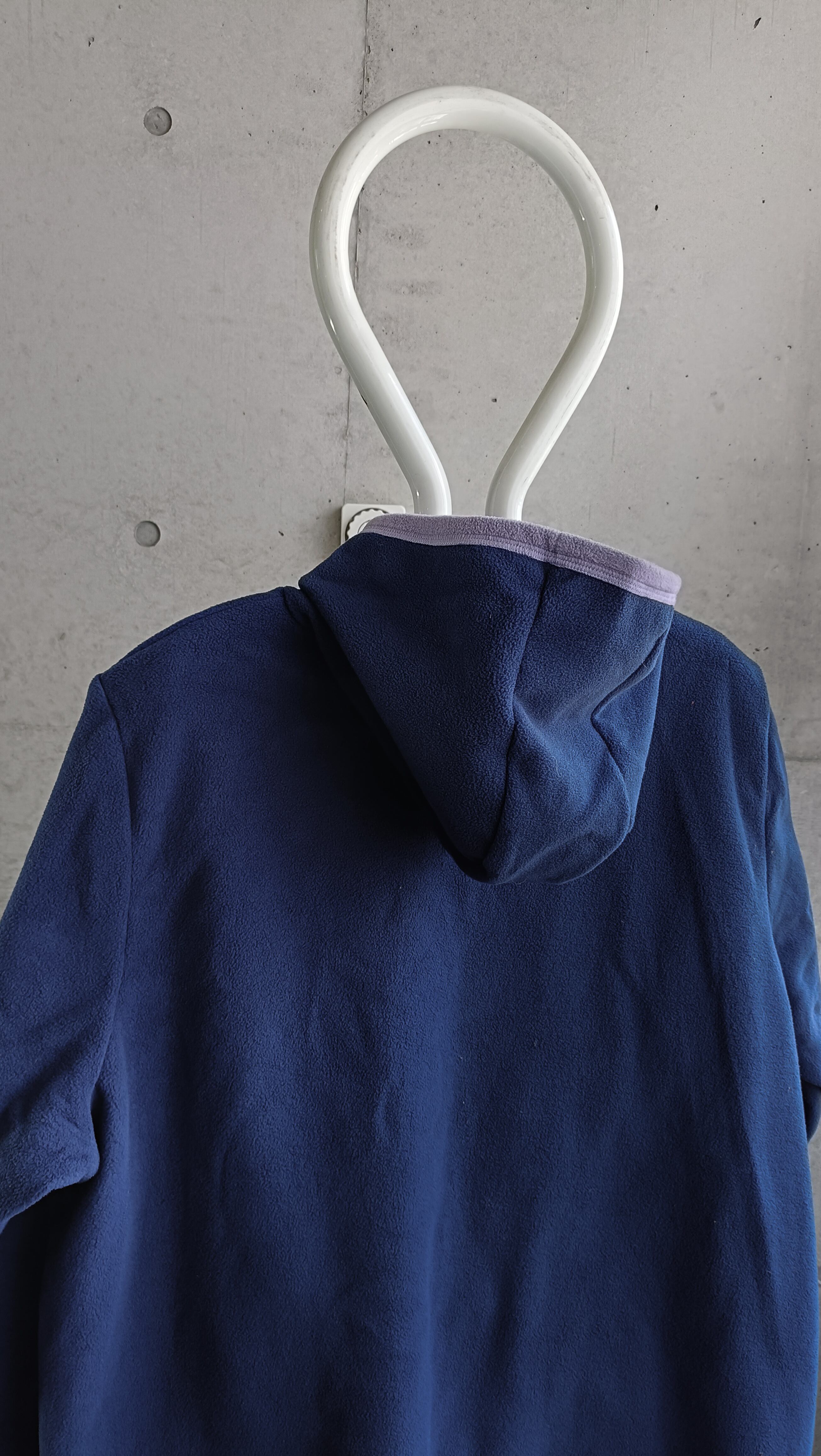 見たことない、ネイビーにパープルのパイピングが入ったカラーリング。フリース生地のフーディーです。リラックスシルエットで、ストンと落ちるシルエットです。