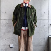 ダークグリーンのレザー切替コート。襟やポケットなどかブラウンのレザー切替です。ラグランで肩もしっかり落ちるシルエット。背面のレザーパイピングも洒落すぎてます。