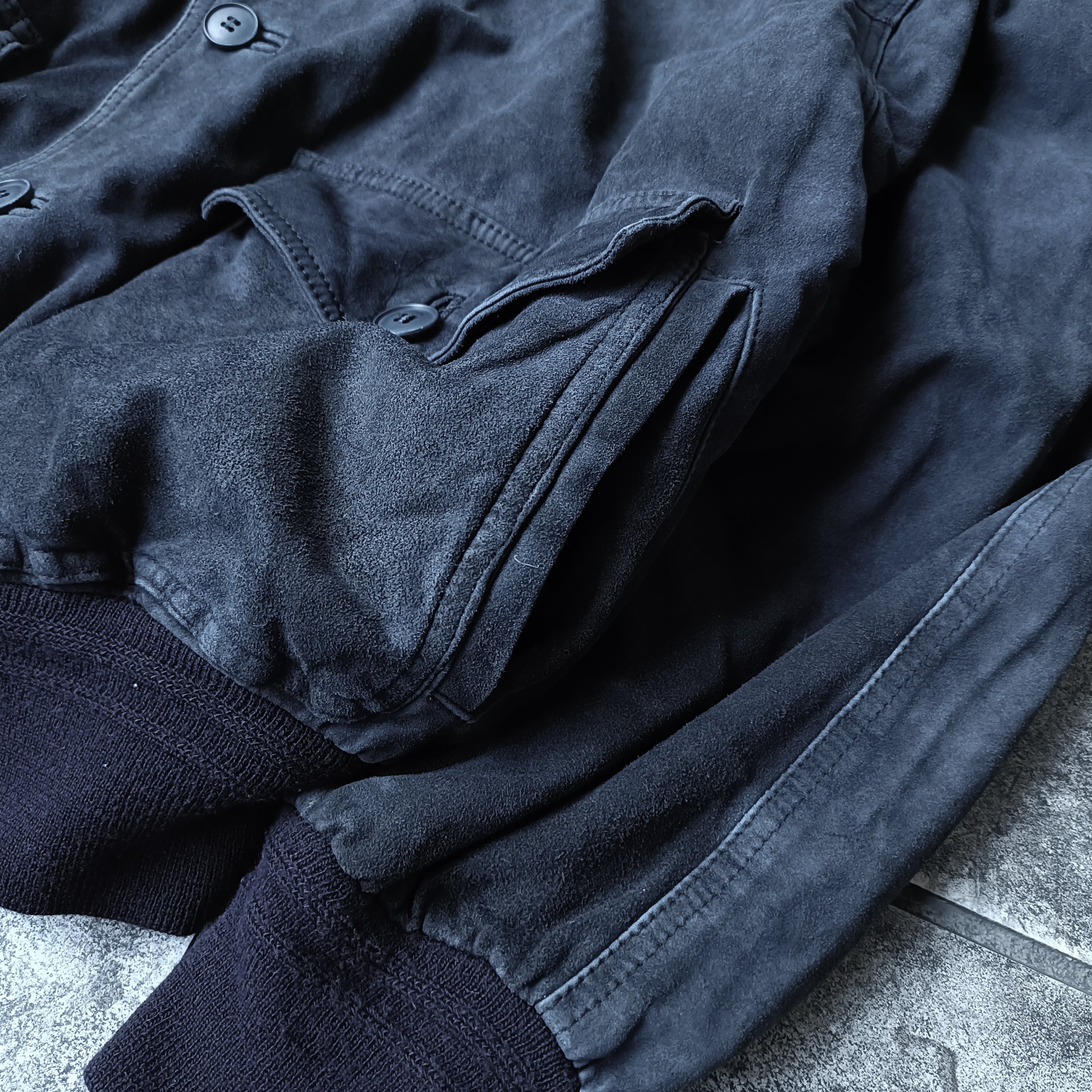 スペシャル。3年ぶりくらいに入荷の黒ヌバックレザーのダービージャケット型。9割以上がブラウン系の色味です。しっかりイタリア製。状態も良好です。裾リブ効いてて短丈でも着れるシルエット。