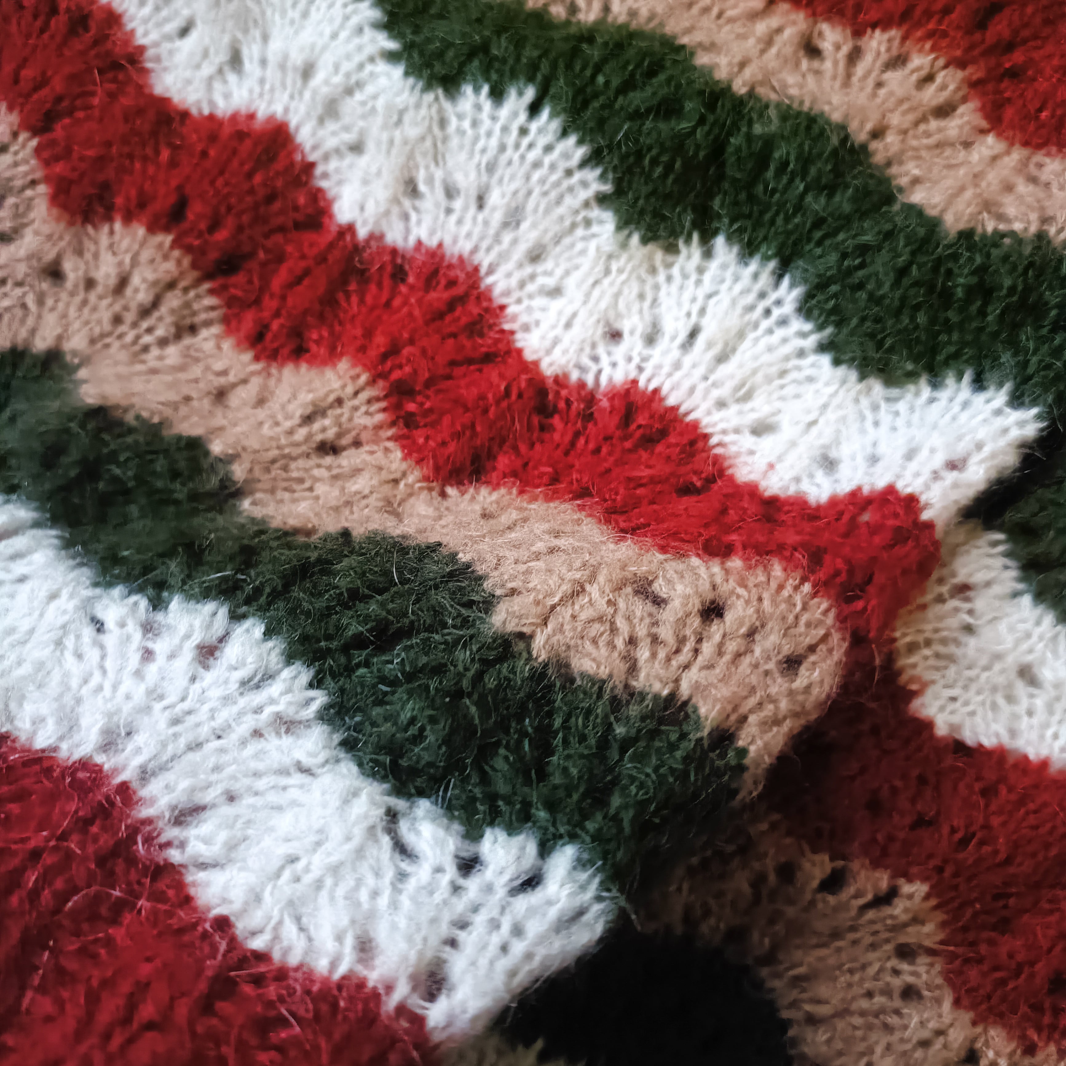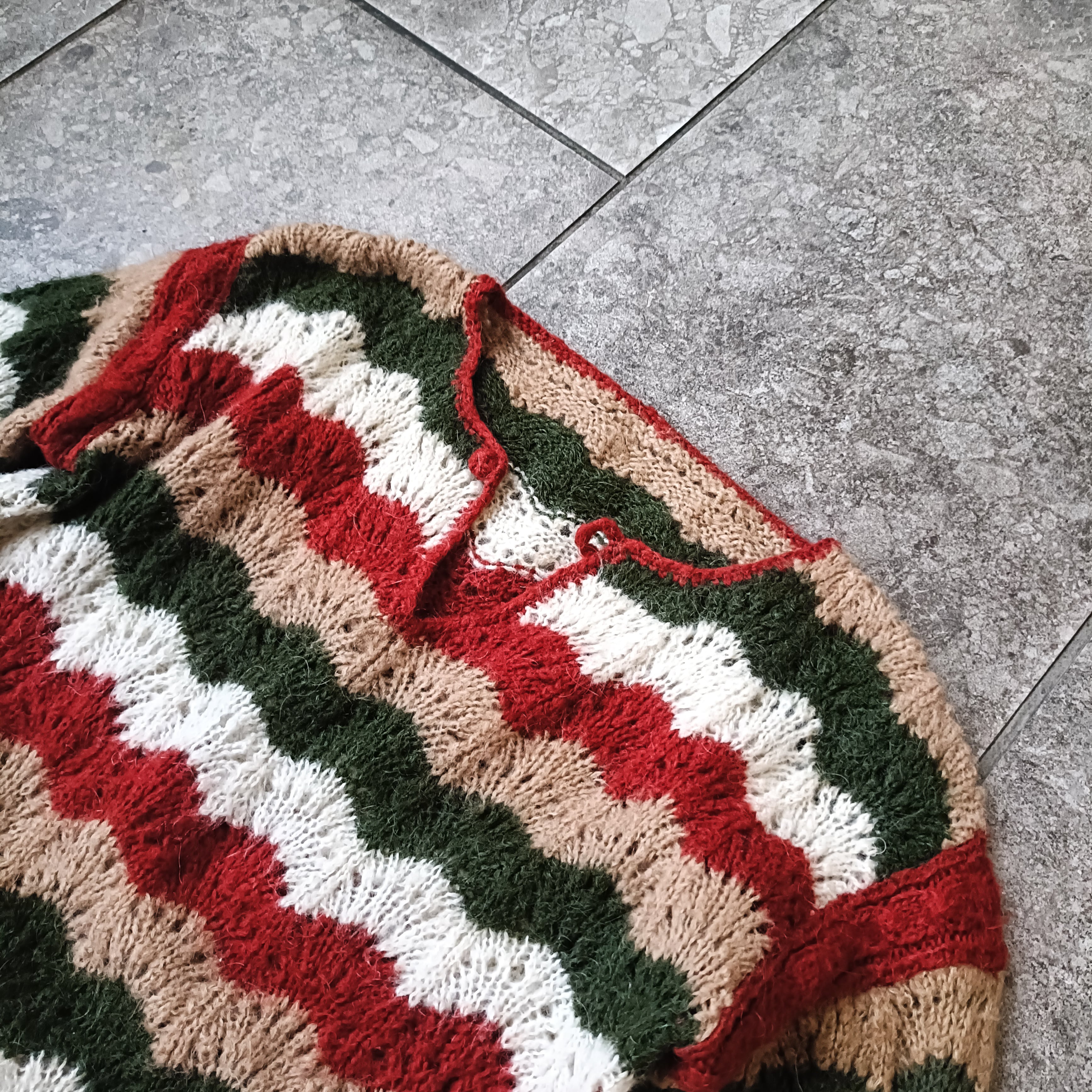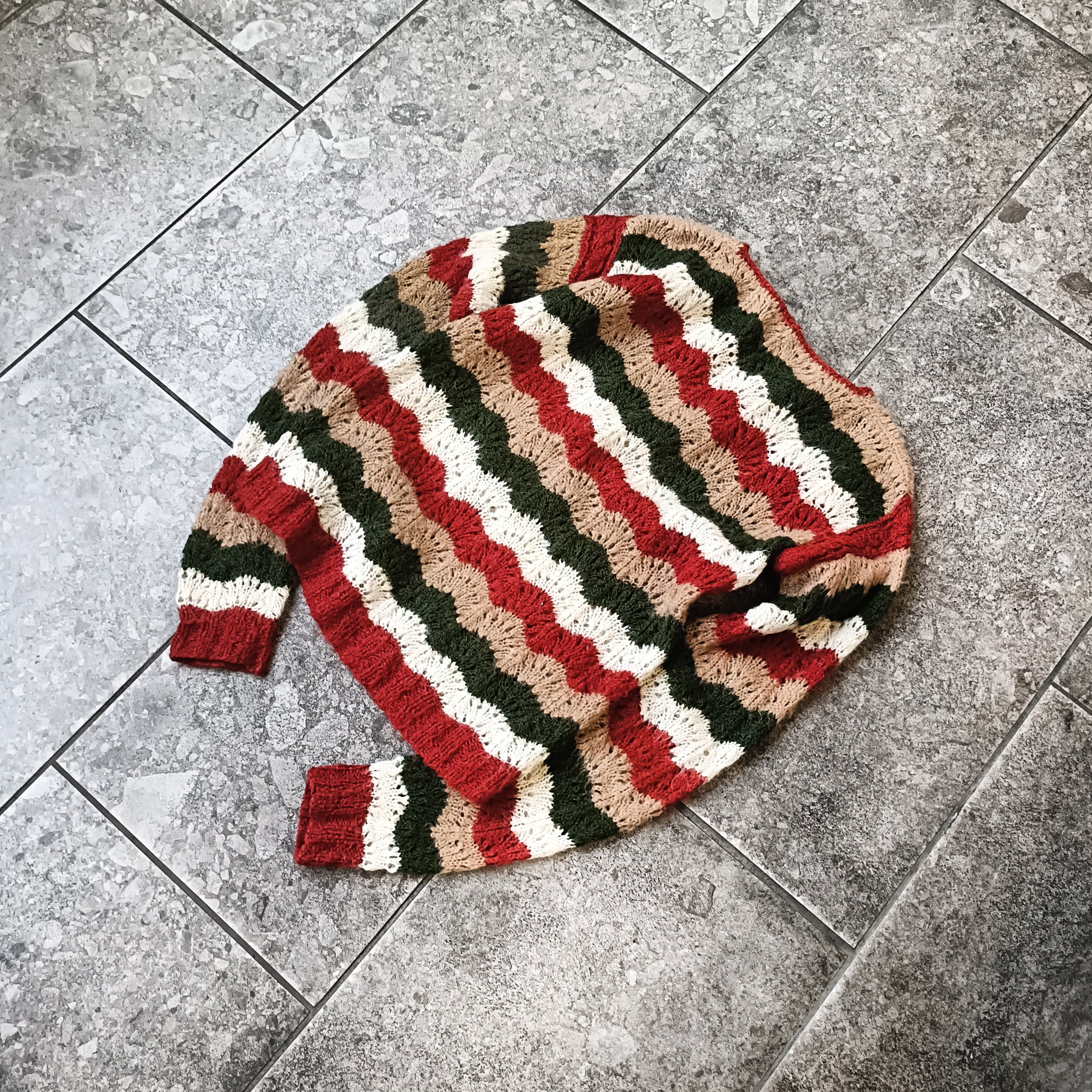 赤、緑、白のボーダーニット。首元がヘンリーネック仕様でボタンで留めれる仕様。開けて着るのもオススメです。波型のボーダーなのもポイントです。細身のメンズ、レディース向けサイズ。