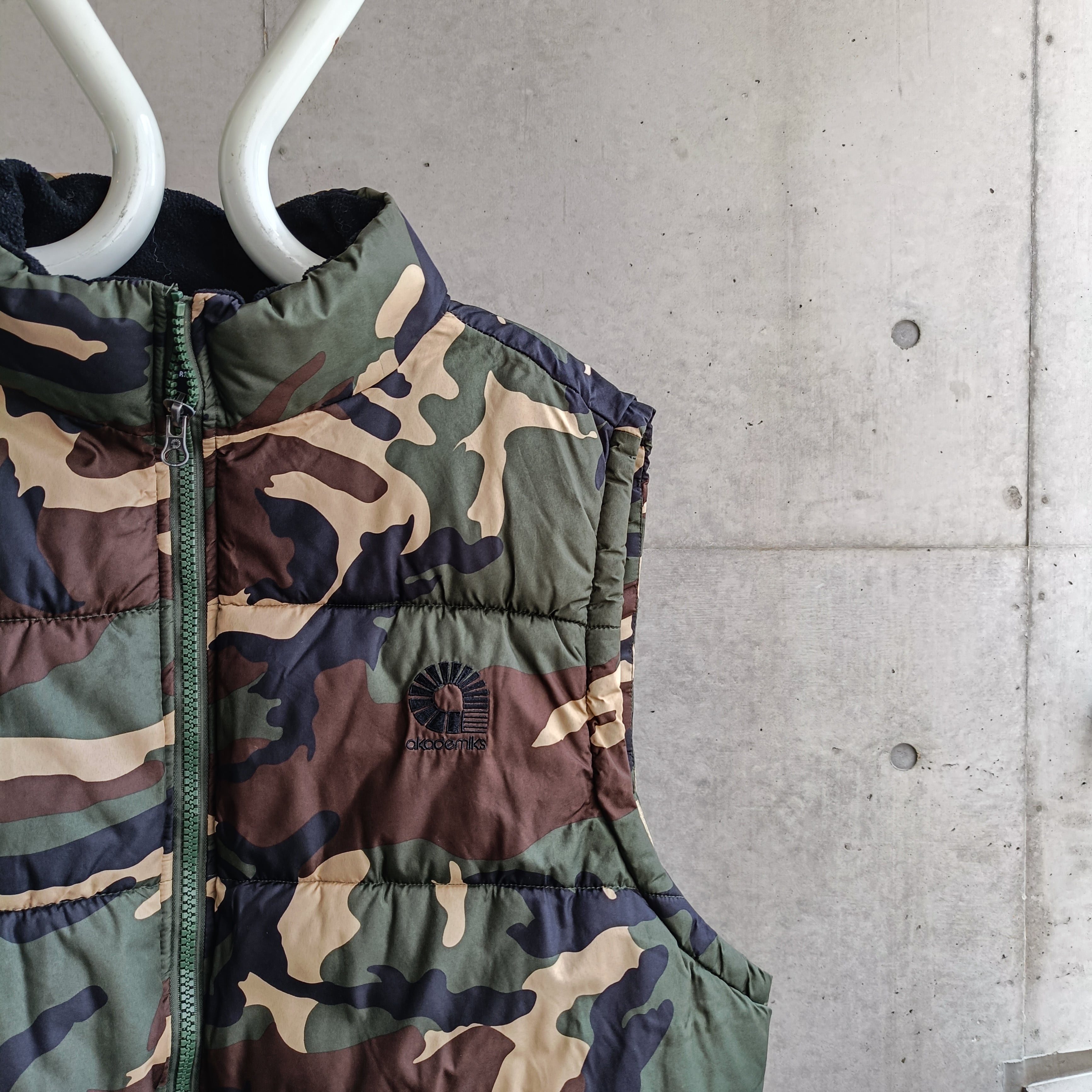 オーバーシルエットのダウンベストの入荷です。カモフラ柄で、このシルエットなのが良くてピックしました。裾にドローコード付き。アウターの上からも羽織れます。