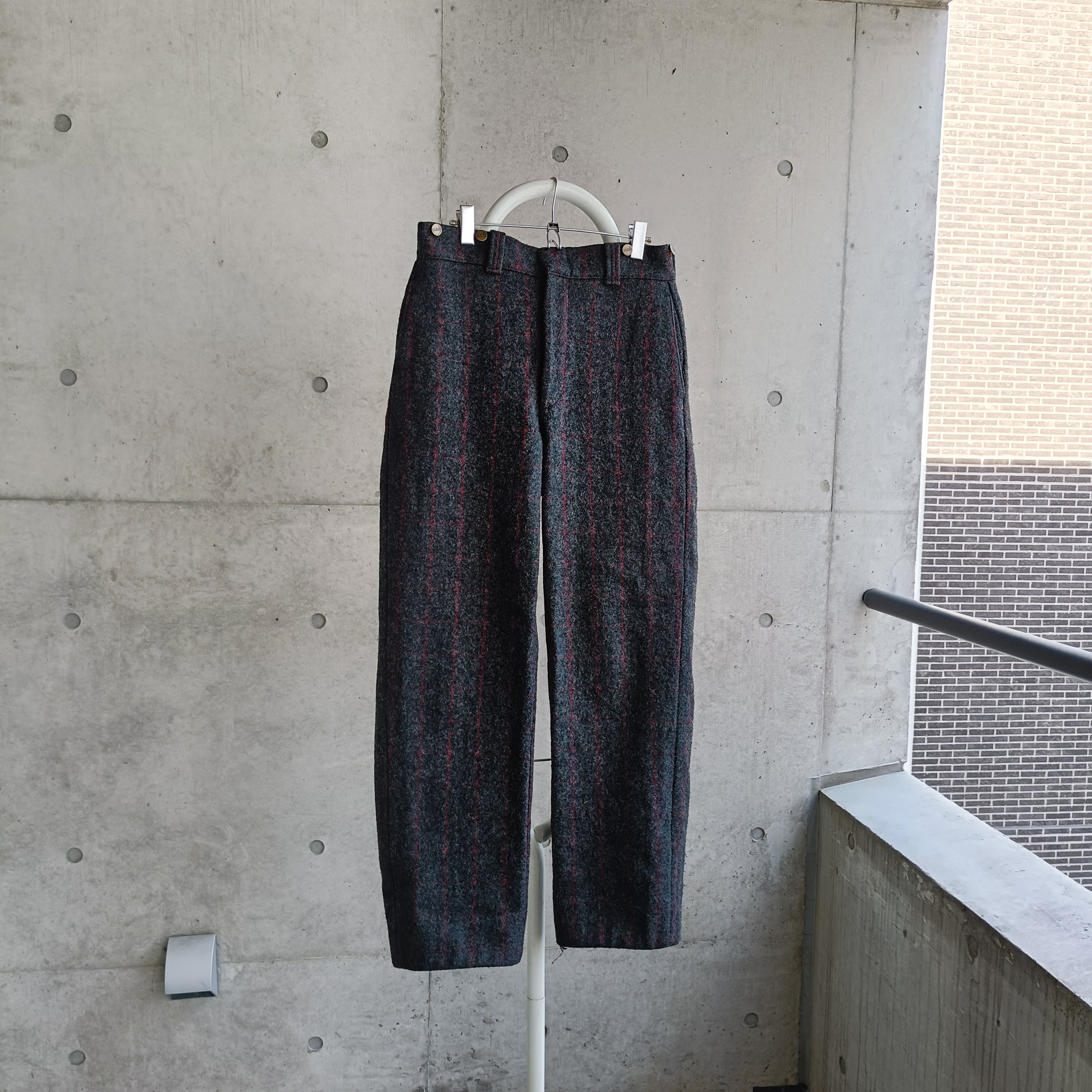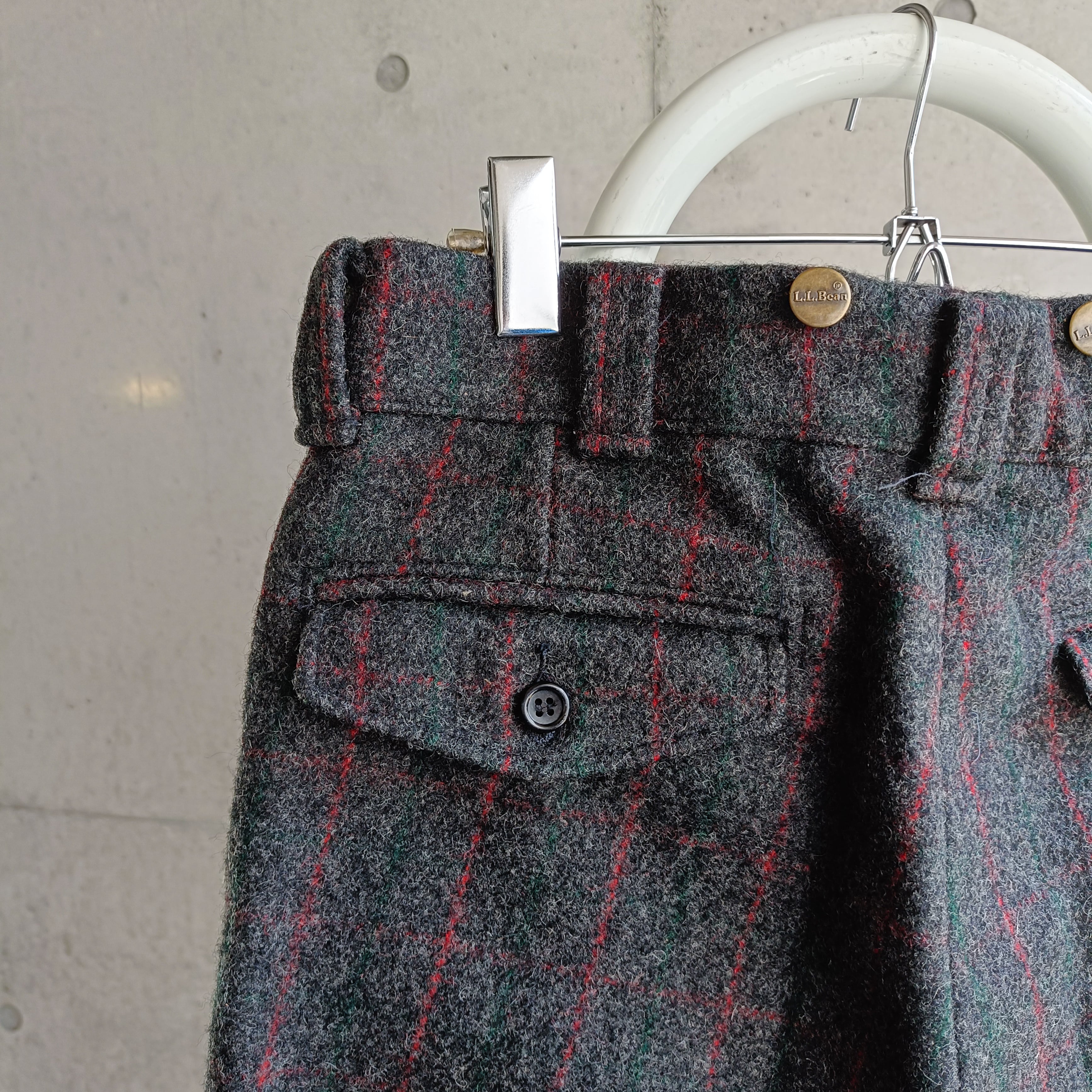 80s頃のL.L.Beanのウールパンツ。チャコールカラーに薄い赤とグリーンのチェックパターン。ストンとしたストレートシルエット。ボタンもロゴ入りオリジナルです。細身のメンズ向けサイズ。