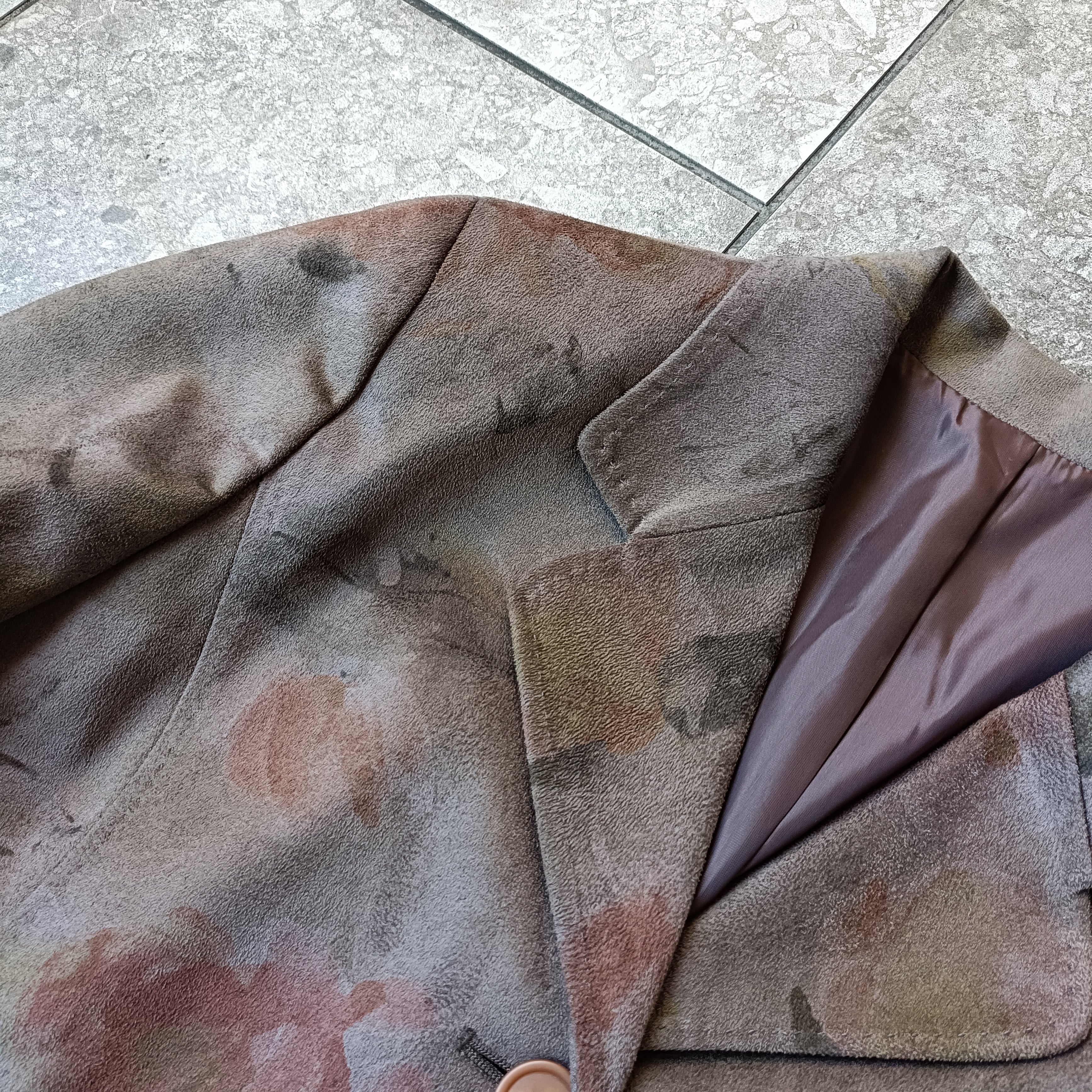 水彩ペイントのような花柄デザインのフェイクスウェードジャケット。めちゃくちゃ雰囲気あるジャケットです。ポケットはパッチポケット。小柄なメンズ、レディース向けサイズです。