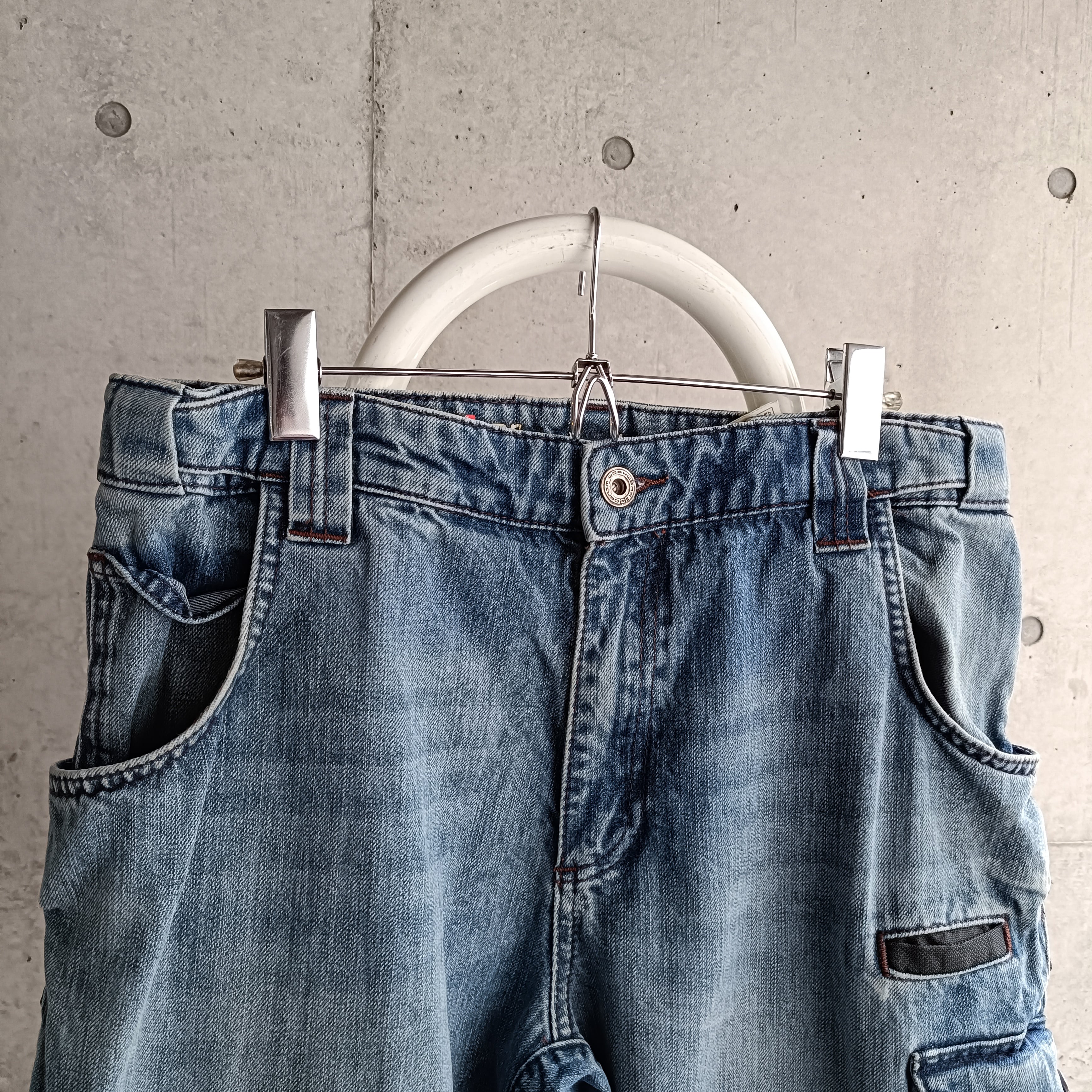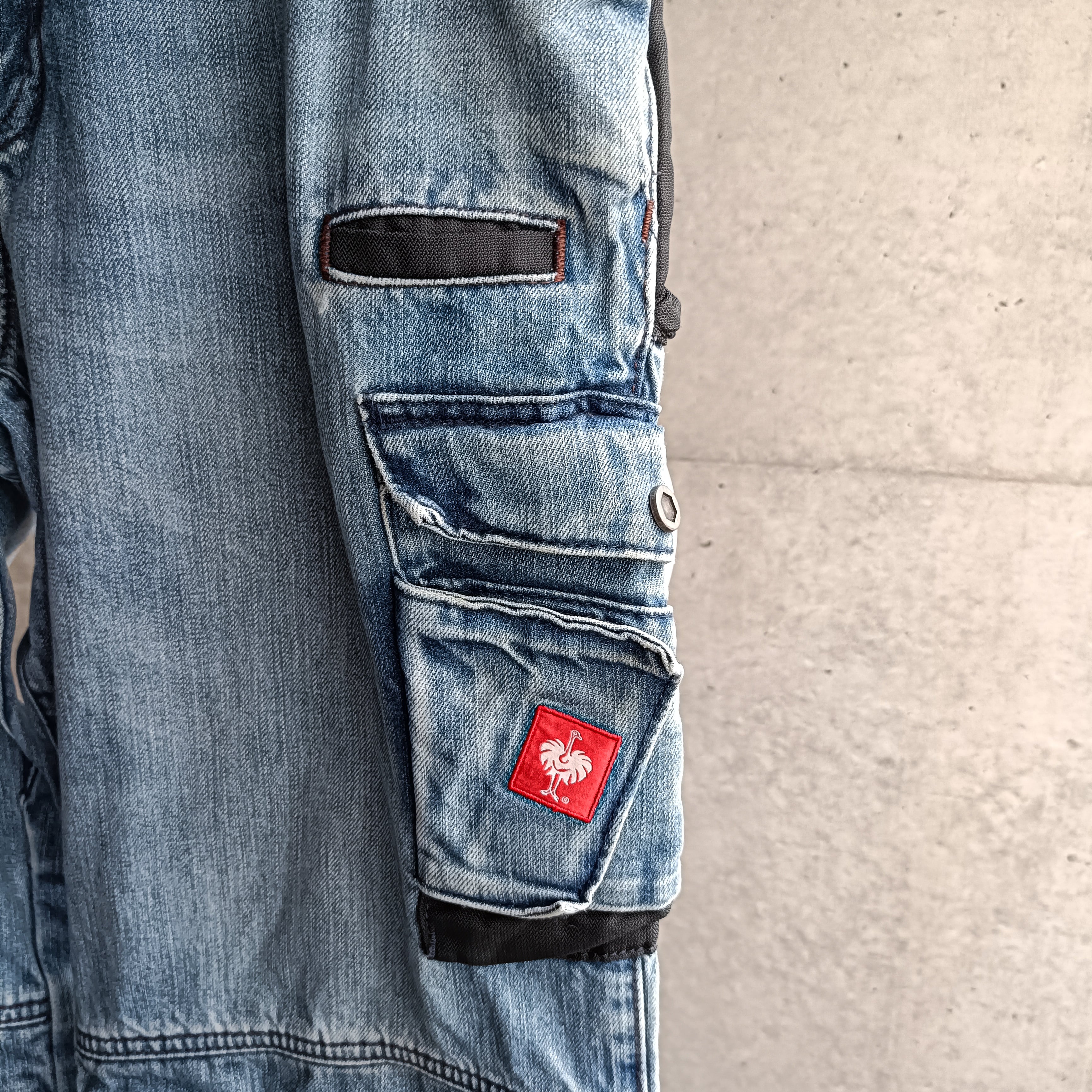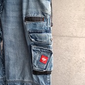 ユーロ物のデニムワークパンツ。デニムとコーデュラナイロン生地の切替パターン。後ろポケットもアシンメトリーな切替パターンです。膝にはアクションタック入り。
