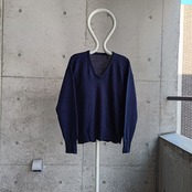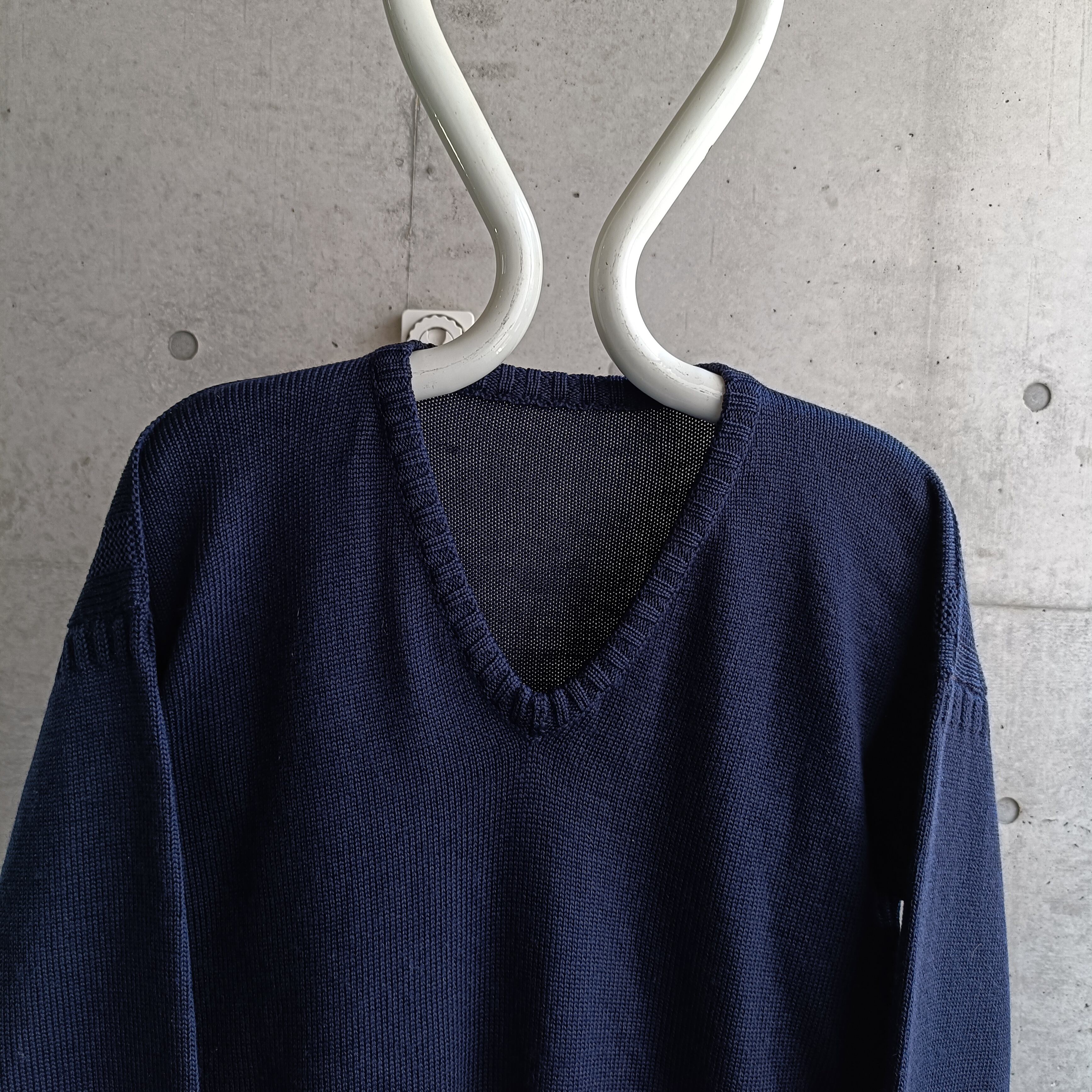 ネイビーカラーのガンジーセーターの入荷です。珍しいVネックとUネックの中間のような首の空き具合。適度に緩く着れて綺麗なシルエットです。