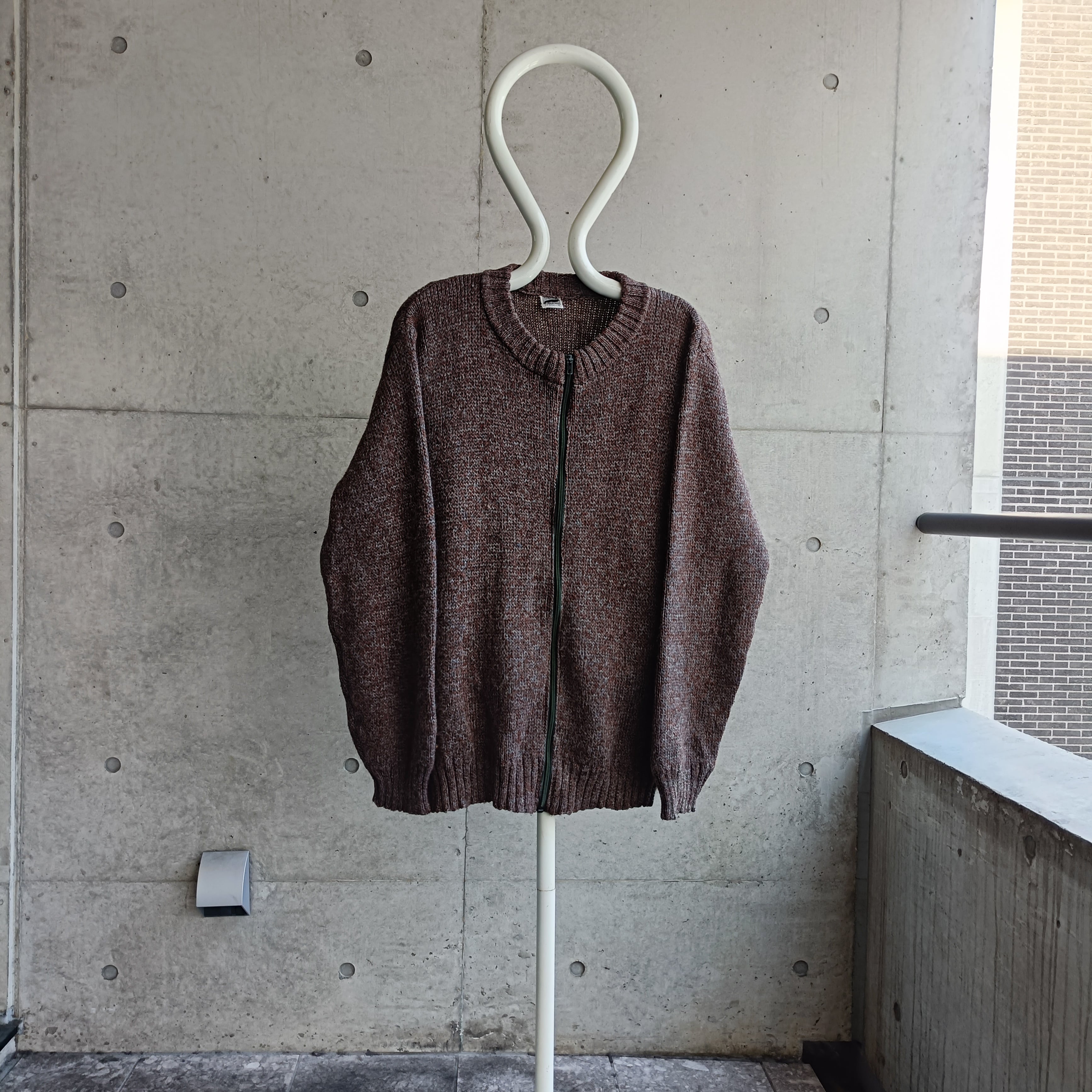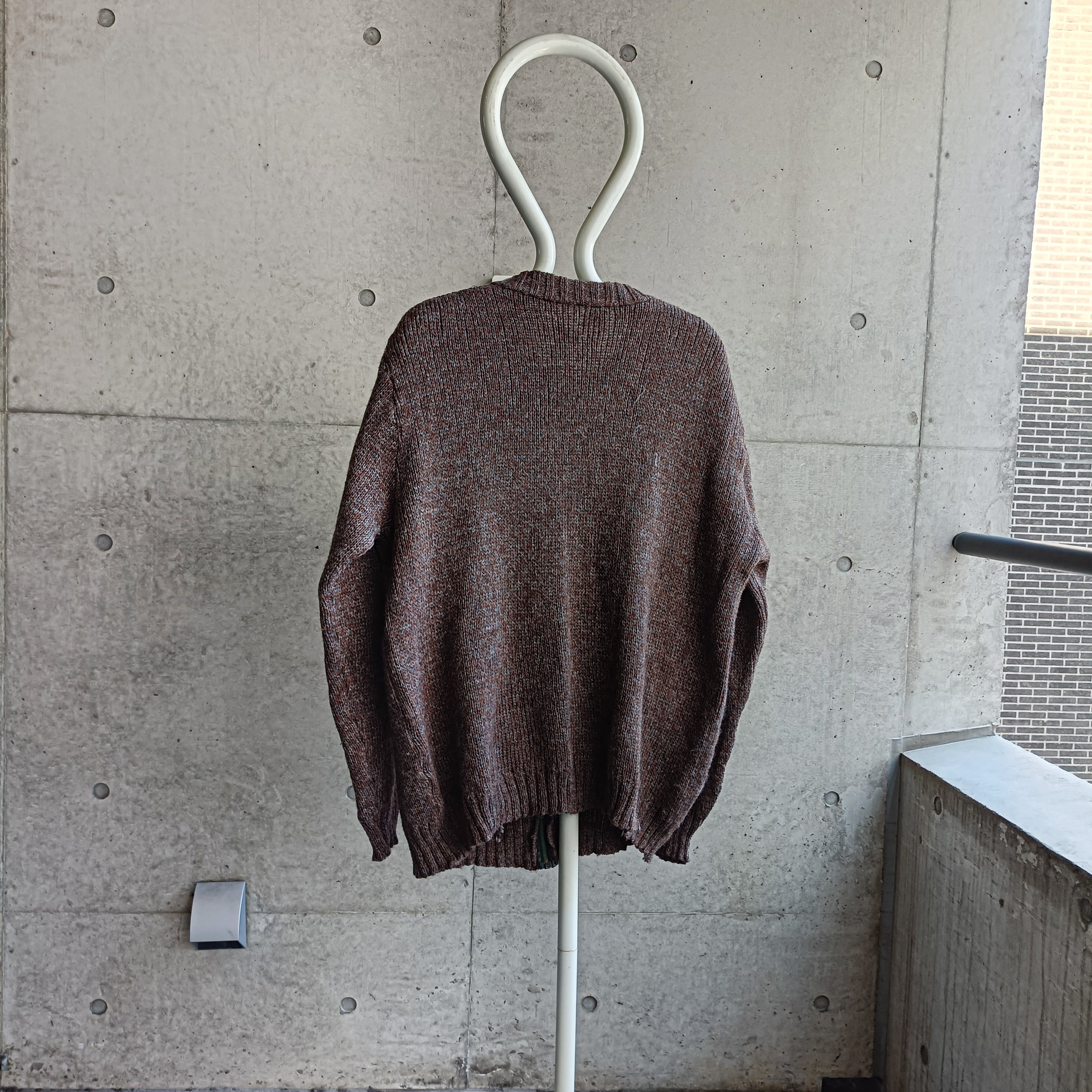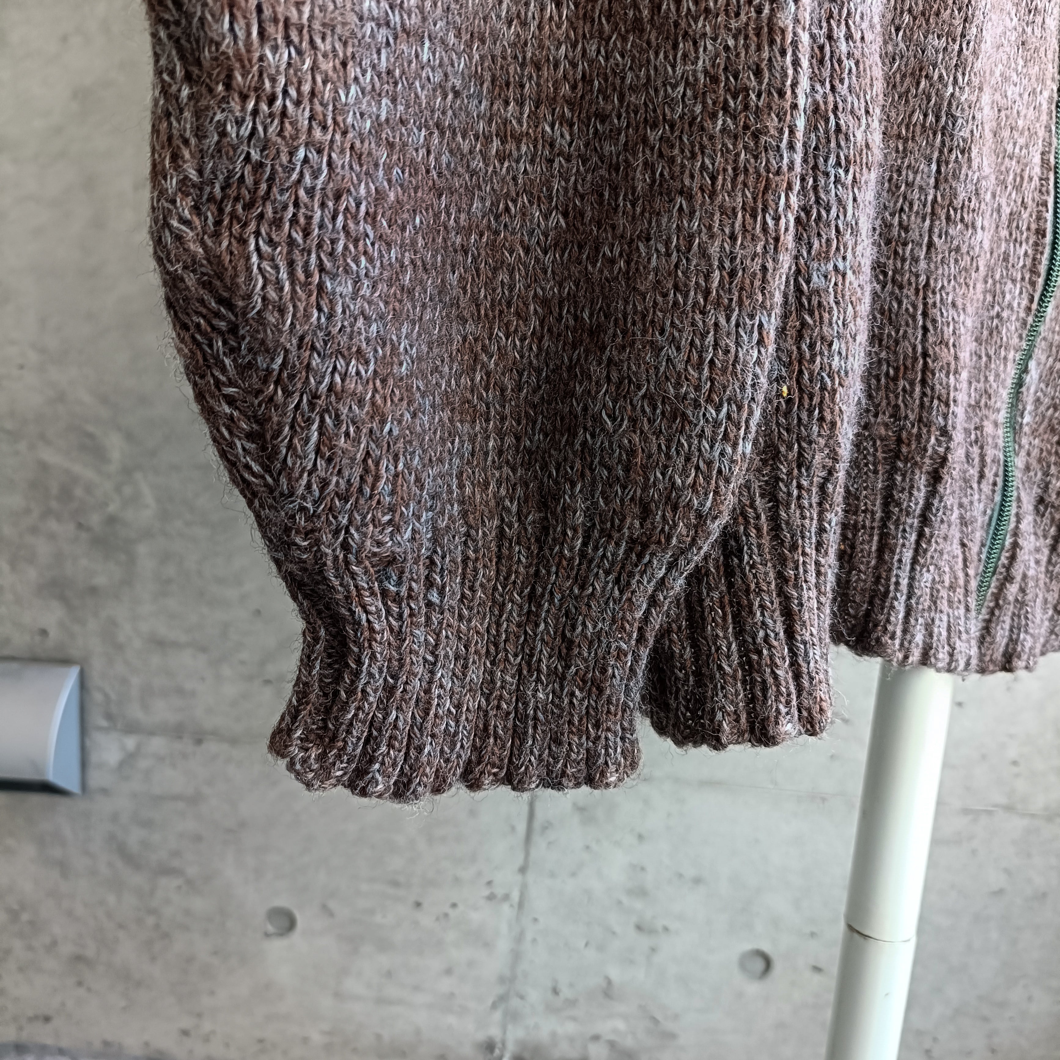 ユーロ物。ブラウンとターコイズのミックスカラー編み。フルジップタイプのニットです。開けてラフに着ても、全締めで普通のニットのように着るのができてオススメです。