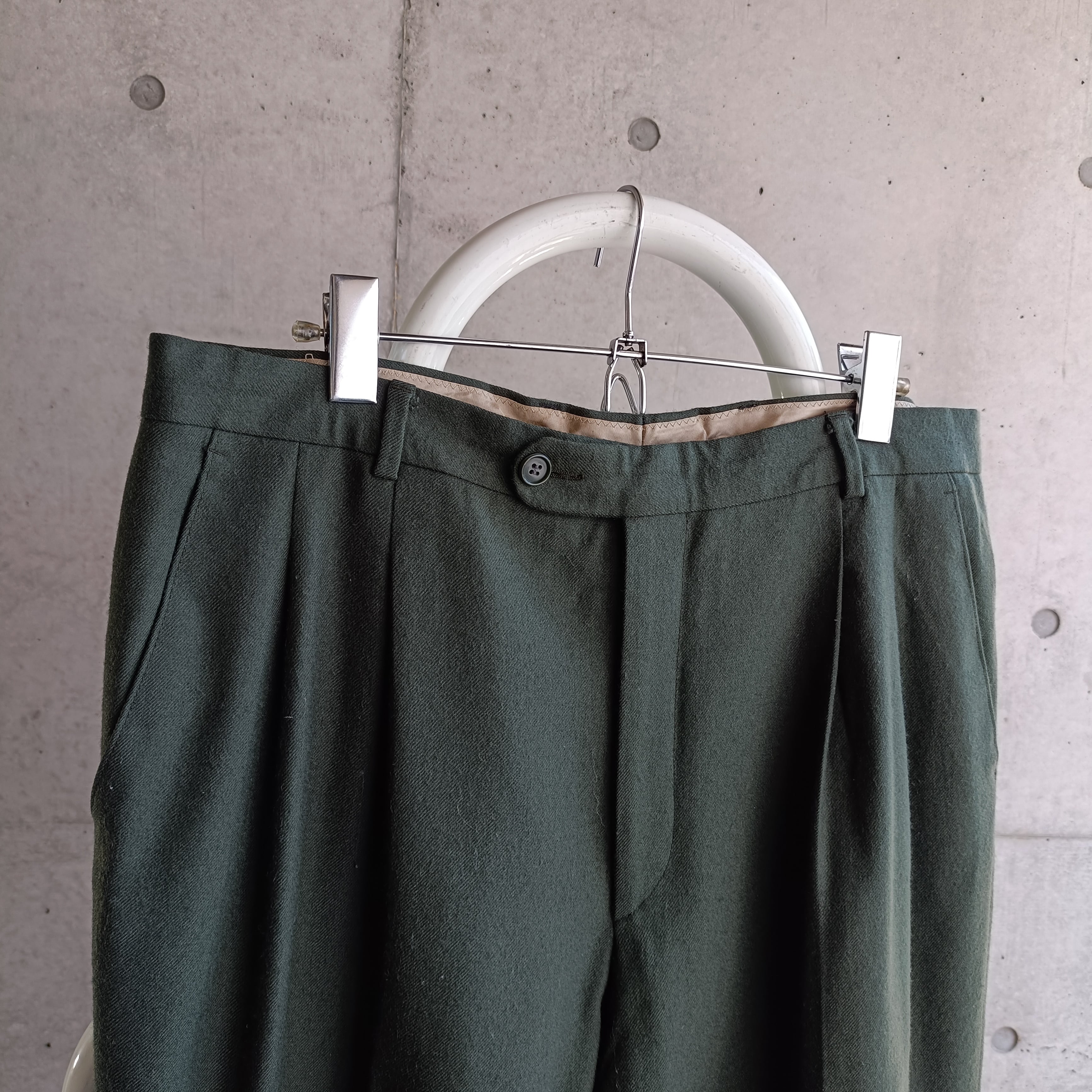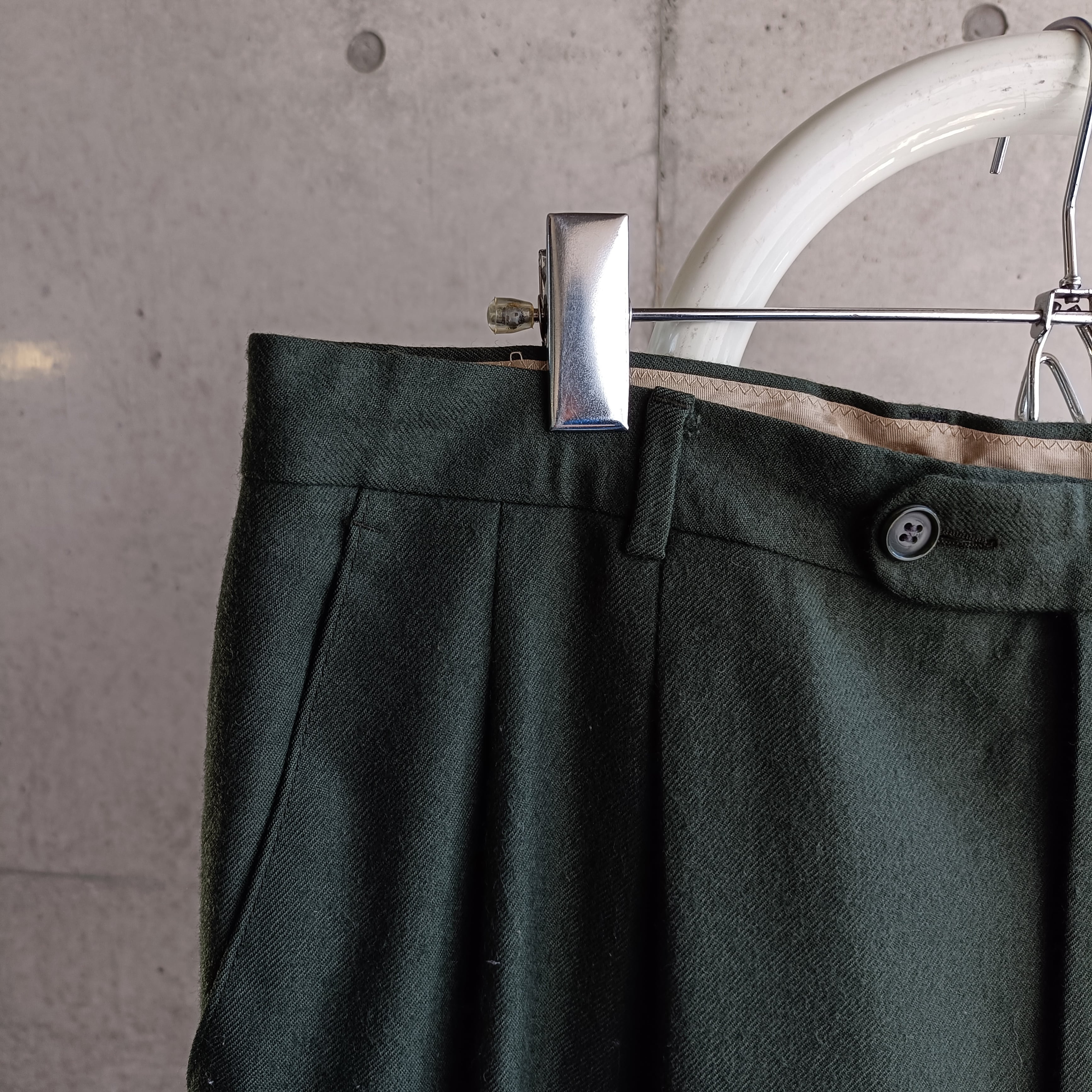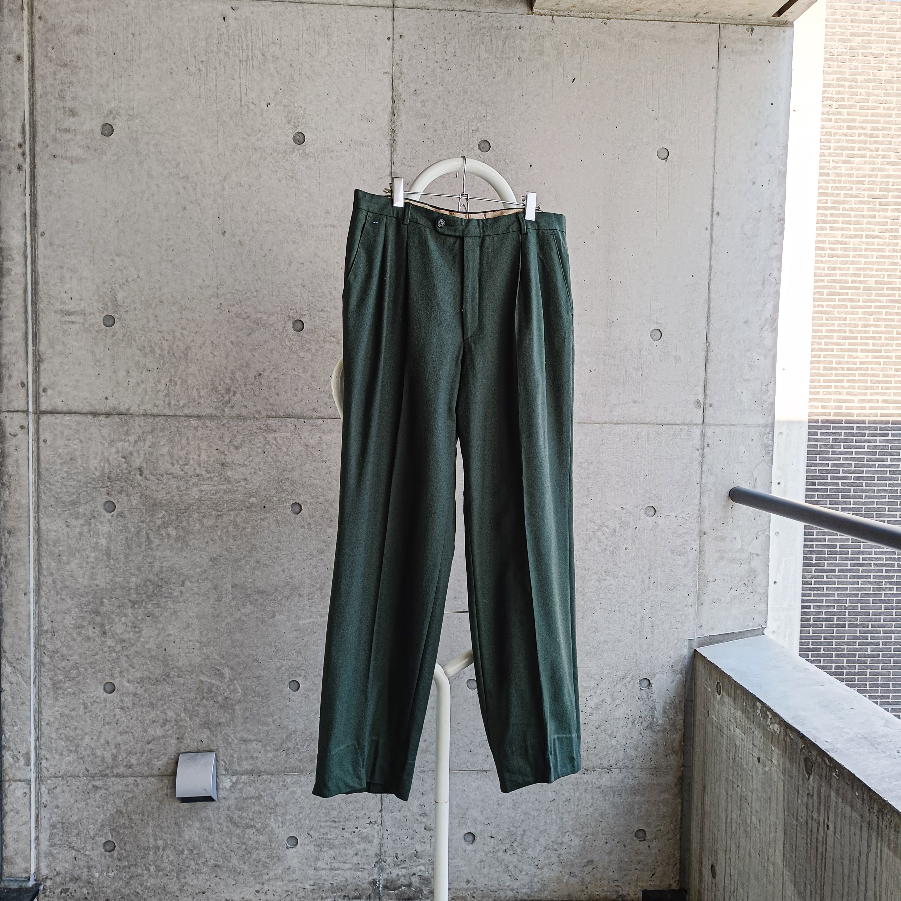 イタリア製のスラックス。希少なフランネルウール生地のスラックスです。色味はモスグリーン。2タック入り。シルエットも凄く綺麗です。