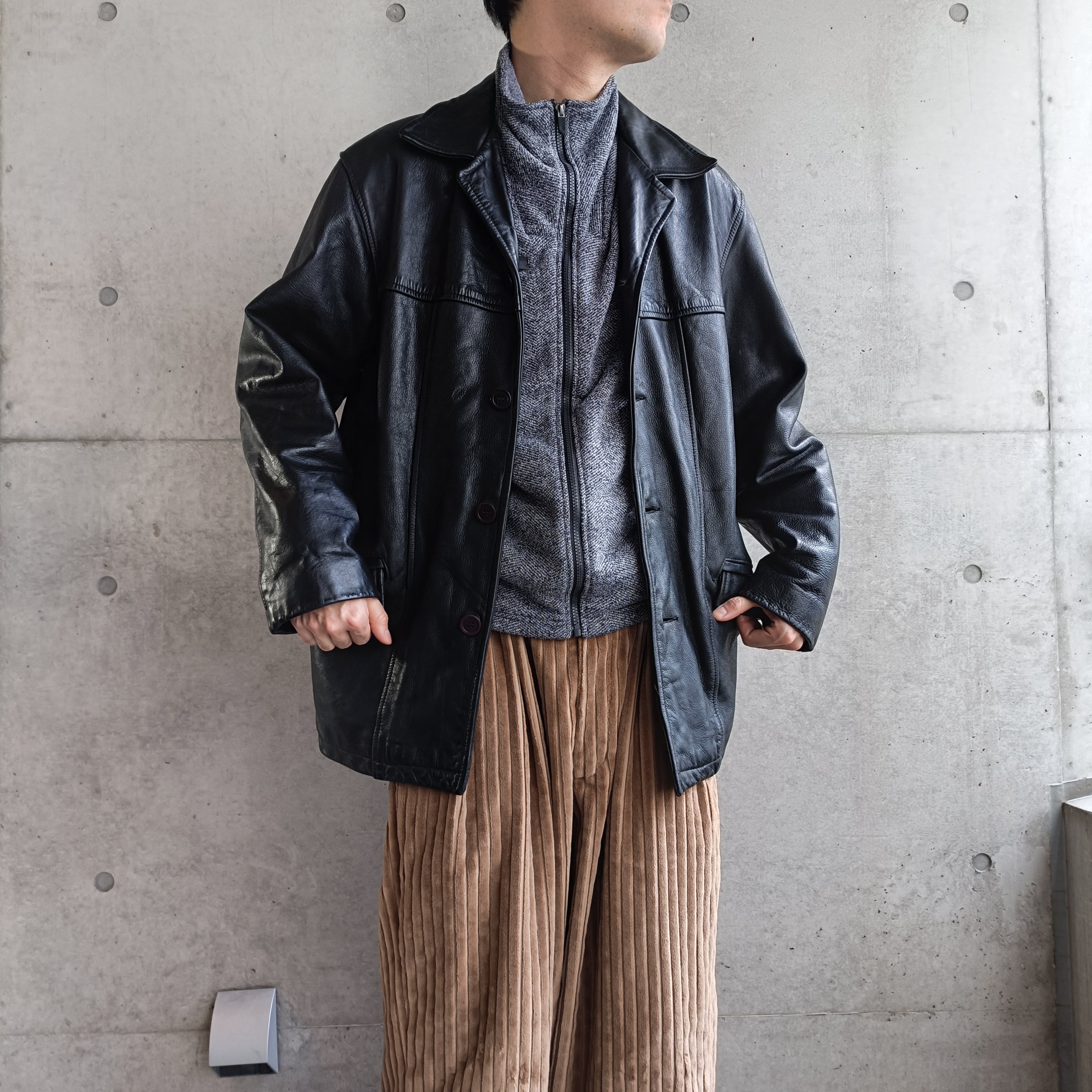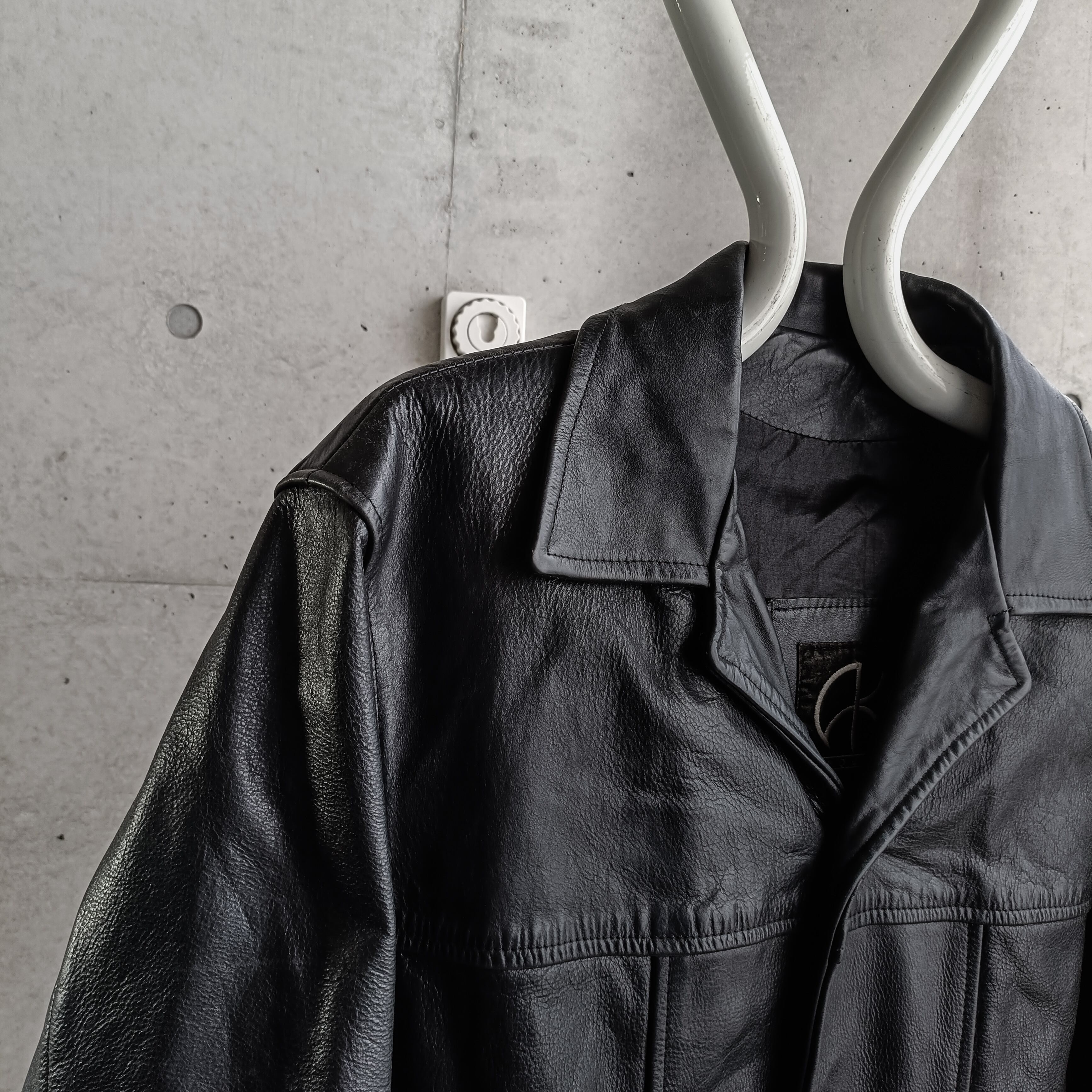今季当店イチオシのシボ革コート。黒で写真からも伝わる上質なシボ革です。綺麗な前振り袖のシルエット。今季のLEMAIREなども出している形。襟が開襟仕様で、ハイネックのアイテムや襟付きのインナーともスタイリングしやすいです。