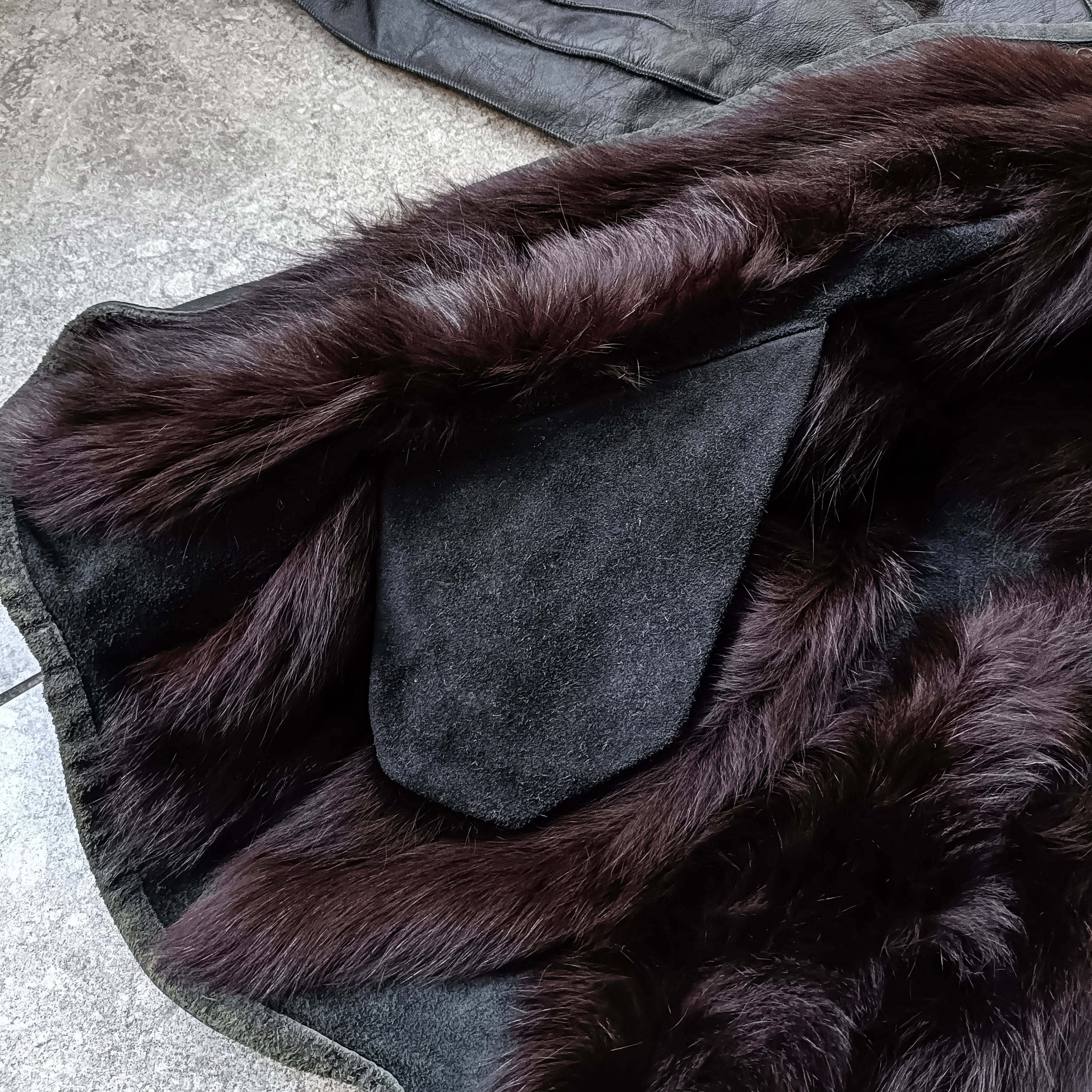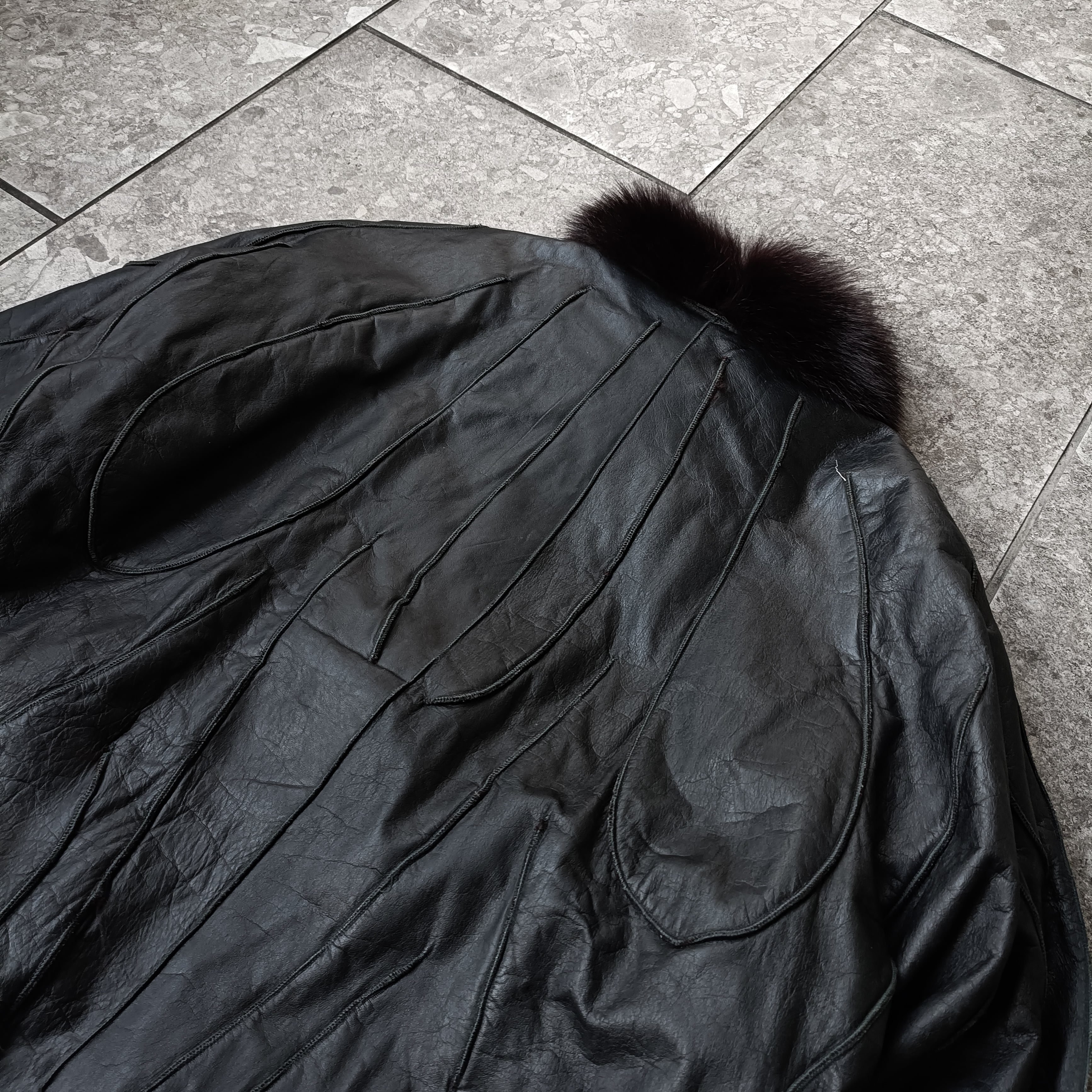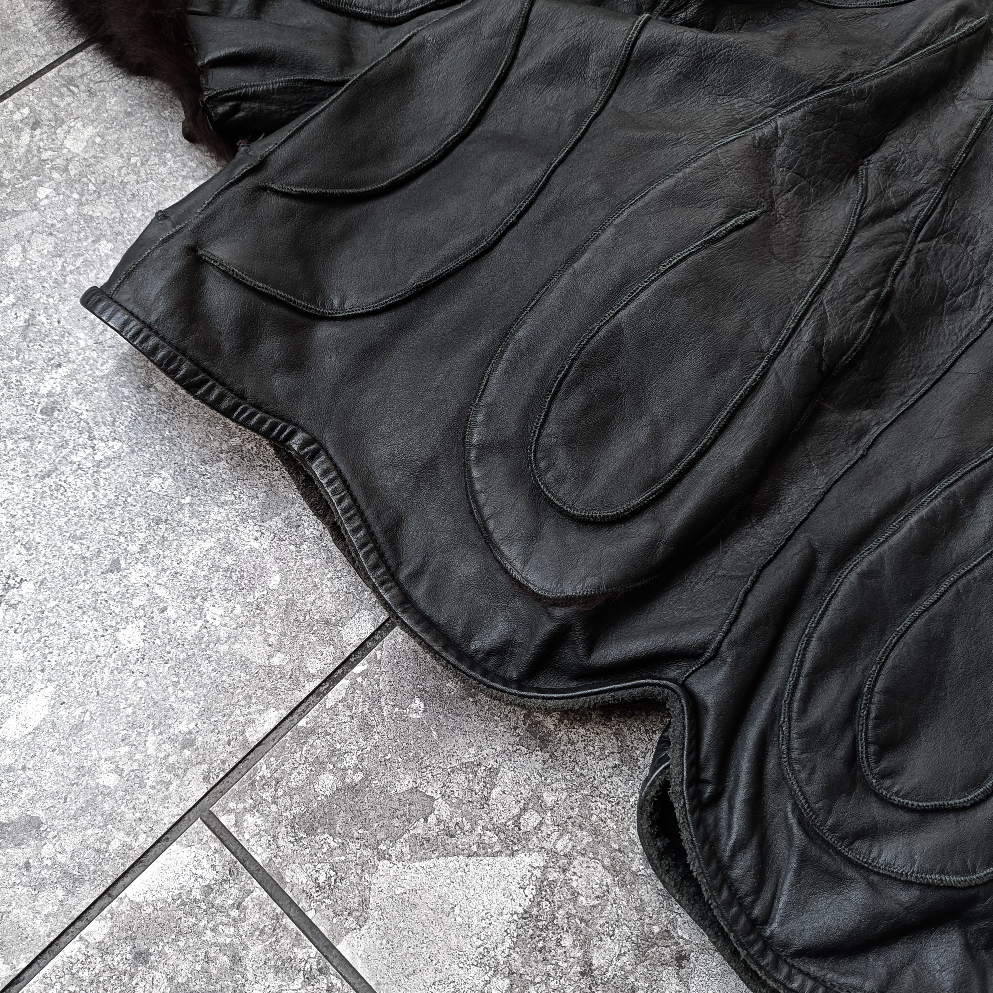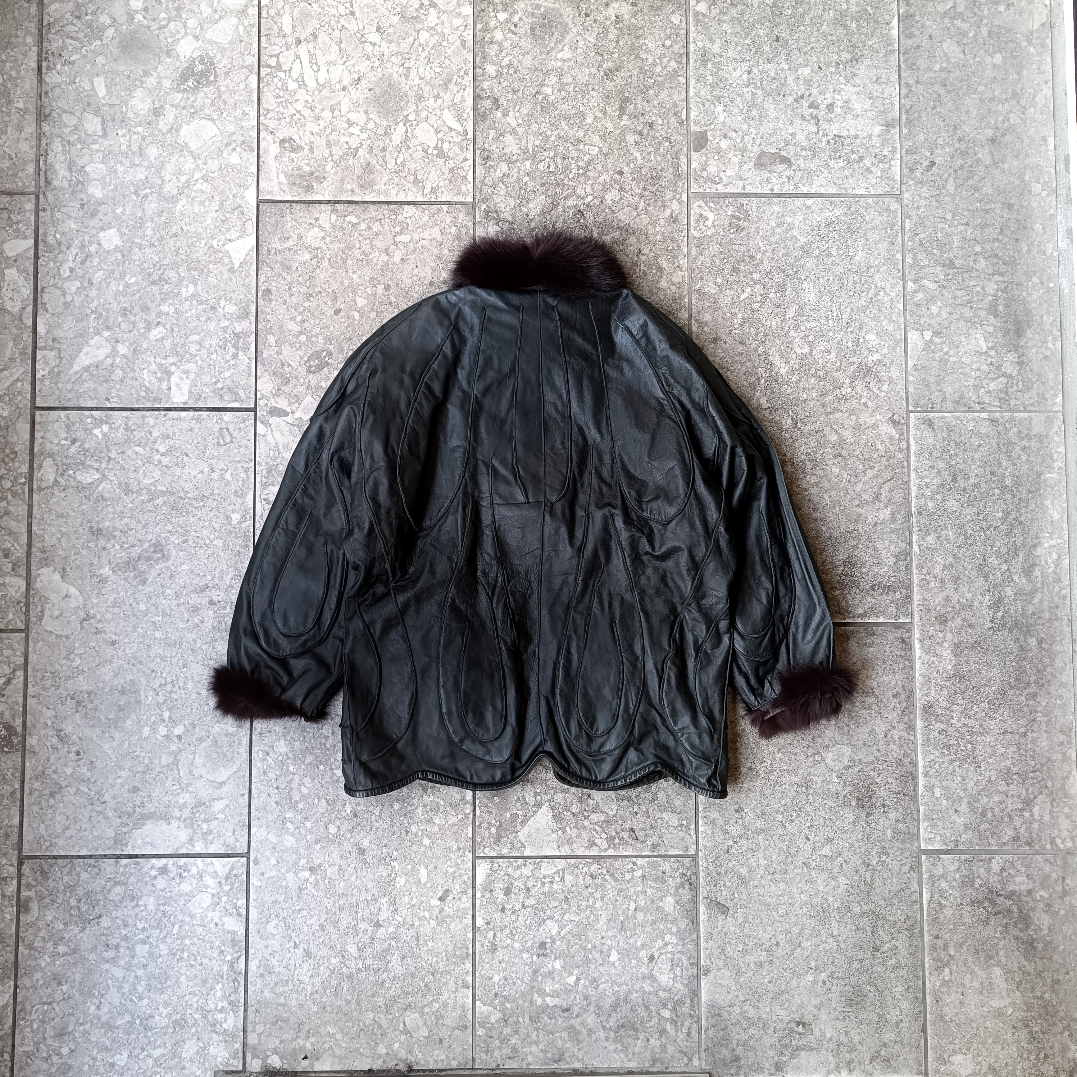 身頃が特徴的なカーブを描いた切替。裾は波型のカッティングがされたデザインです。ラグランで肩がしっかり落ちたシルエット。襟と袖裏がファー仕様。小柄なメンズ、レディース向けサイズです。