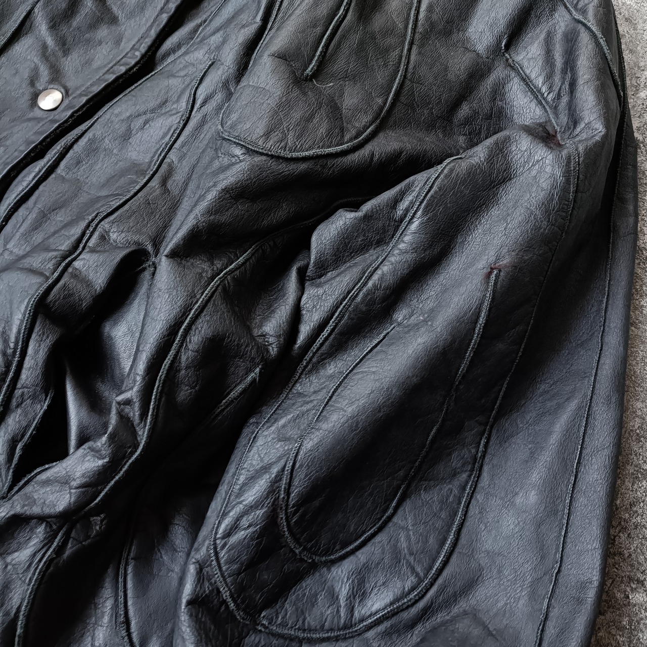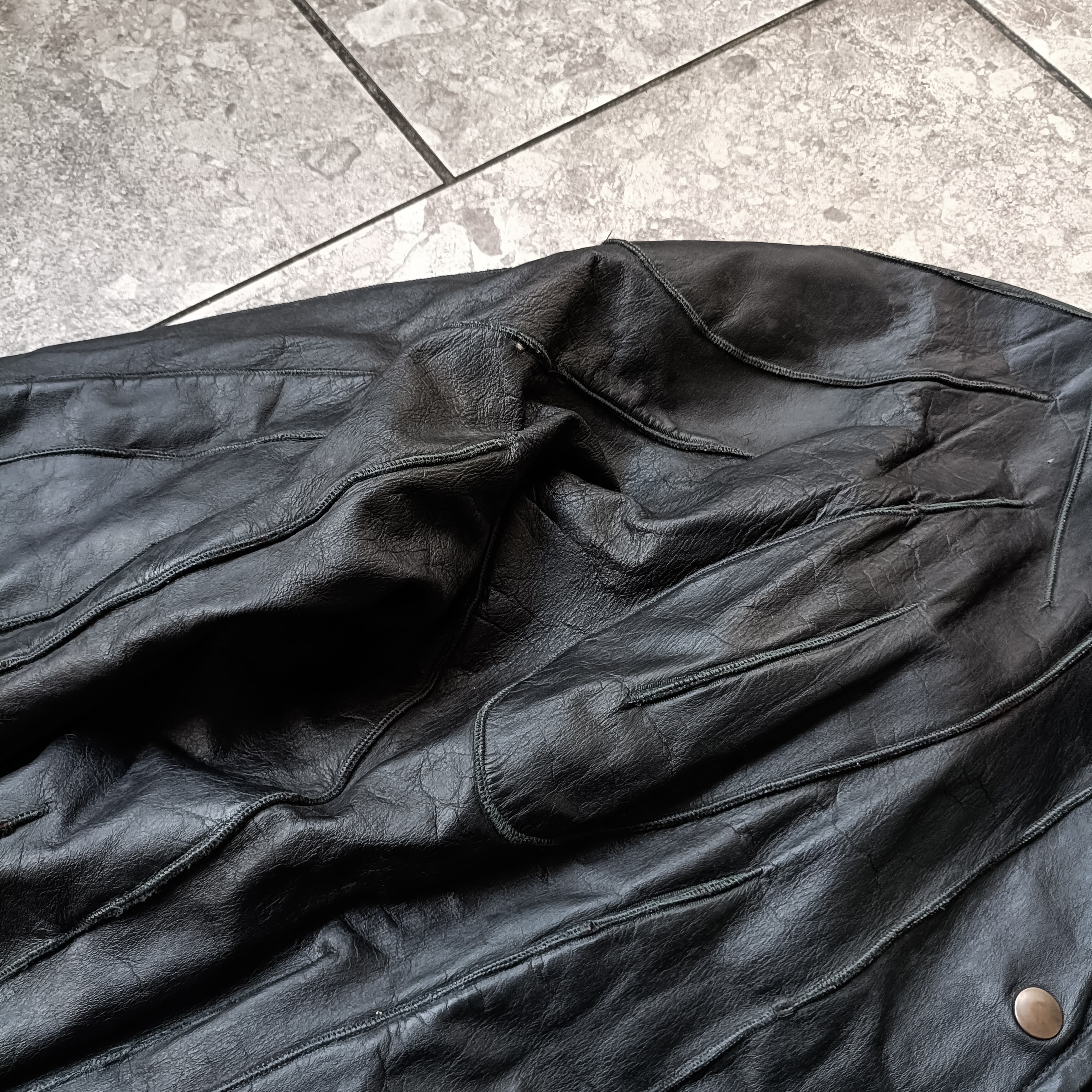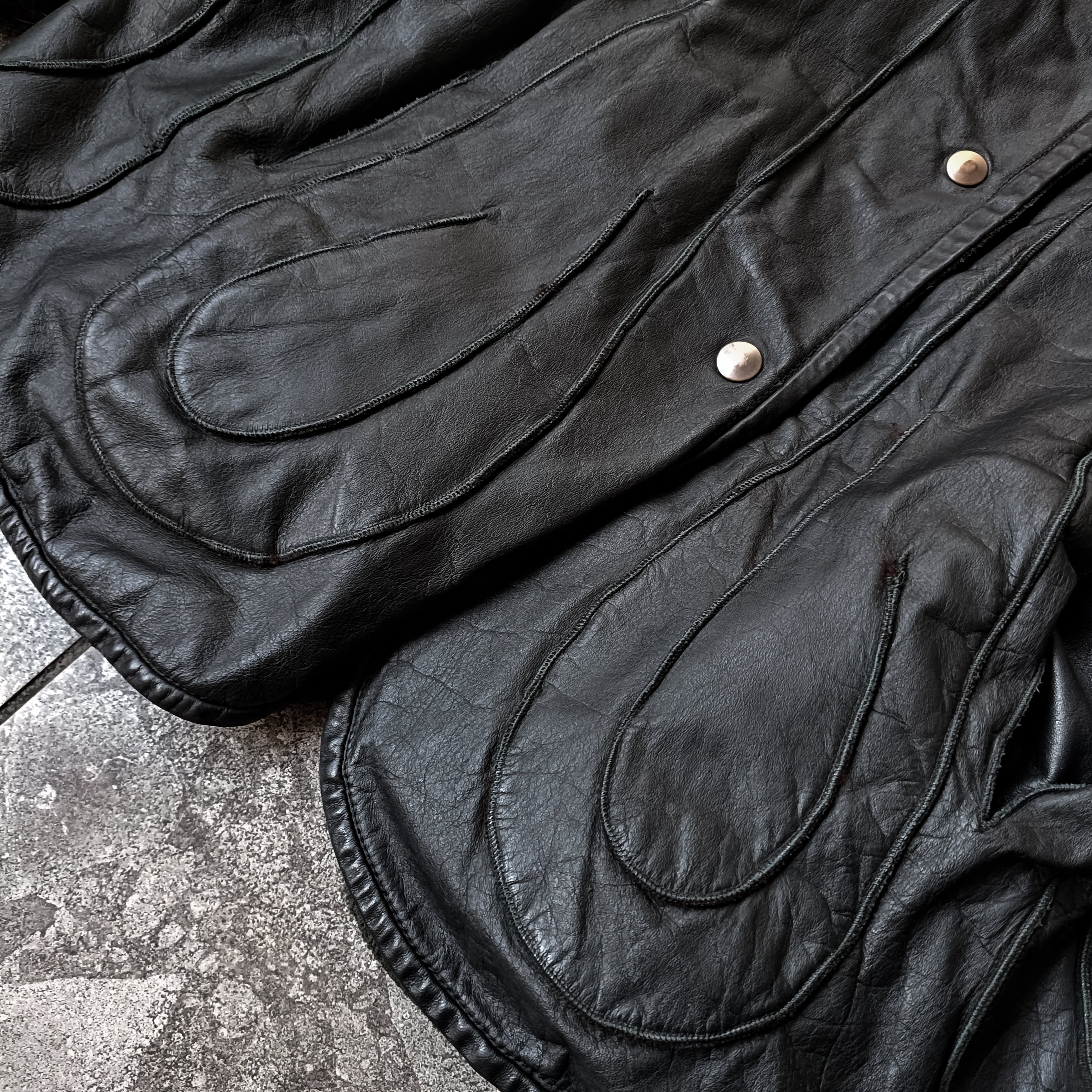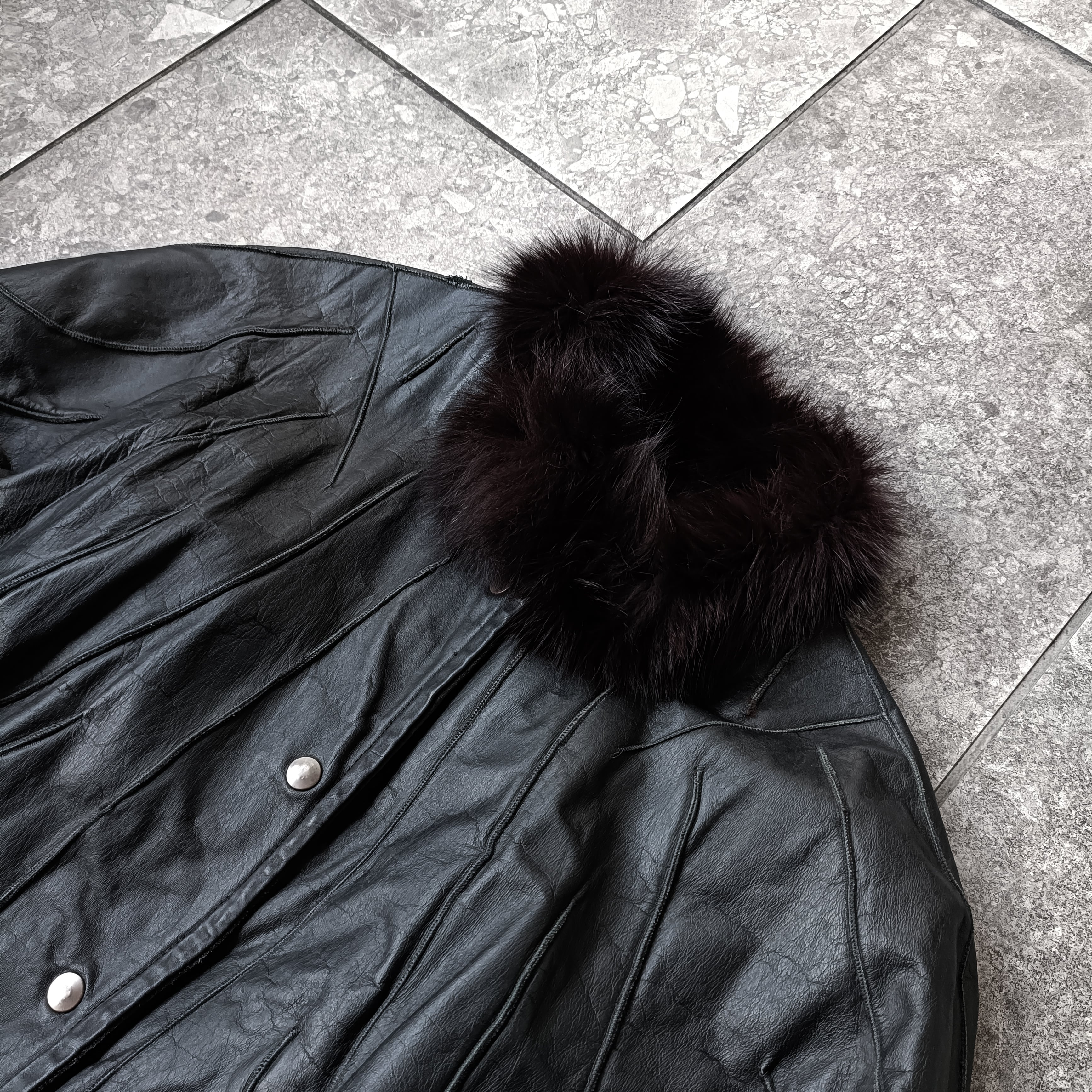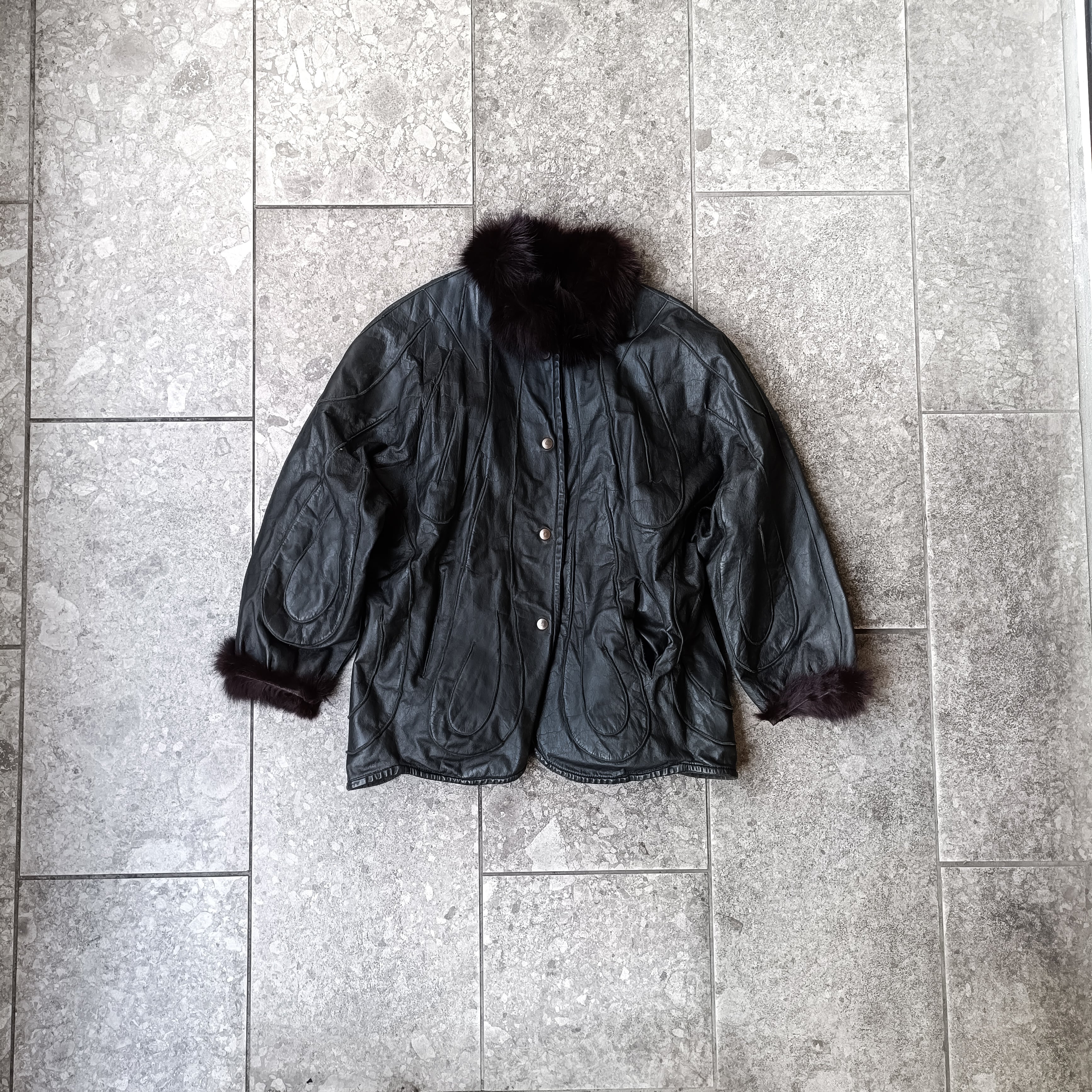 身頃が特徴的なカーブを描いた切替。裾は波型のカッティングがされたデザインです。ラグランで肩がしっかり落ちたシルエット。襟と袖裏がファー仕様。小柄なメンズ、レディース向けサイズです。