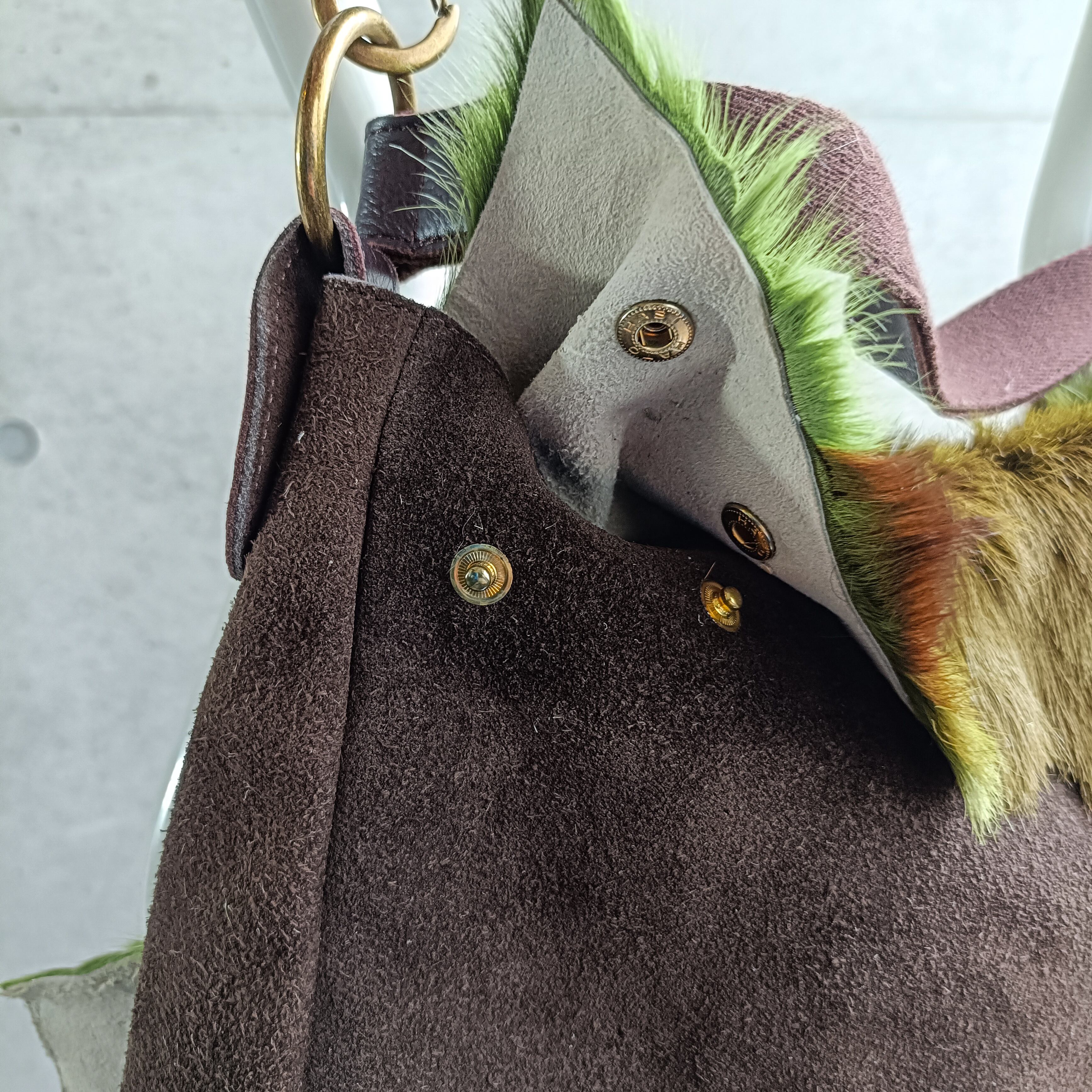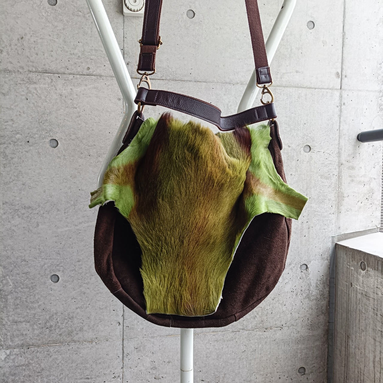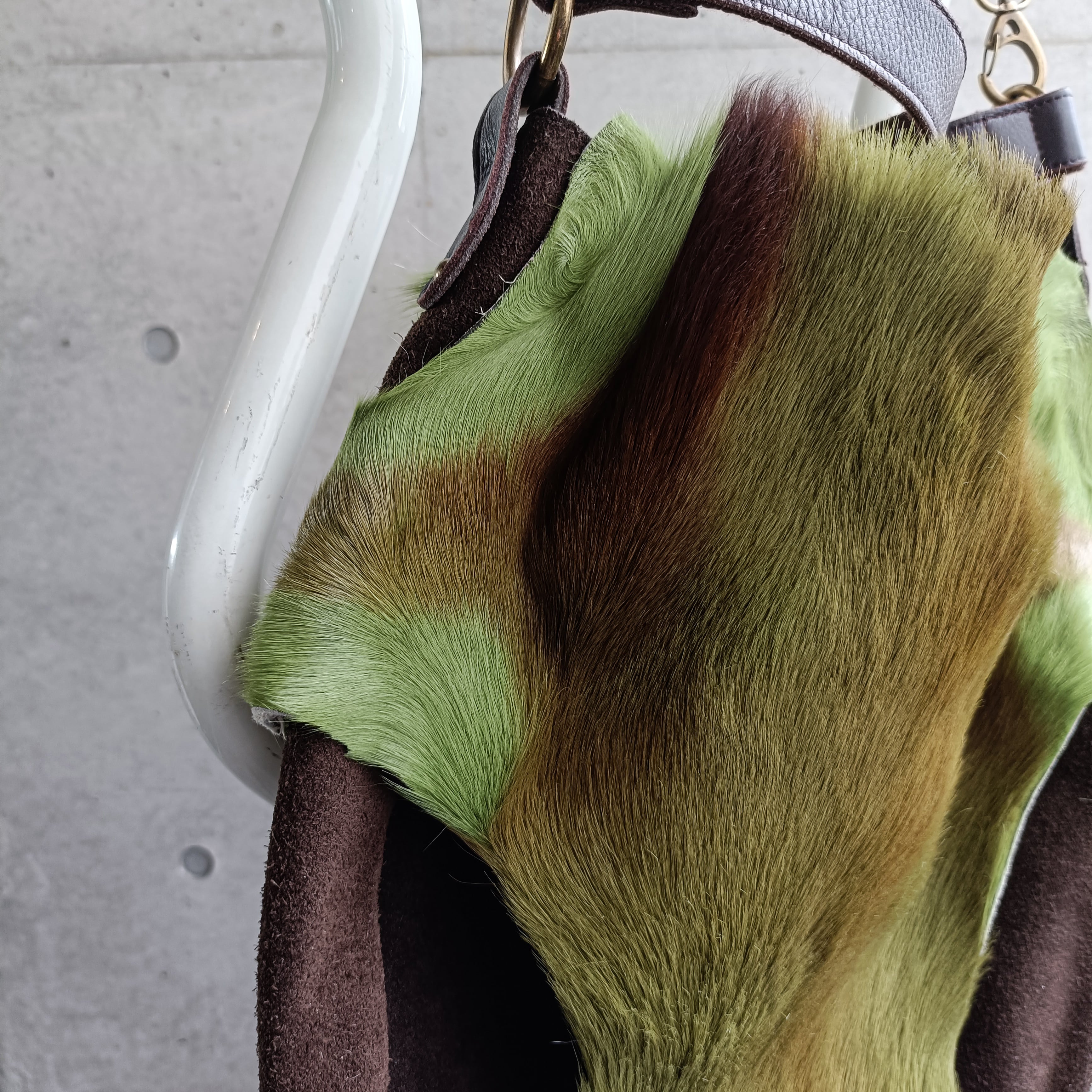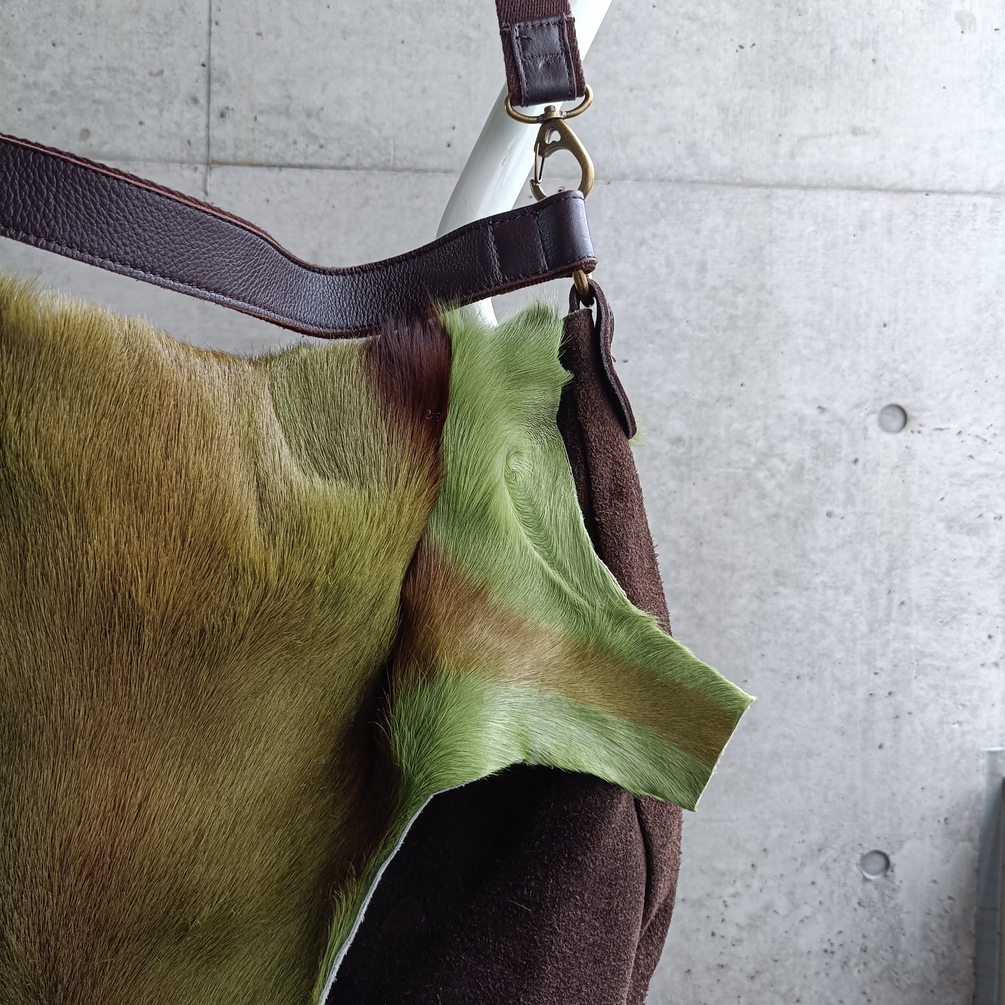 超スペシャル。ライムカラーのハラコレザーがフラップになったショルダーバッグ。ベースはブラウンのスウェードです。ハラコ部分のフラップは着脱可能です。使い易い大きさ。背負うだけでスタイリングに雰囲気出るアイテムです。