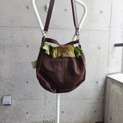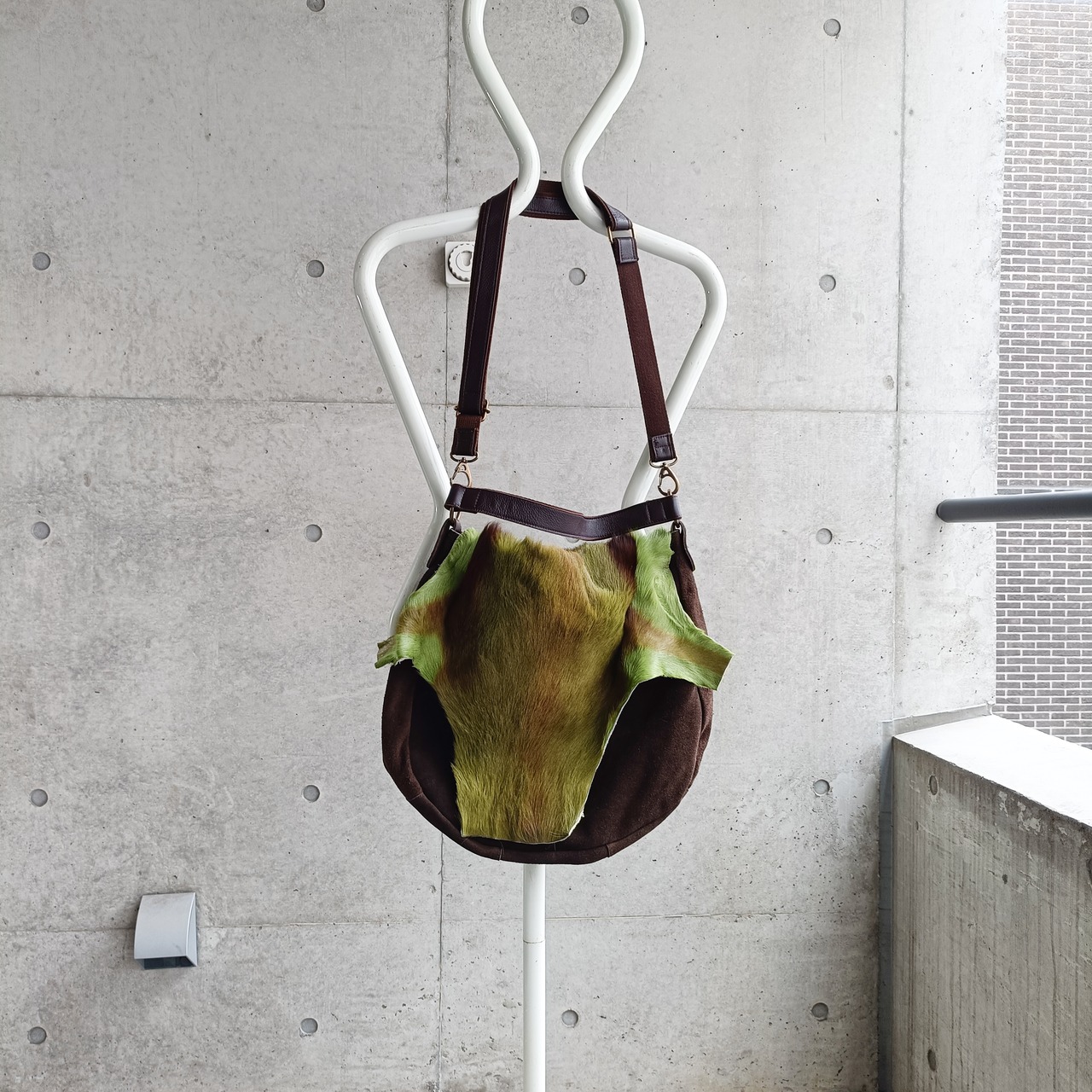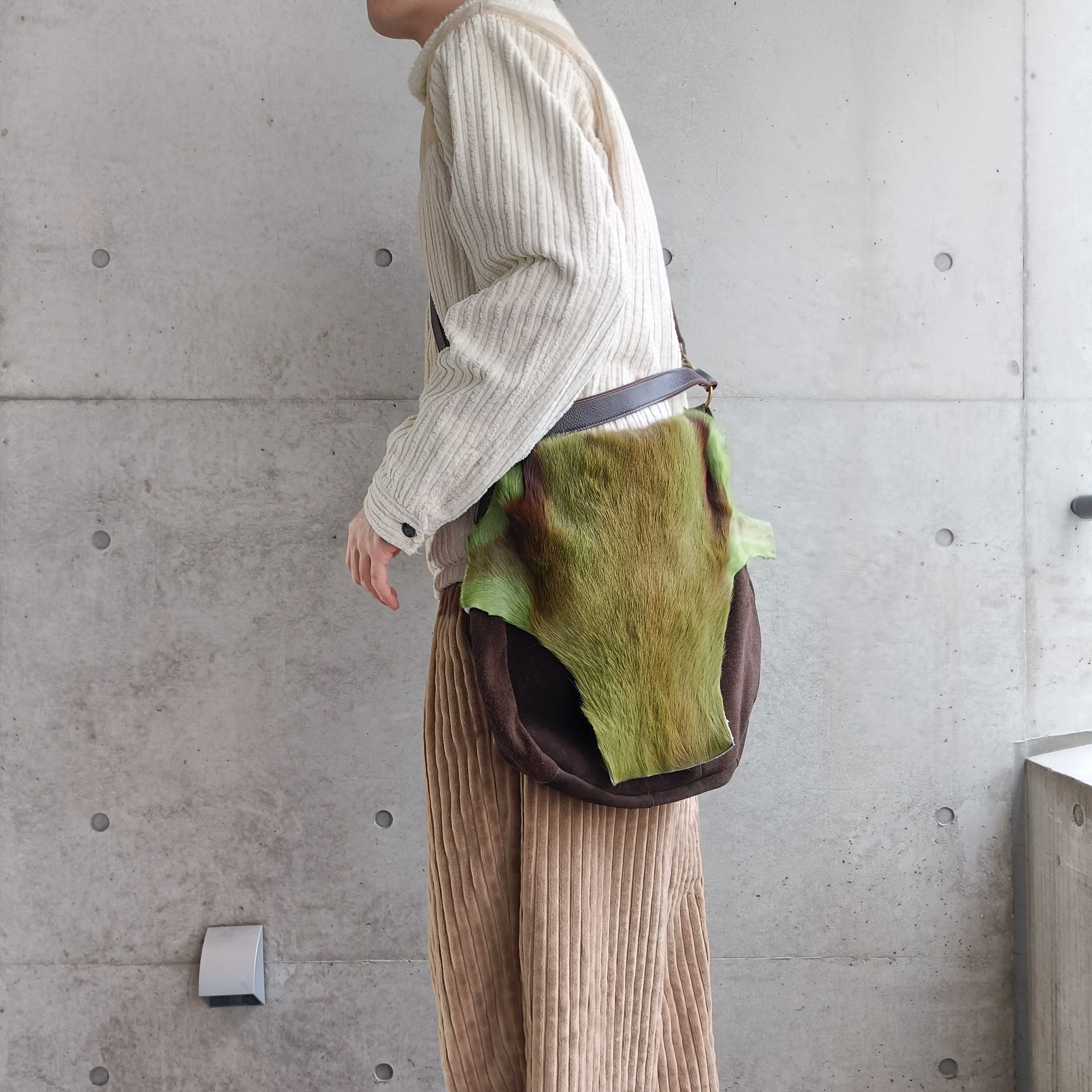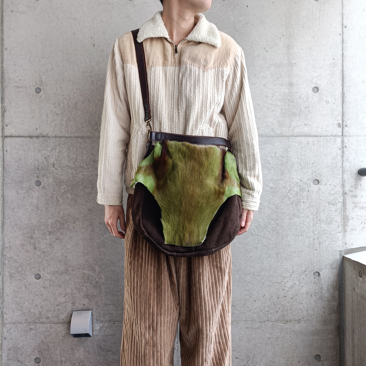 超スペシャル。ライムカラーのハラコレザーがフラップになったショルダーバッグ。ベースはブラウンのスウェードです。ハラコ部分のフラップは着脱可能です。使い易い大きさ。背負うだけでスタイリングに雰囲気出るアイテムです。