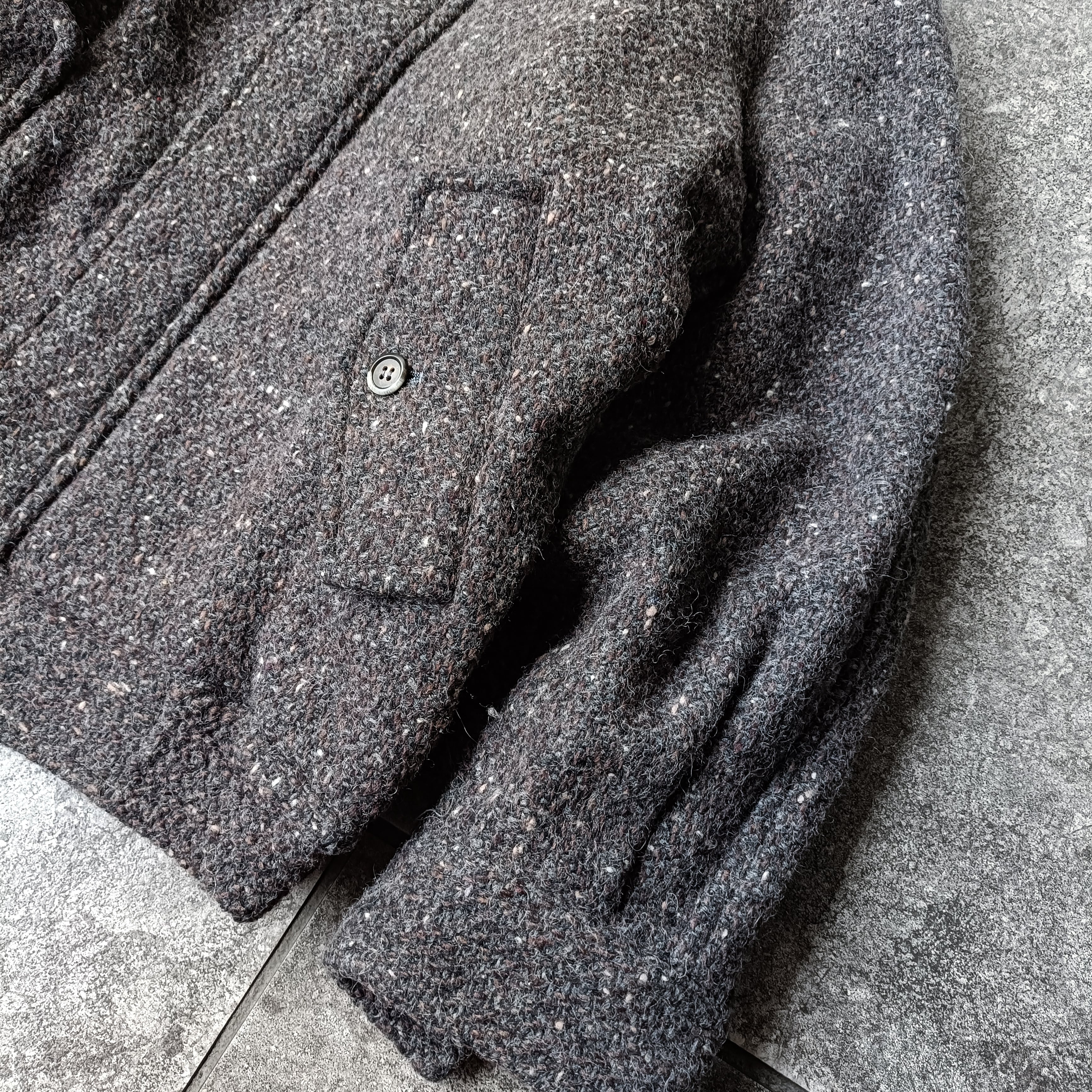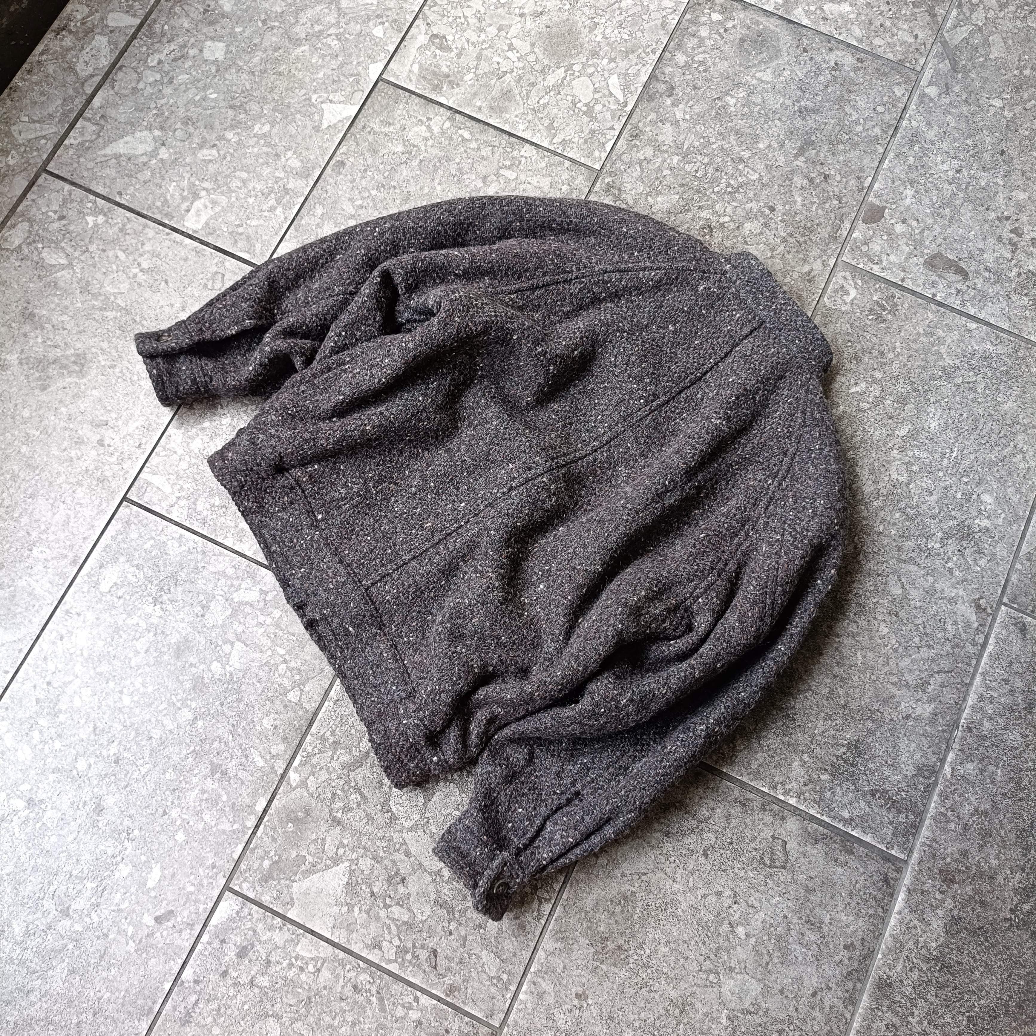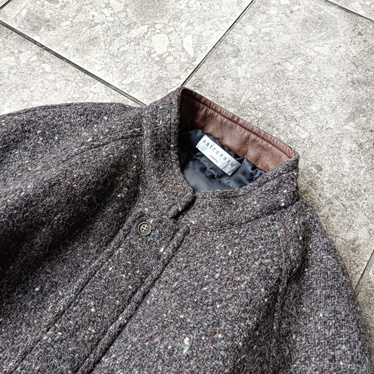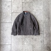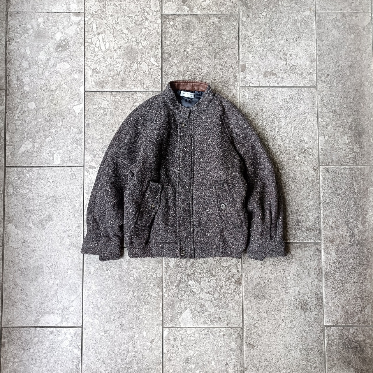 チャンキーツイードのウールブルゾン。スタンドカラー。襟裏が本革のレザー切替。袖は2タックで太いアームです。ラグランスリーブ。小柄なメンズ、レディース向けサイズです。