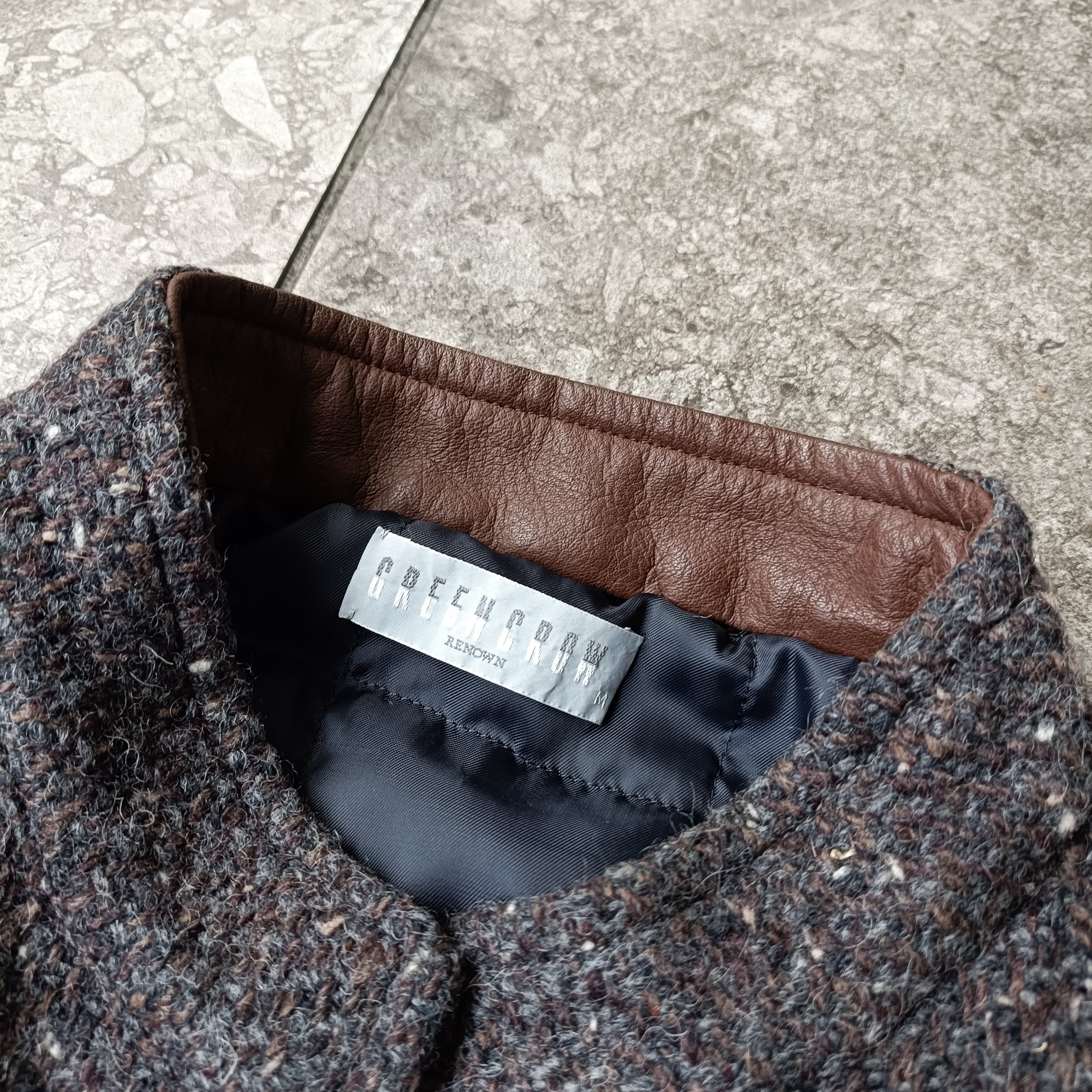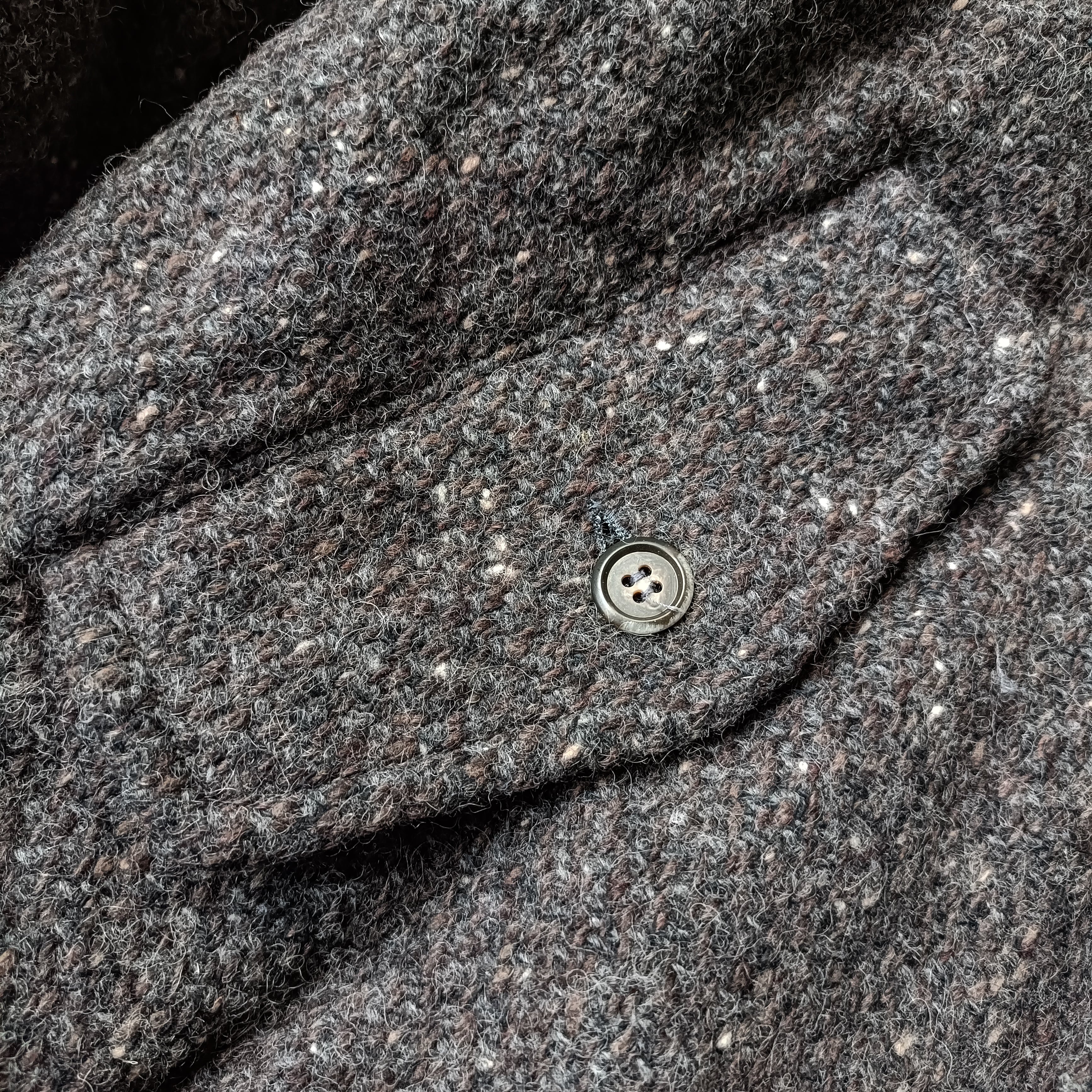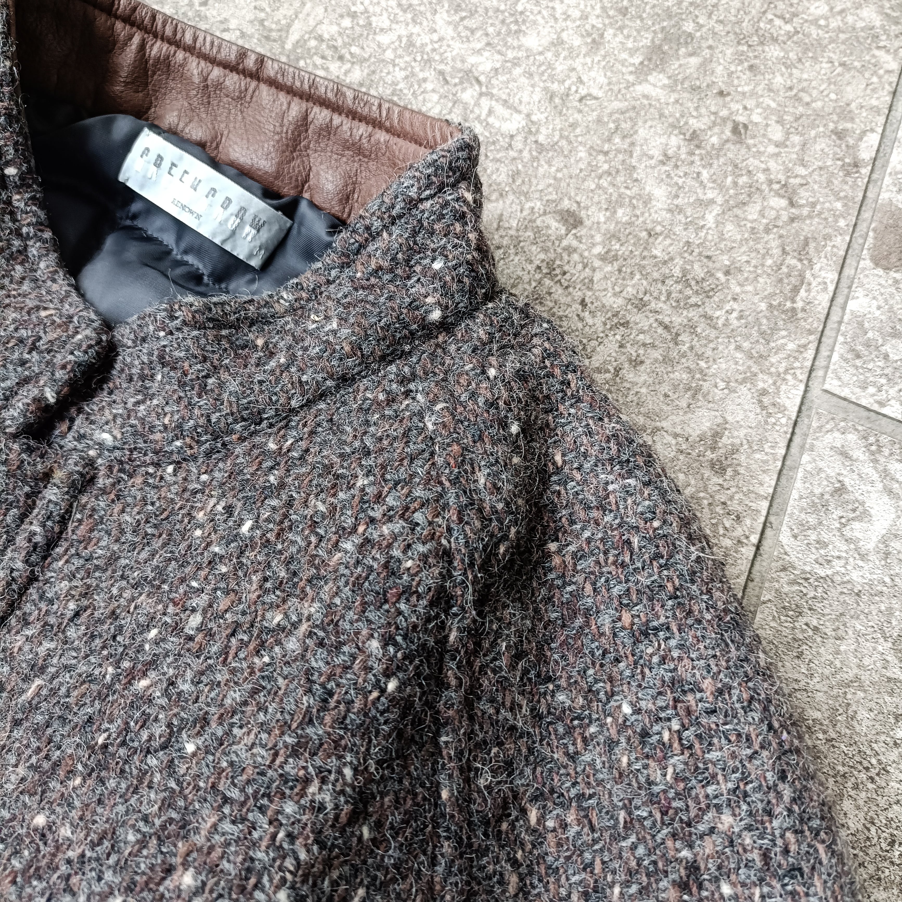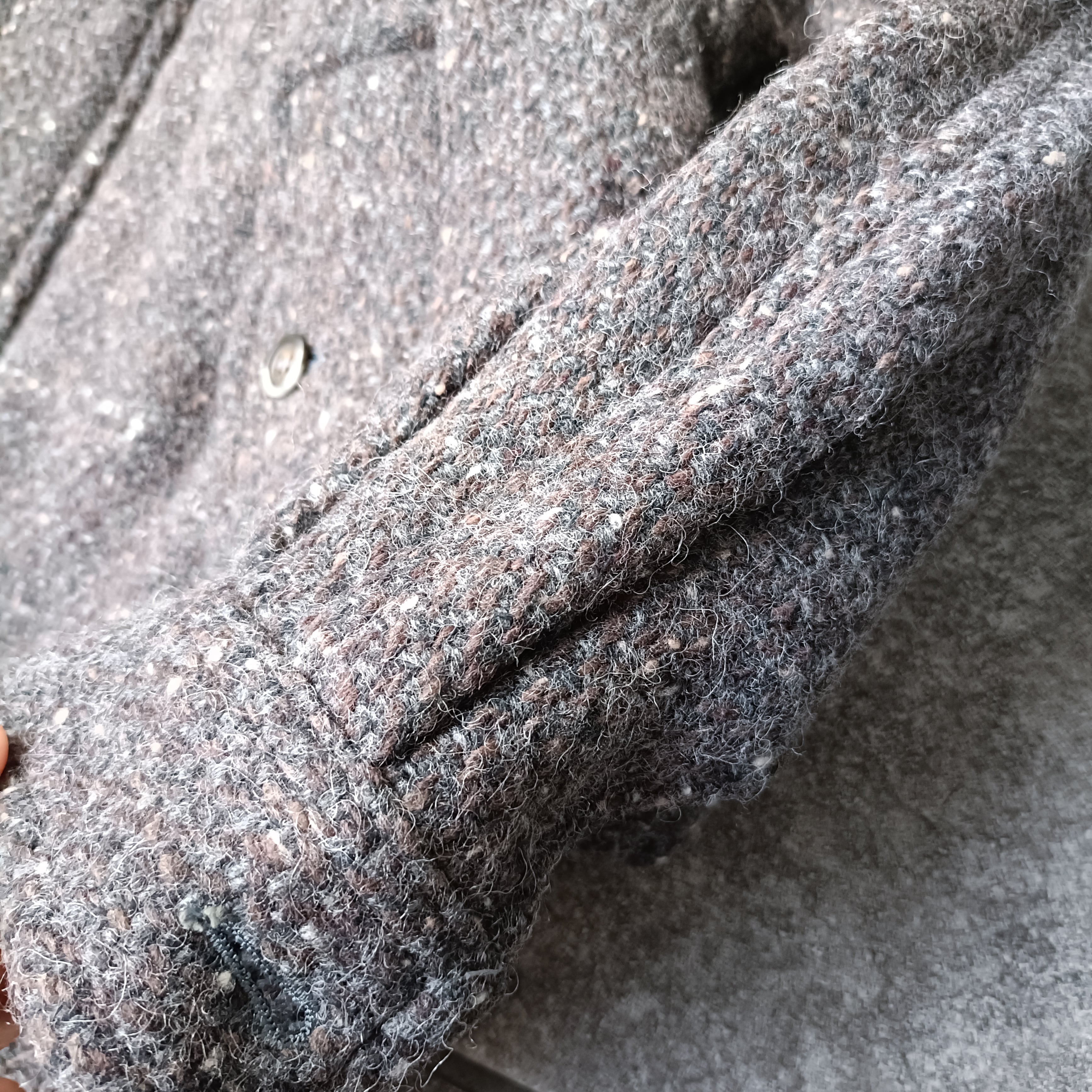 チャンキーツイードのウールブルゾン。スタンドカラー。襟裏が本革のレザー切替。袖は2タックで太いアームです。ラグランスリーブ。小柄なメンズ、レディース向けサイズです。