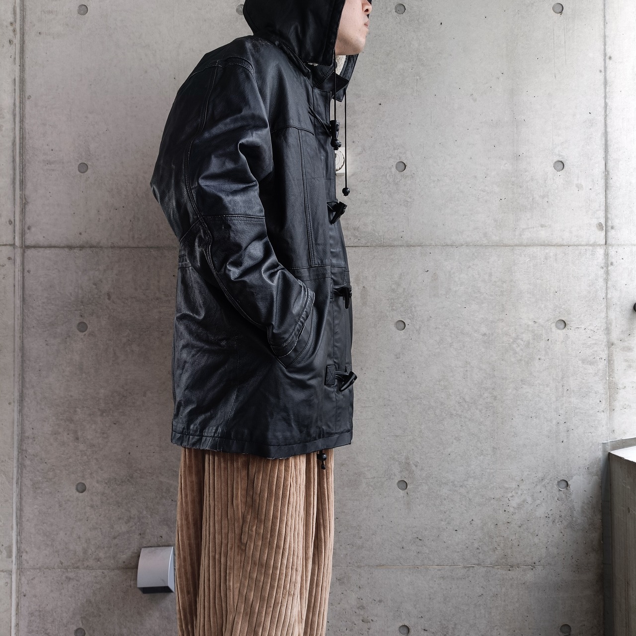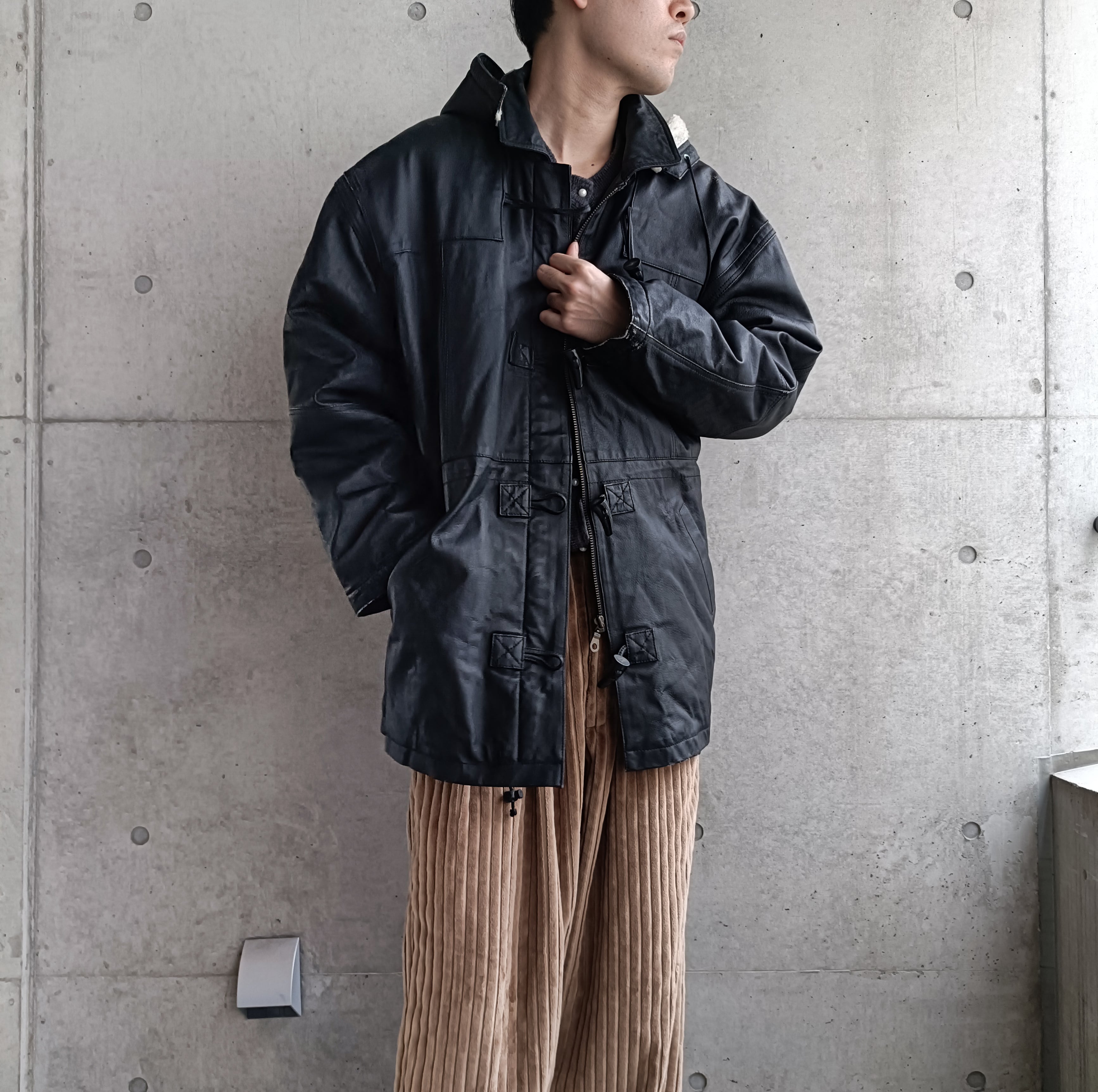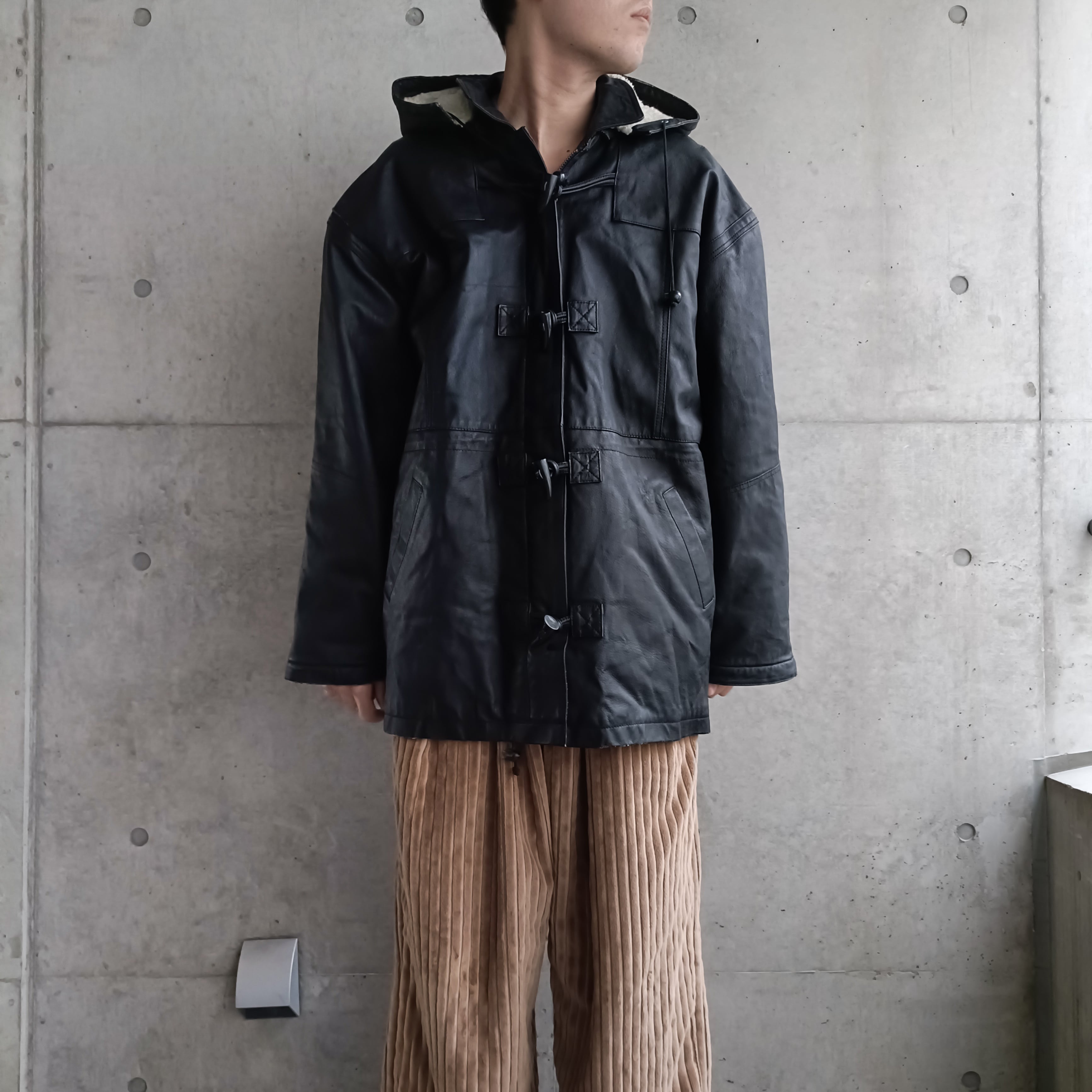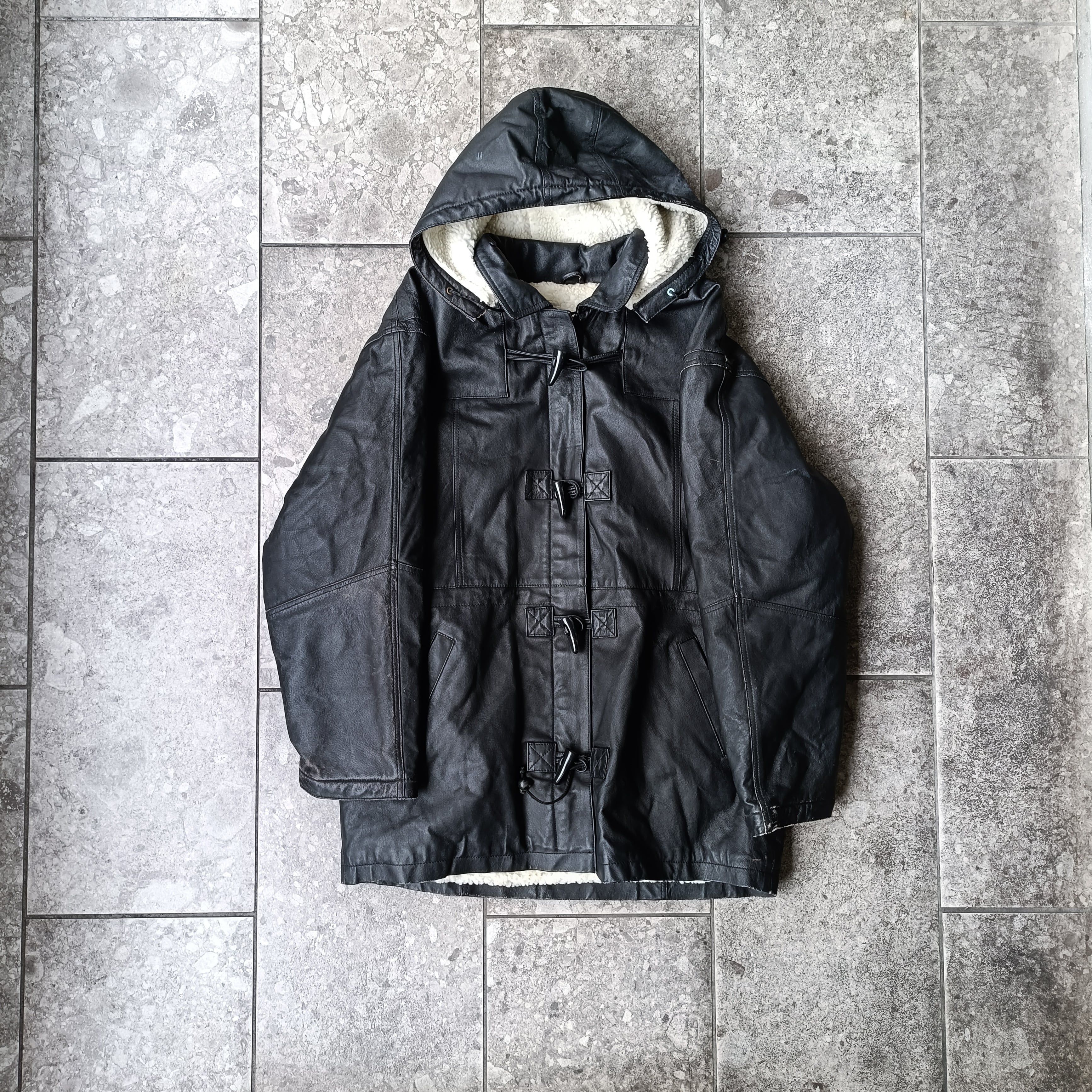 ブラックのレザーダッフルコート。珍しいフードがボア仕様です。アームも太くて、シルエット完璧です。フードは取り外し可能で、ノーマルのダッフルでも着用可能です。重さも重くなく着やすいです。