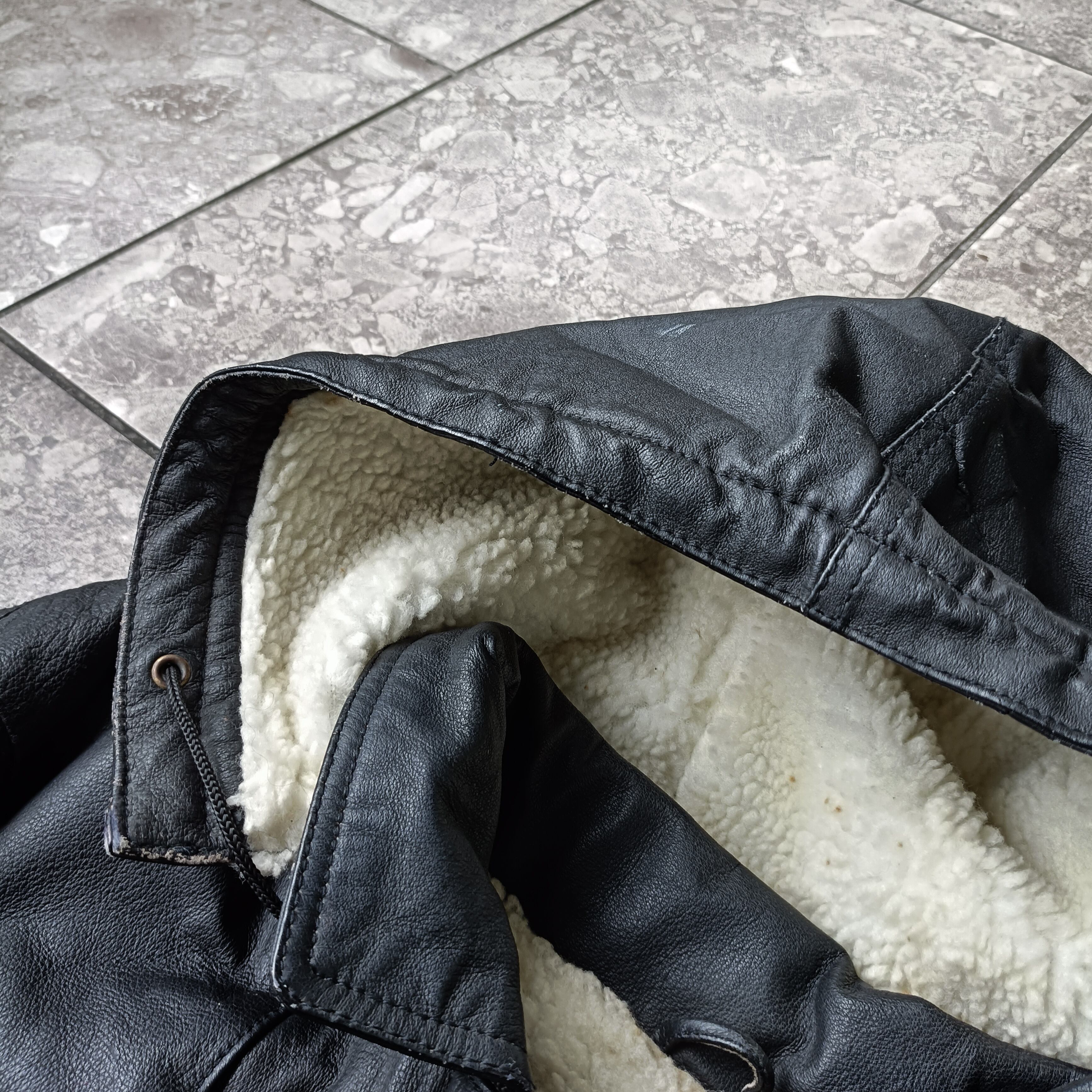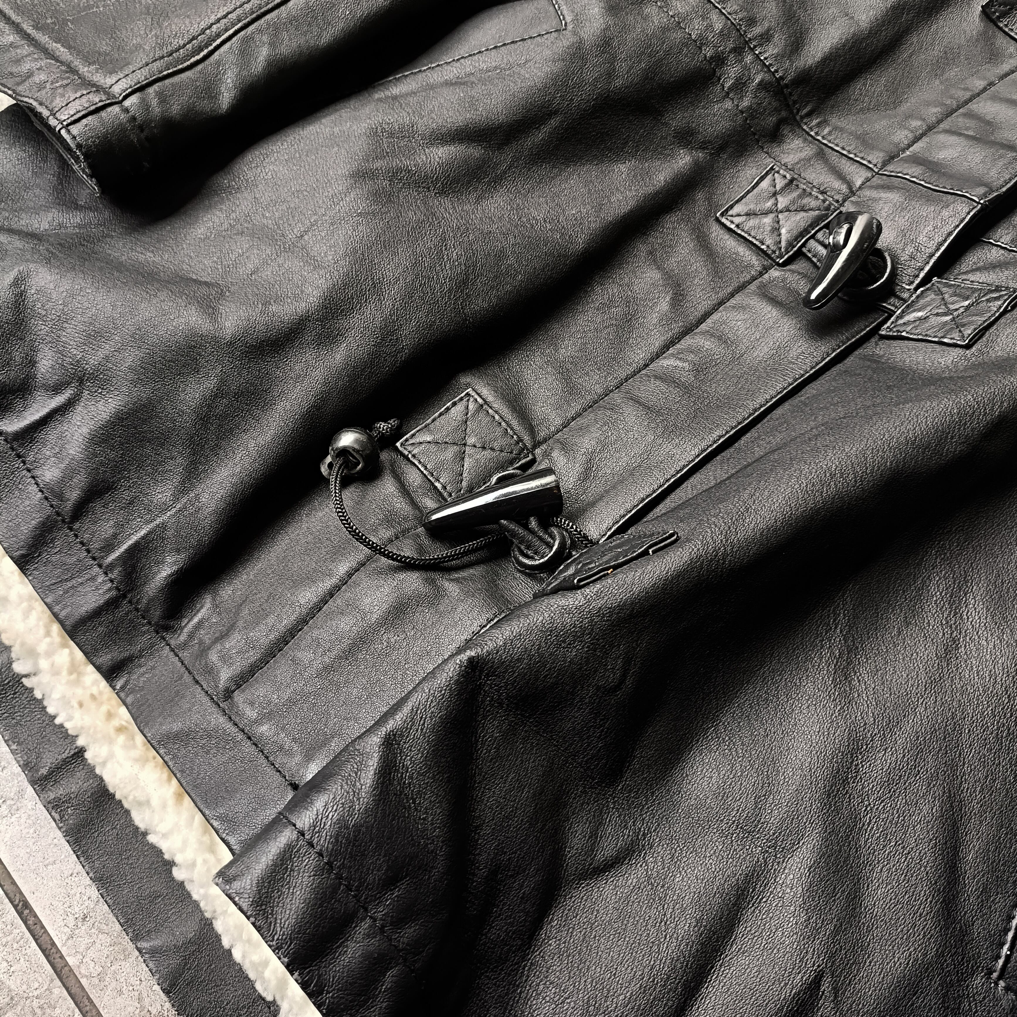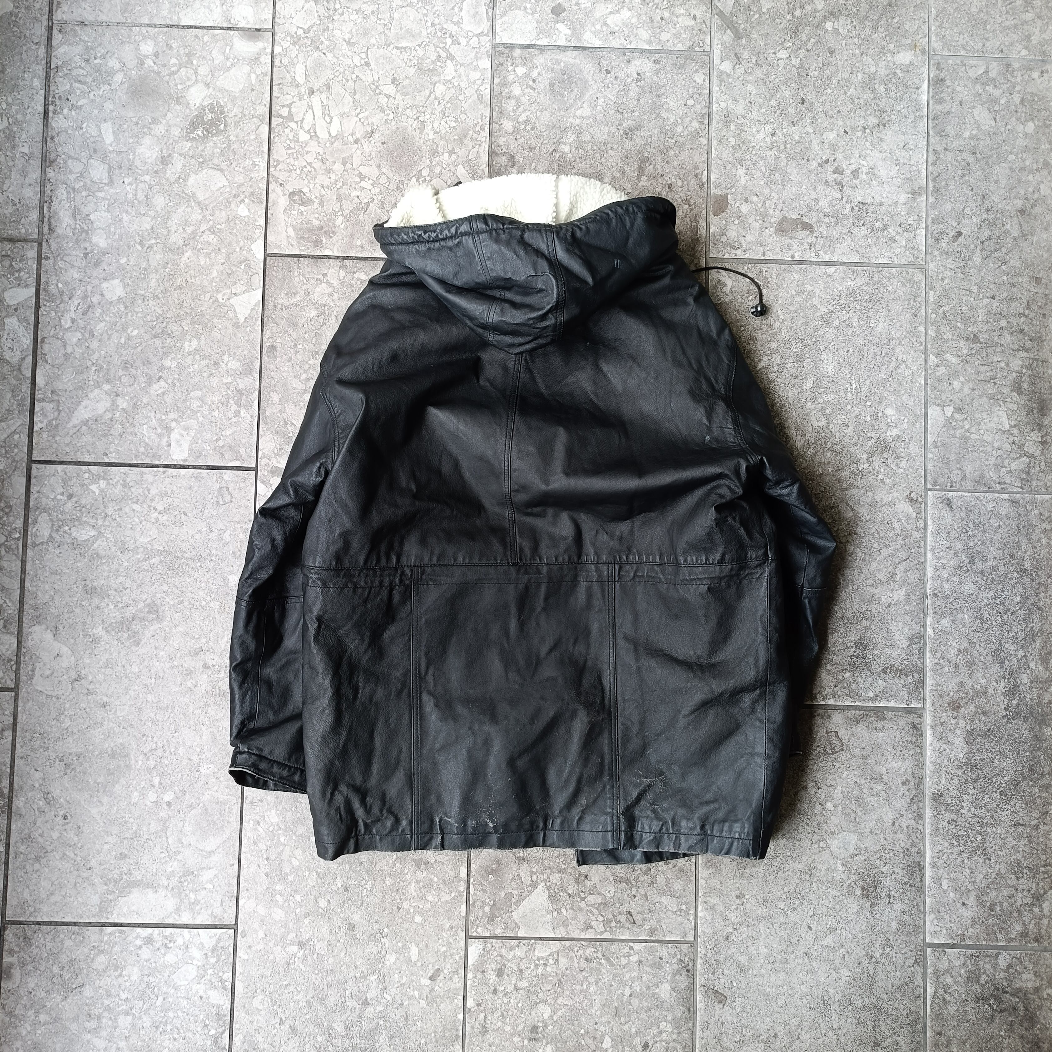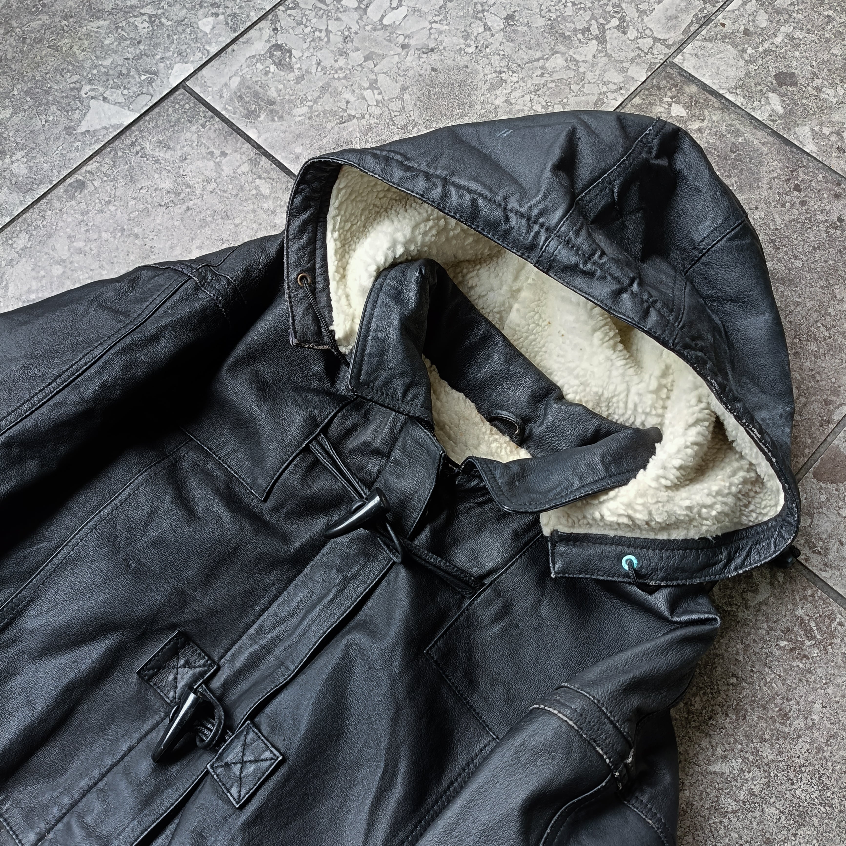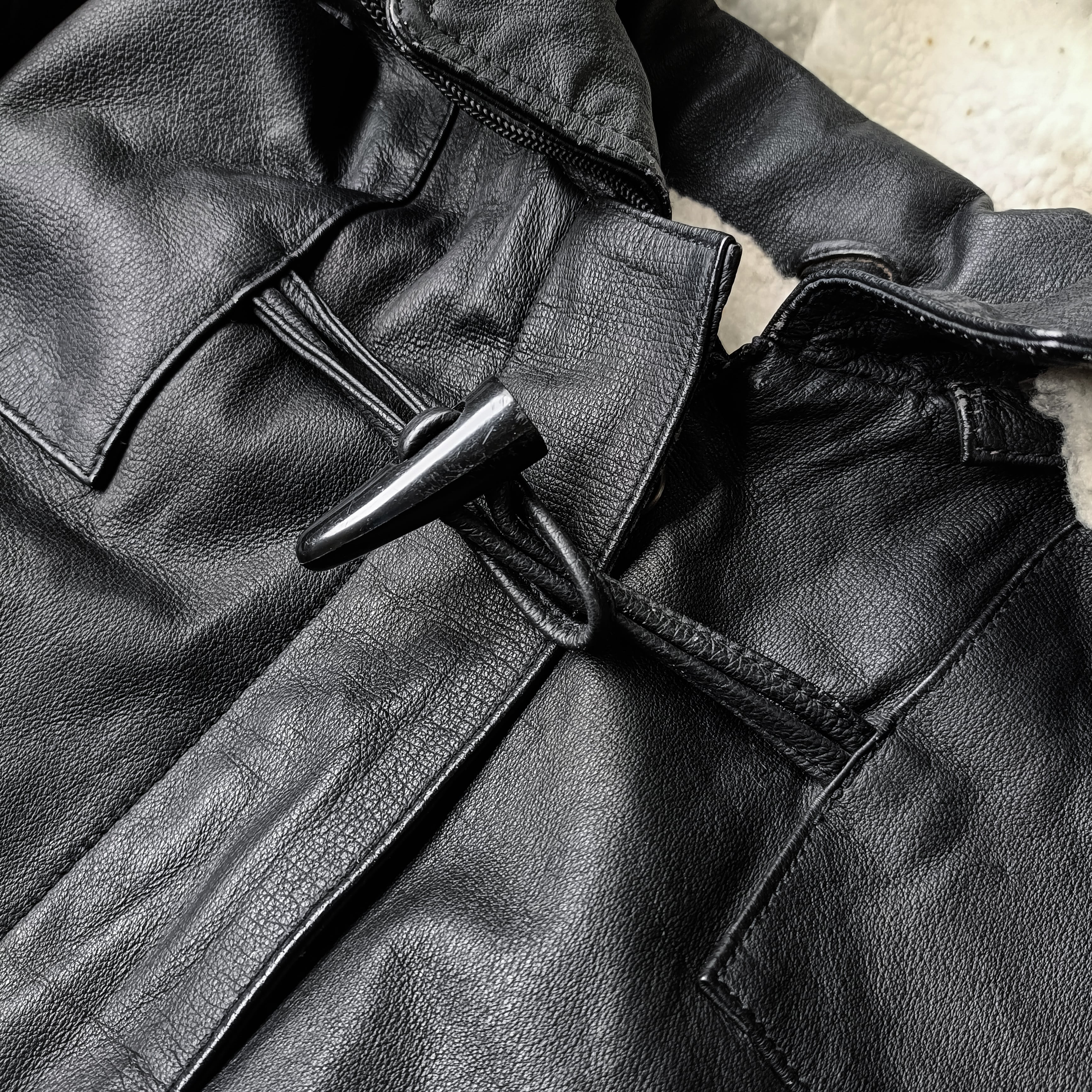 ブラックのレザーダッフルコート。珍しいフードがボア仕様です。アームも太くて、シルエット完璧です。フードは取り外し可能で、ノーマルのダッフルでも着用可能です。重さも重くなく着やすいです。