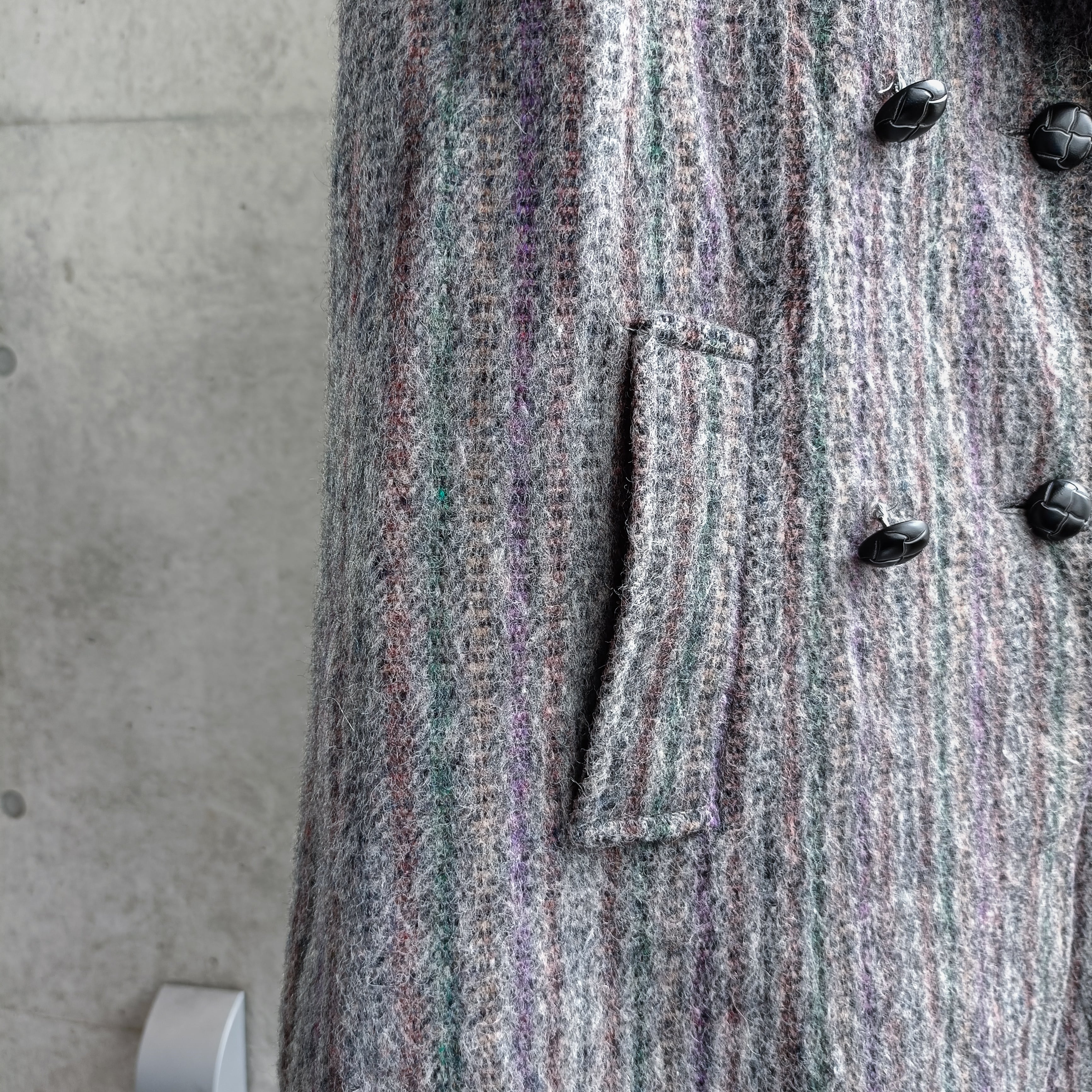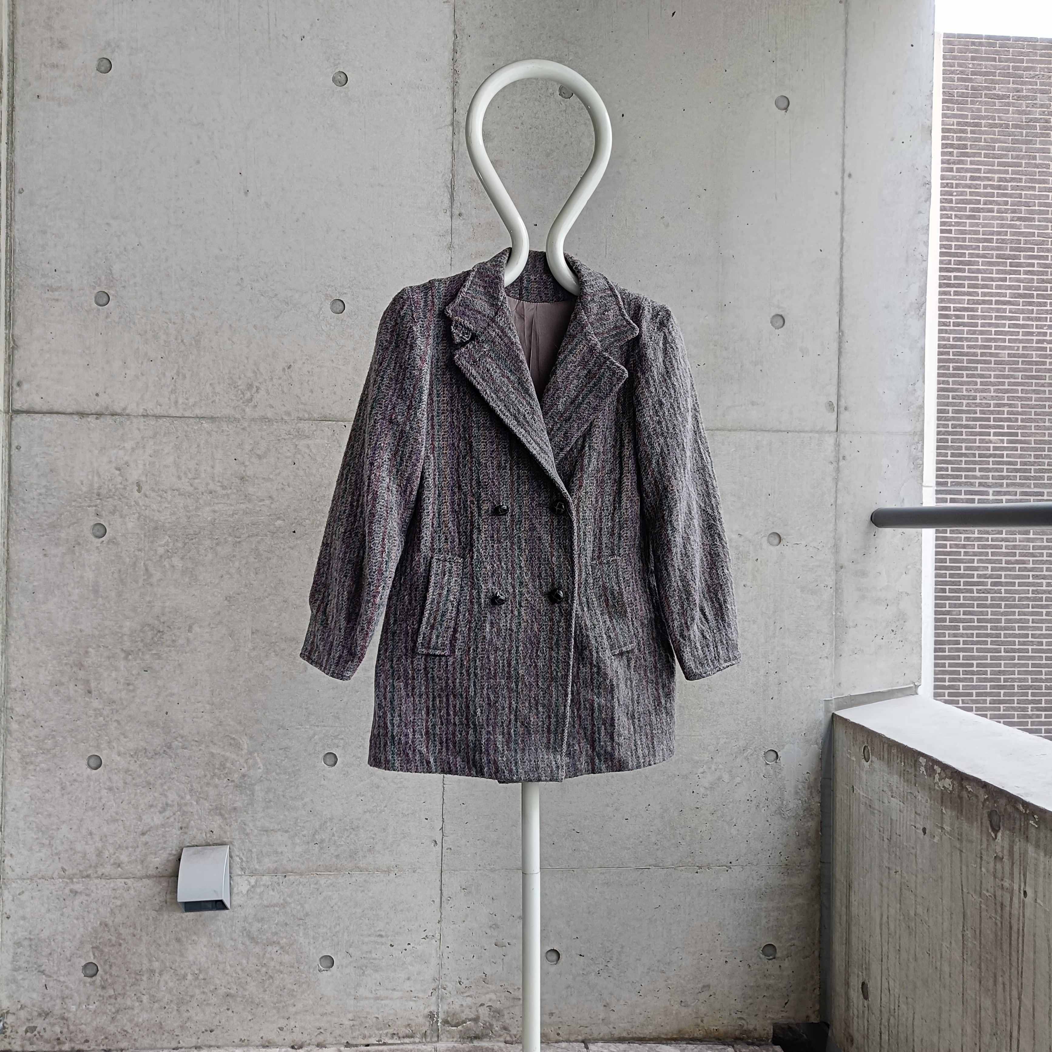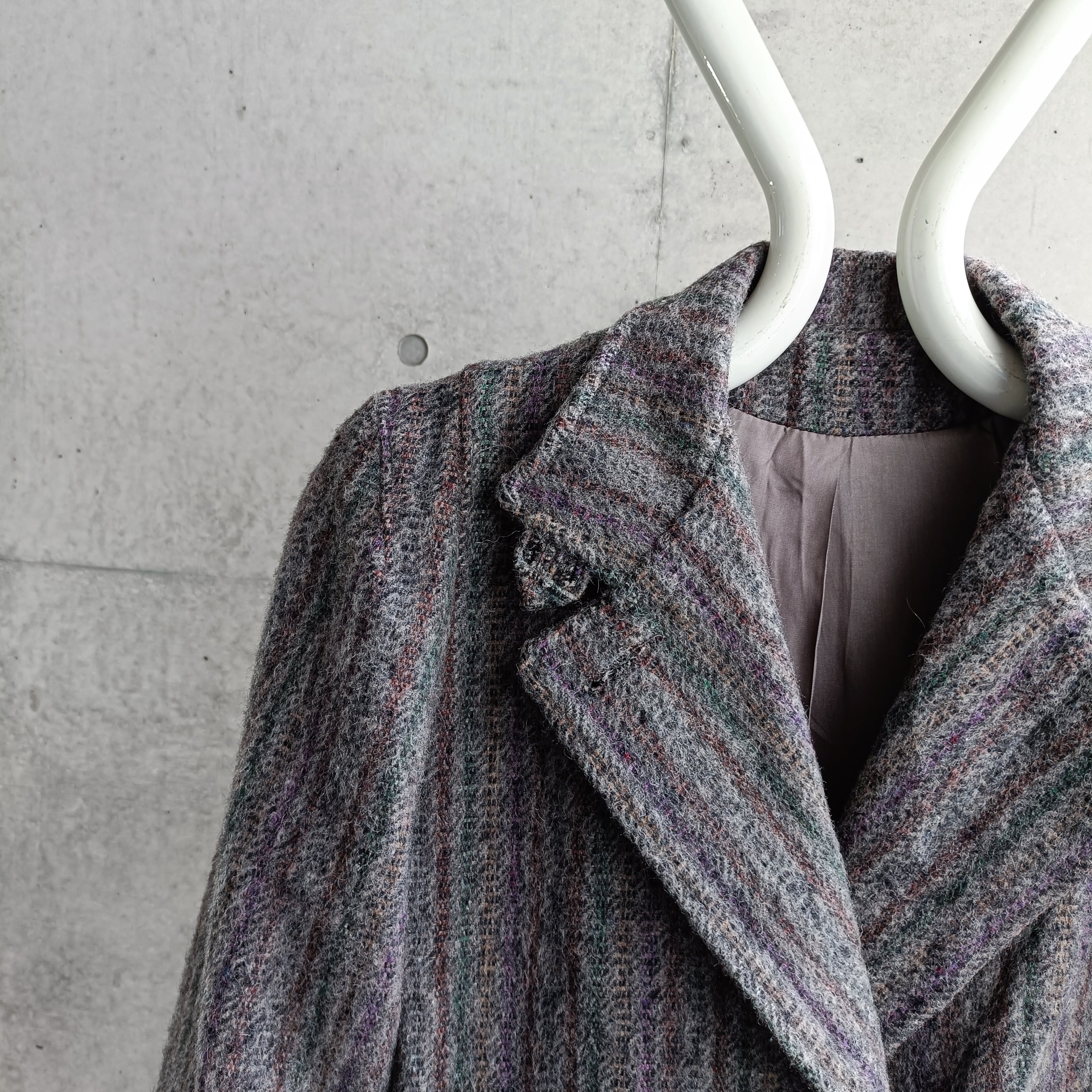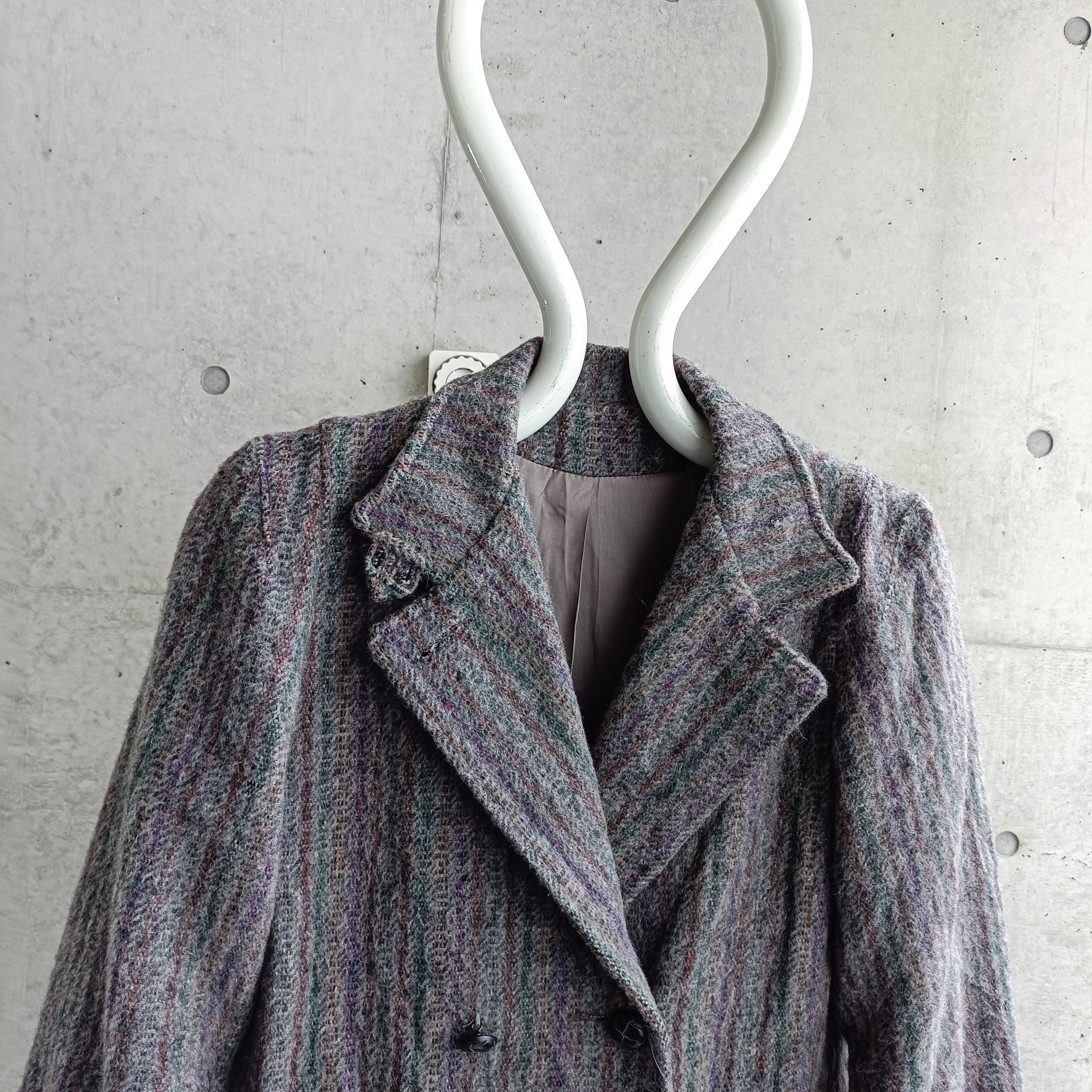 グレーベースにパープル、グリーンのストライプパターン。毛足の長いシャギーウール生地です。ダブルでラペルにループが付いていたり、古着らしいディテール。小柄なメンズ、レディース向けサイズです。