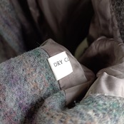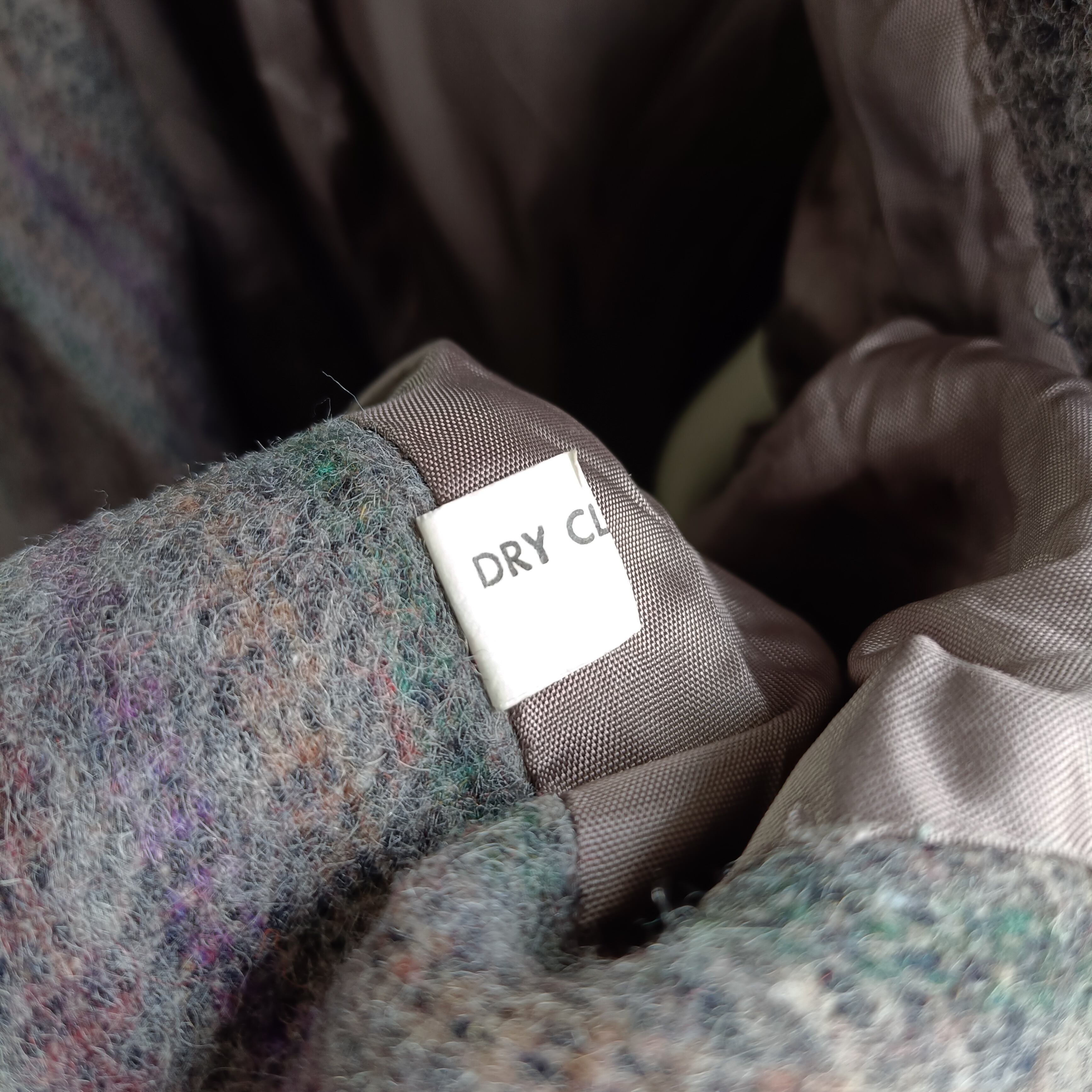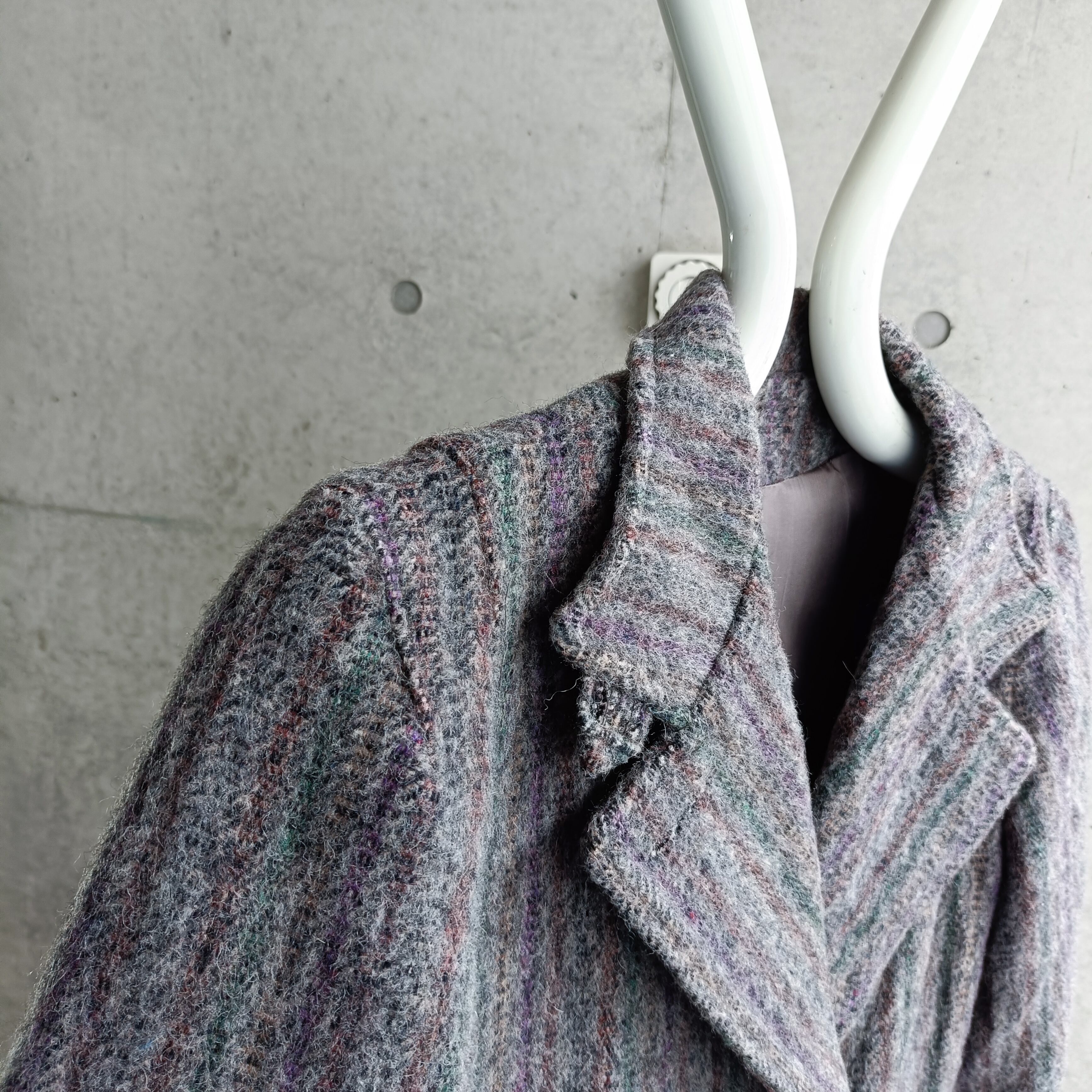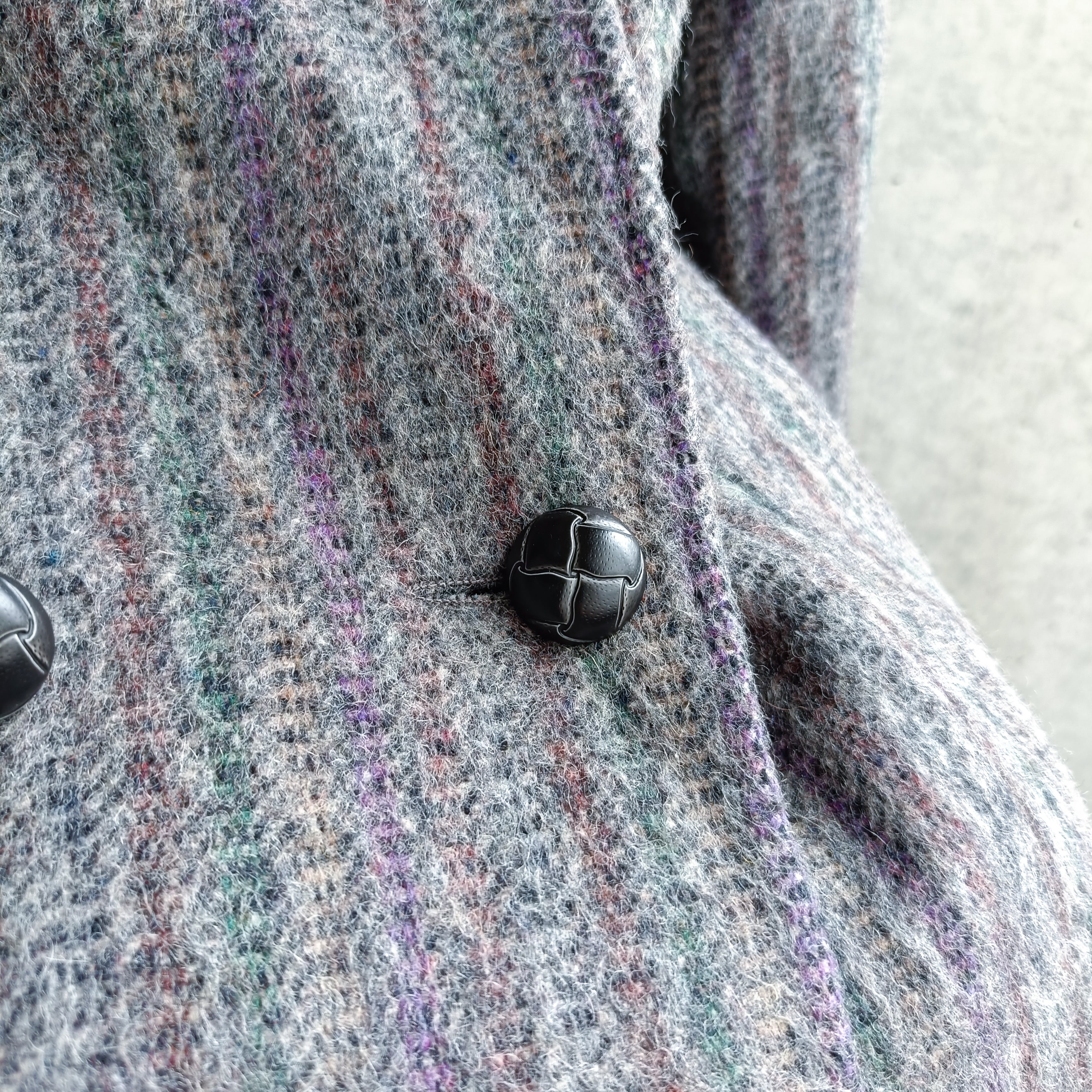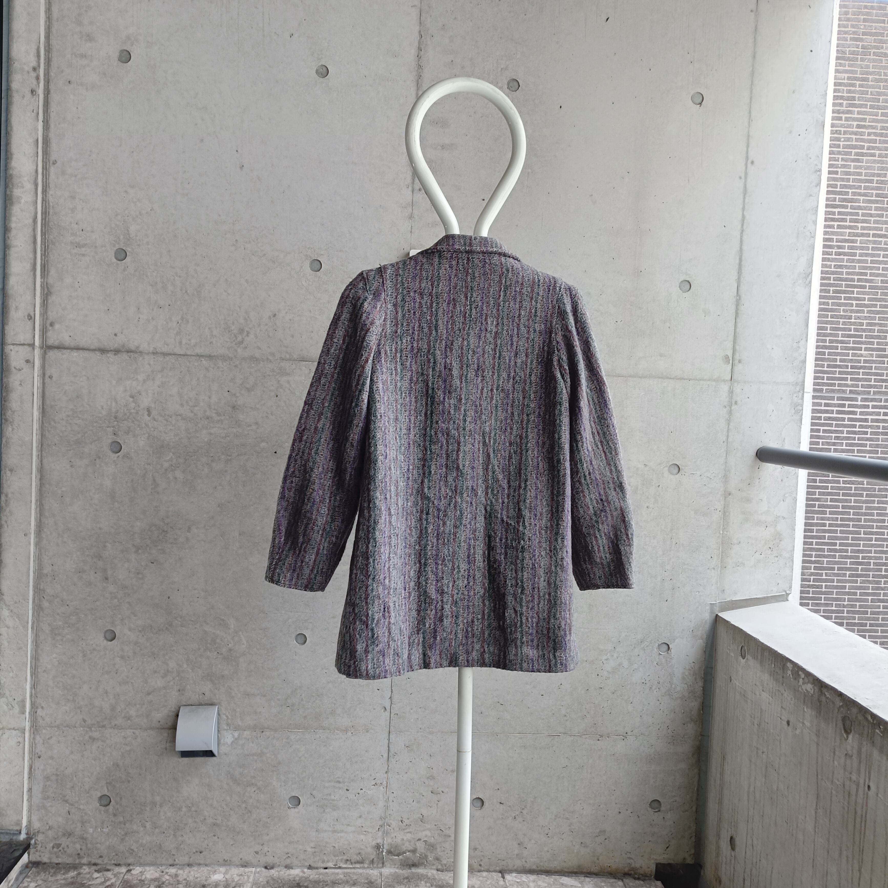 グレーベースにパープル、グリーンのストライプパターン。毛足の長いシャギーウール生地です。ダブルでラペルにループが付いていたり、古着らしいディテール。小柄なメンズ、レディース向けサイズです。