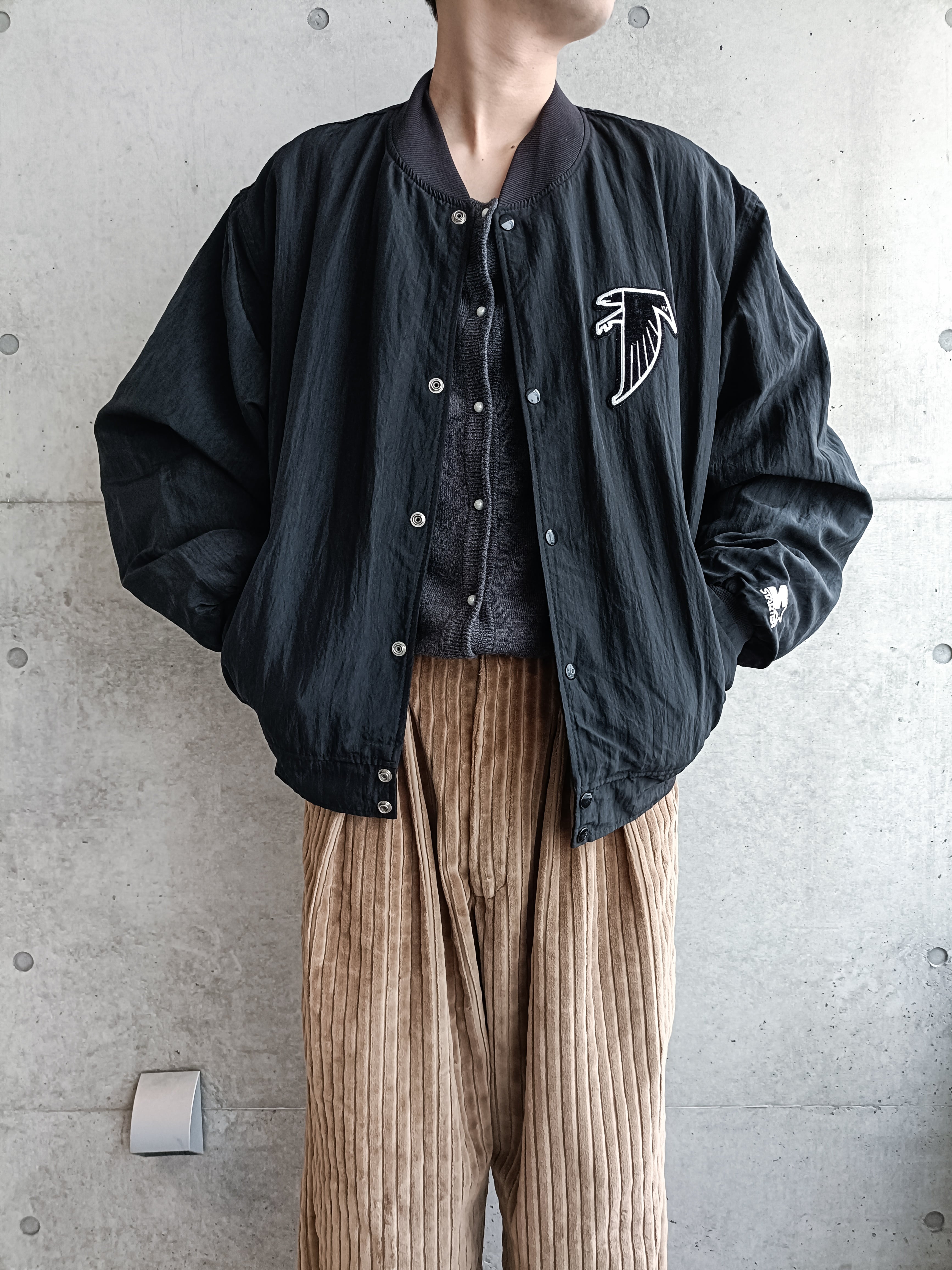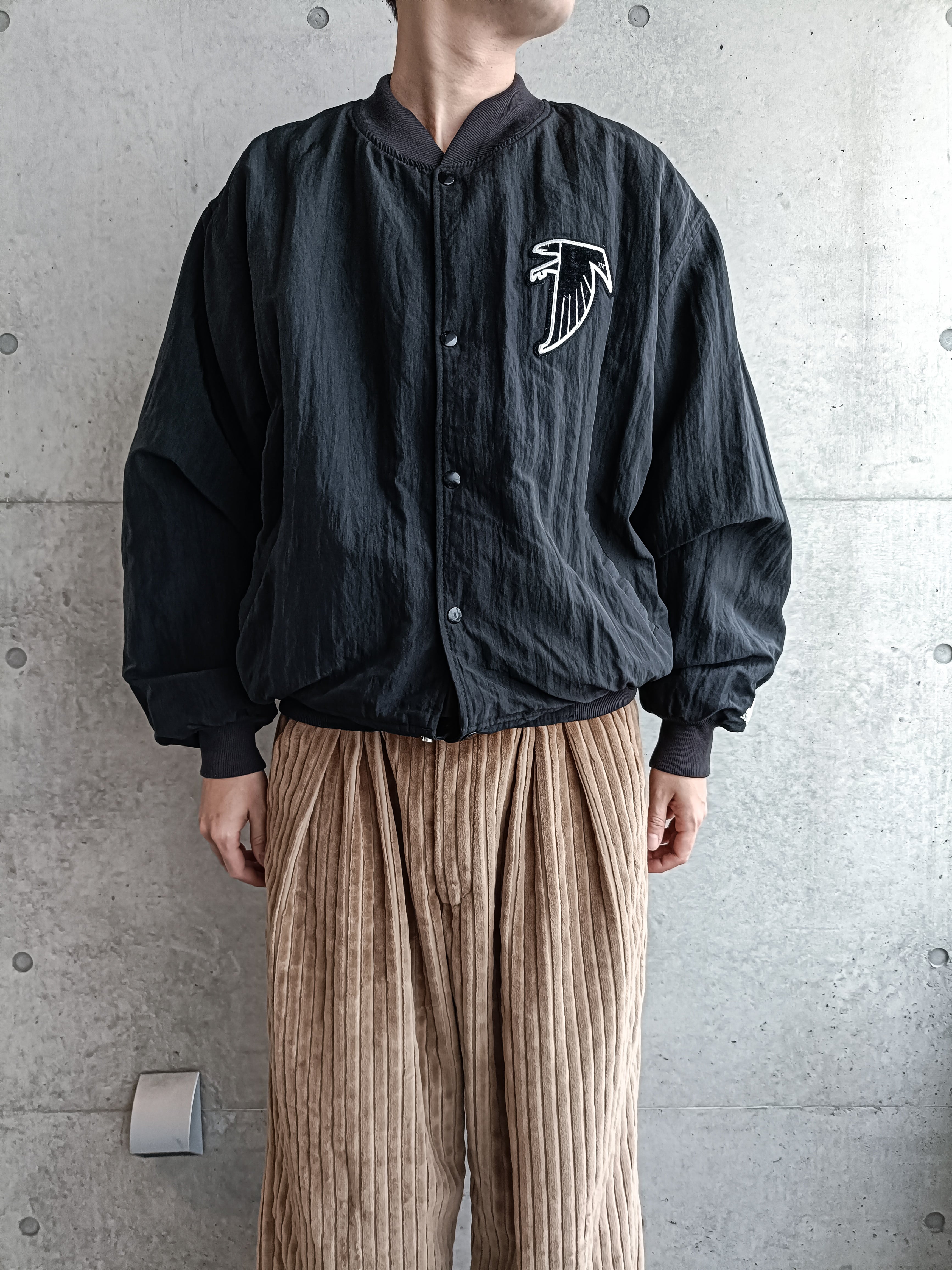 USA製。90s アトランタファルコンズのブルゾン。NFLの黒系の中でもシンプルでトップクラスにカッコイイと思います。ワッペンはベルベット。シワ感のある加工の90sらしい生地です。