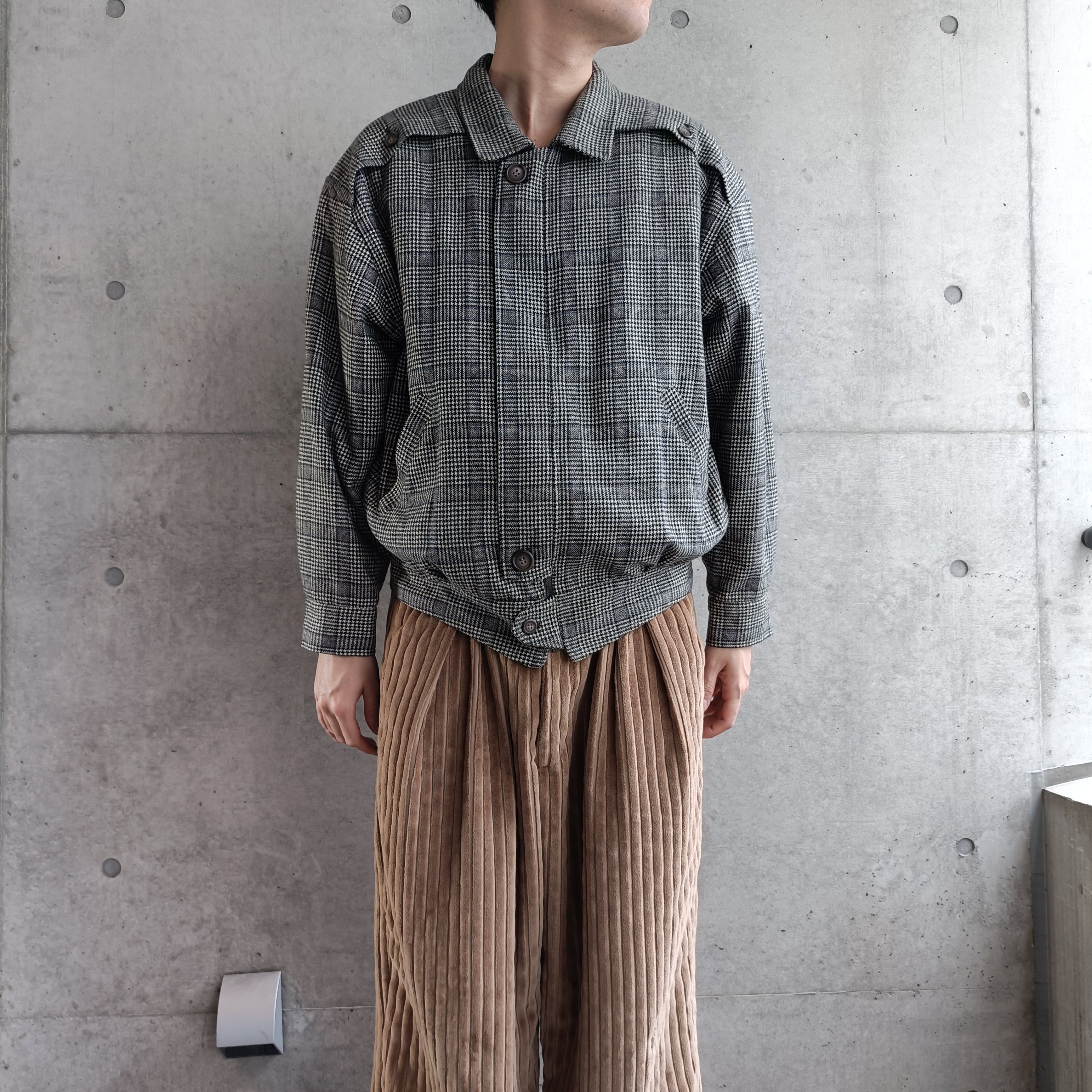 千鳥格子柄のウールブルゾン。勿論、普通の千鳥格子のブルゾンは入荷しません。裾が波型のようなカーブを描いたカッティングパターン。前たてフラップも裾だけ分離してます。フロントヨーク部分もフラップパターン。ギミック感ある千鳥格子のブルゾンです。