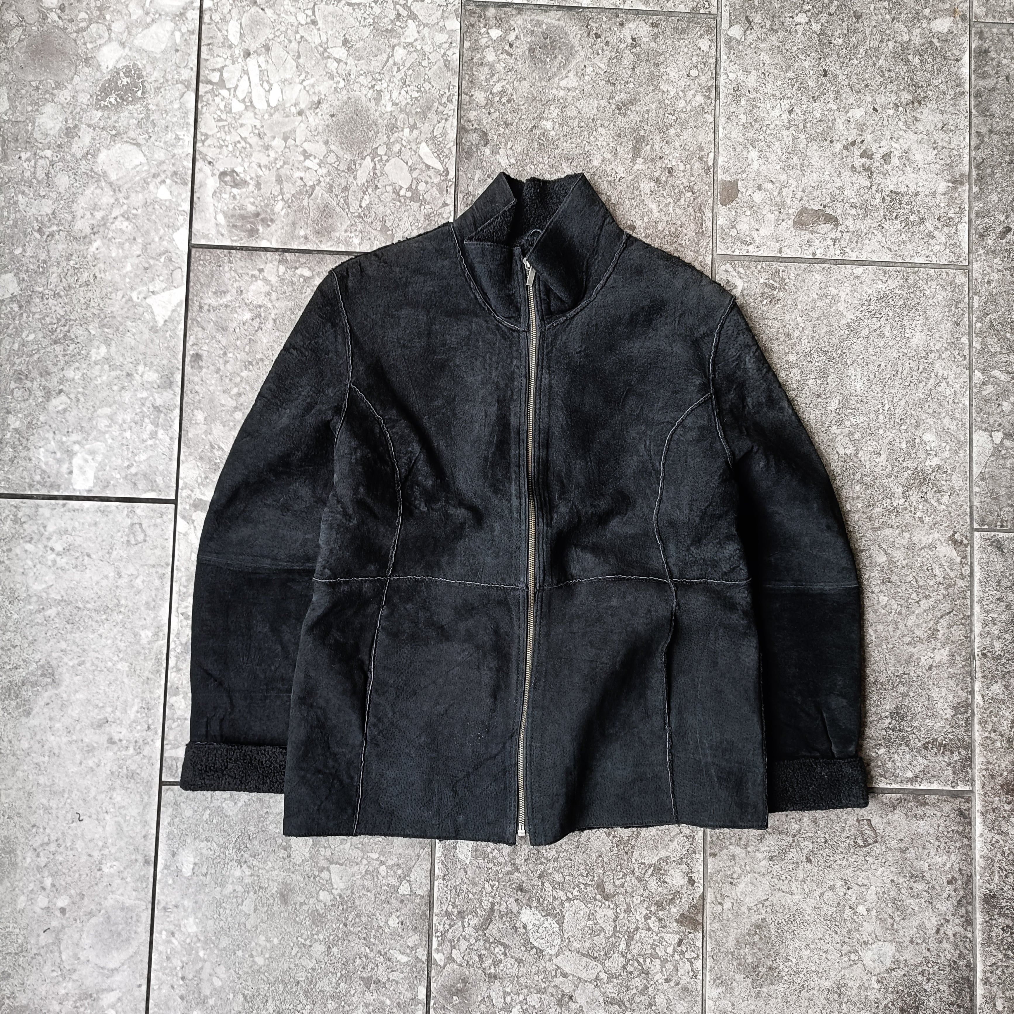 レザーでインサイドアウト仕様という珍しいデザイン。ヌバックレザーです。トラックジャケットのような形。しっかり手を突っ込めるポケット付き。小柄なメンズ、レディース向けサイズです。