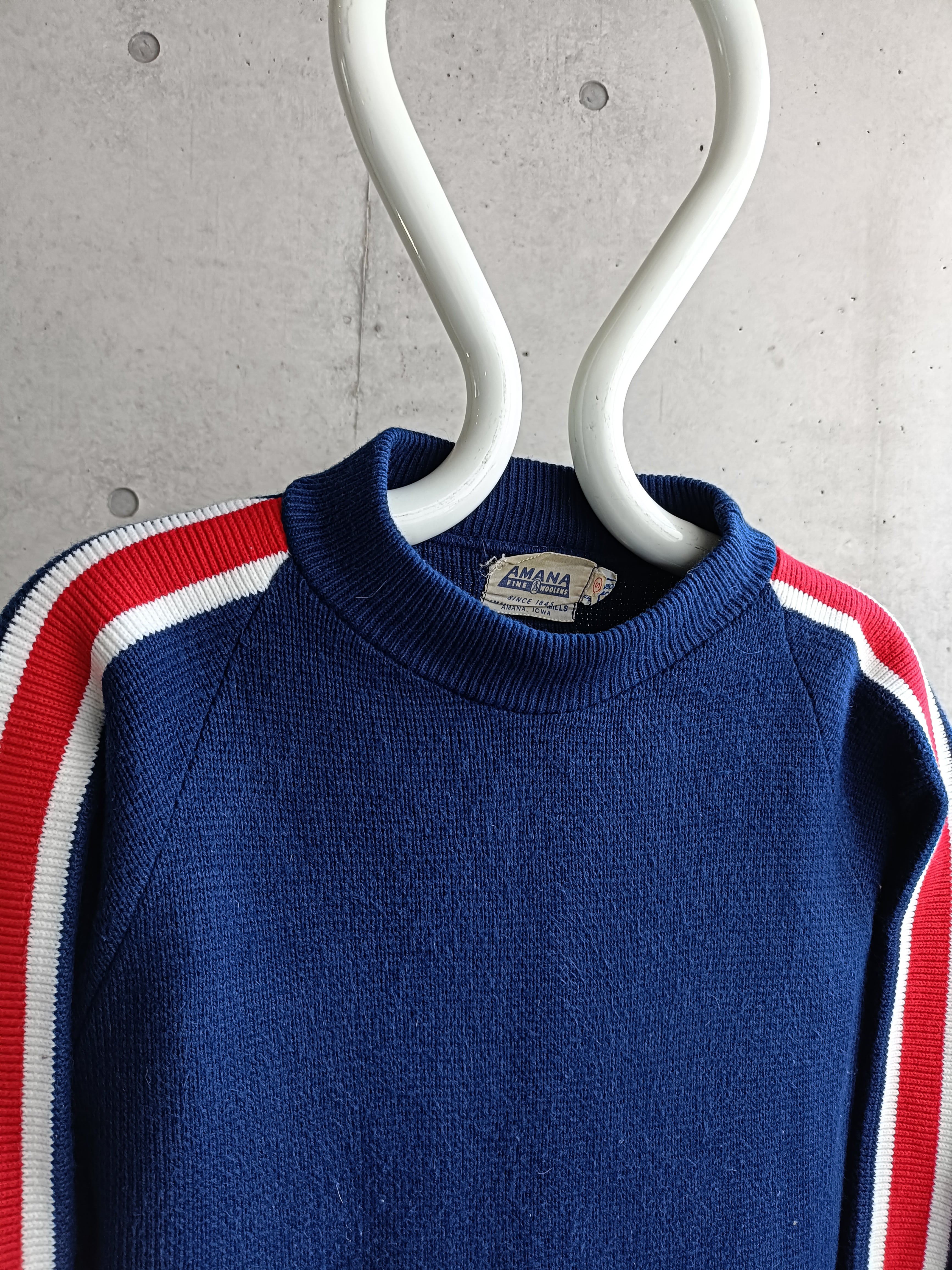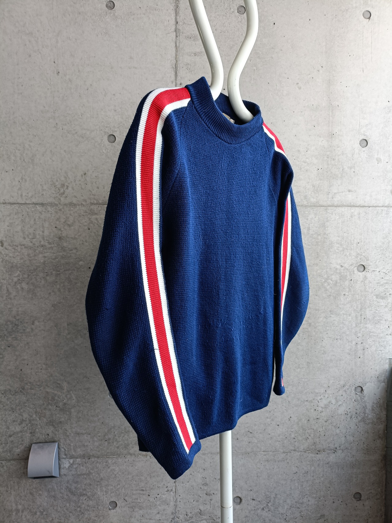 80s頃のニット。トリコロールカラー。ニットで珍しい前振り袖。身幅広め。人気は無さそうですが、個人的にも好きで、気になるファッション玄人な方がいてくれたら嬉しいニットです。
